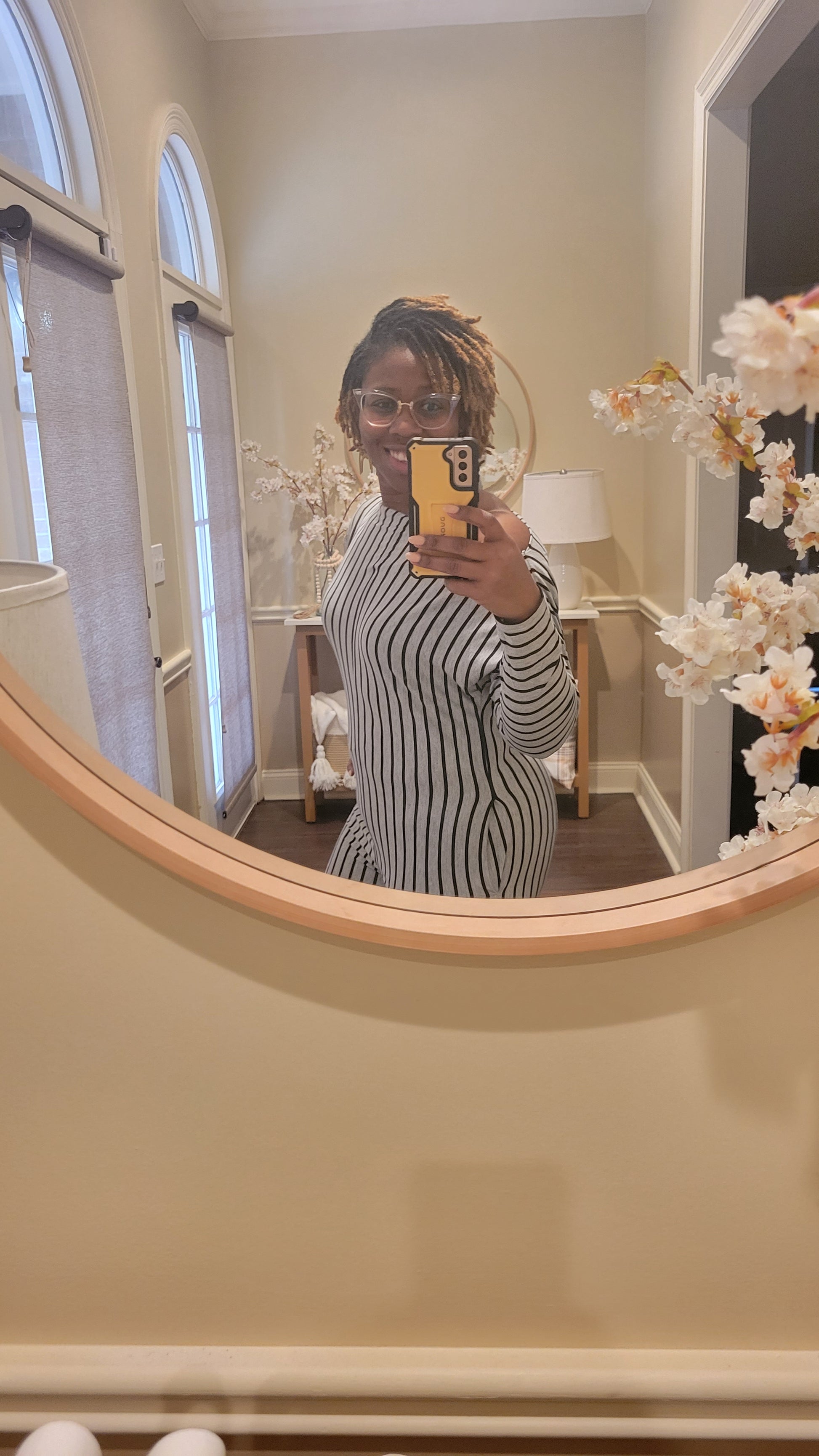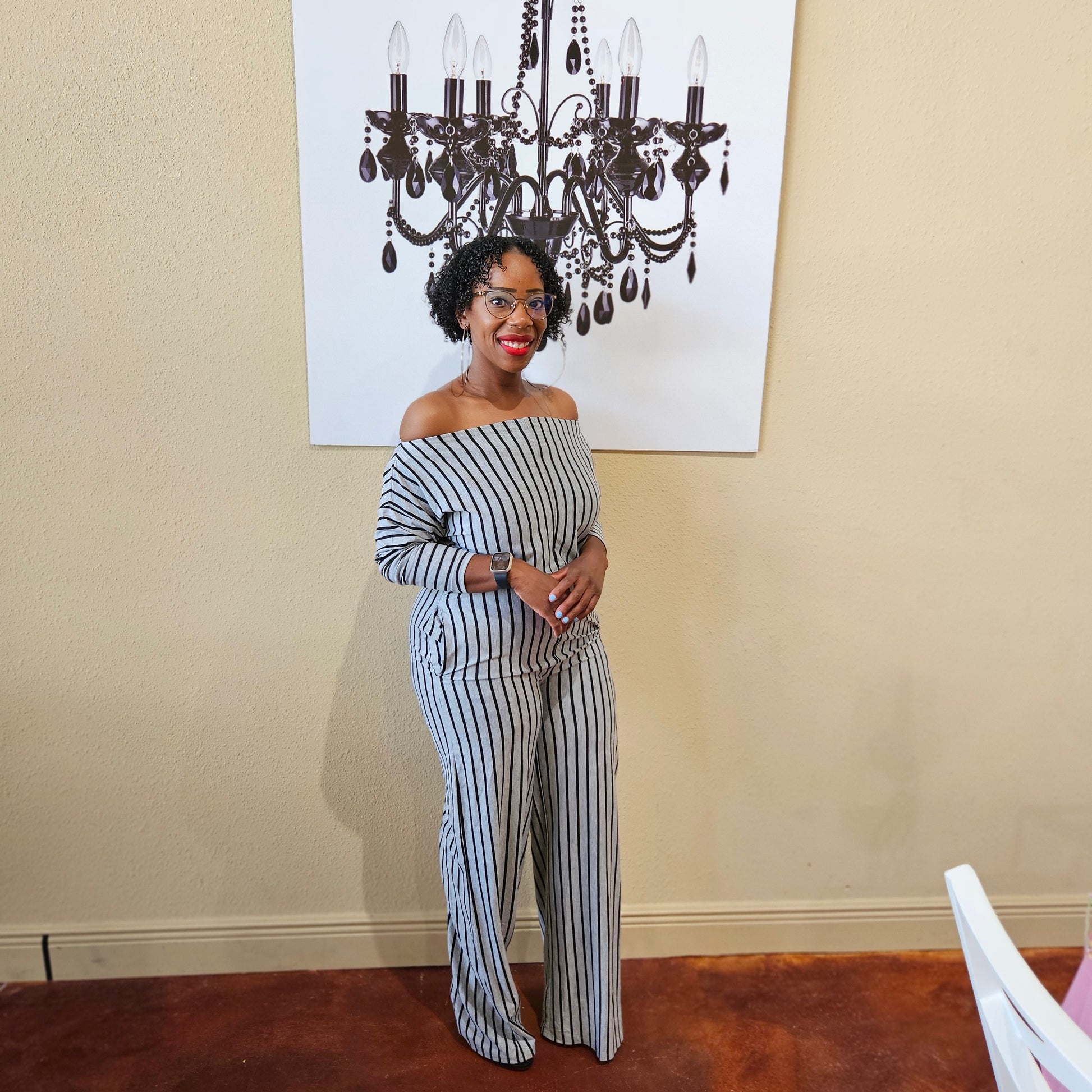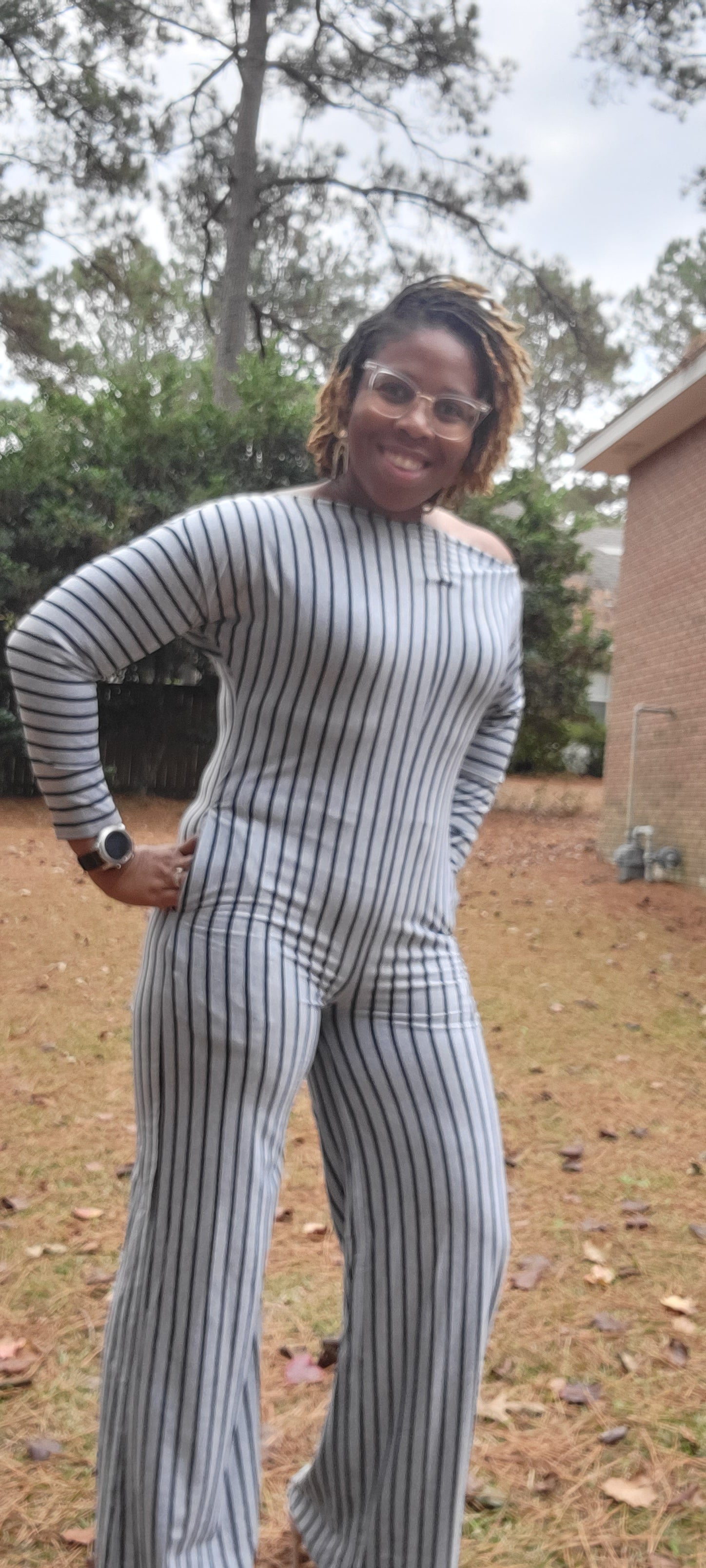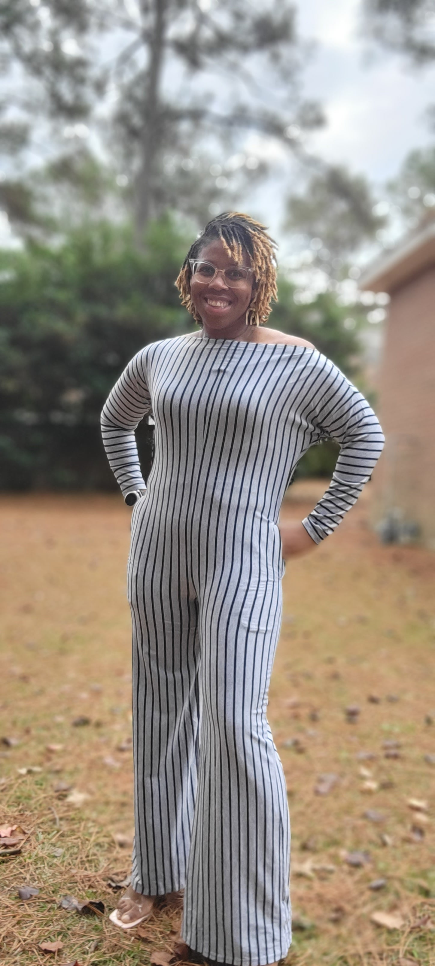 This comfy jumpsuit has a striped style and features off-the-shoulder sleeves with pockets.