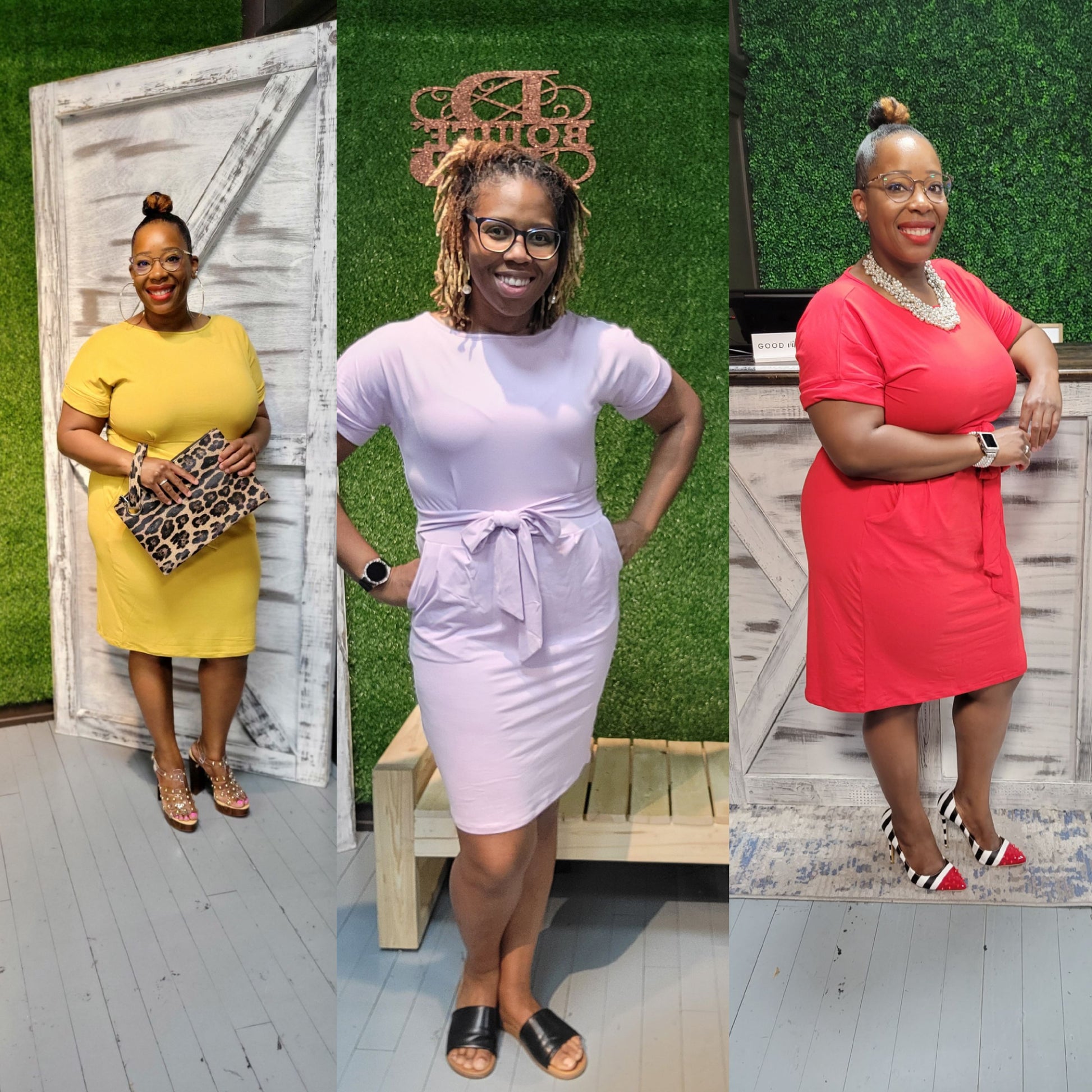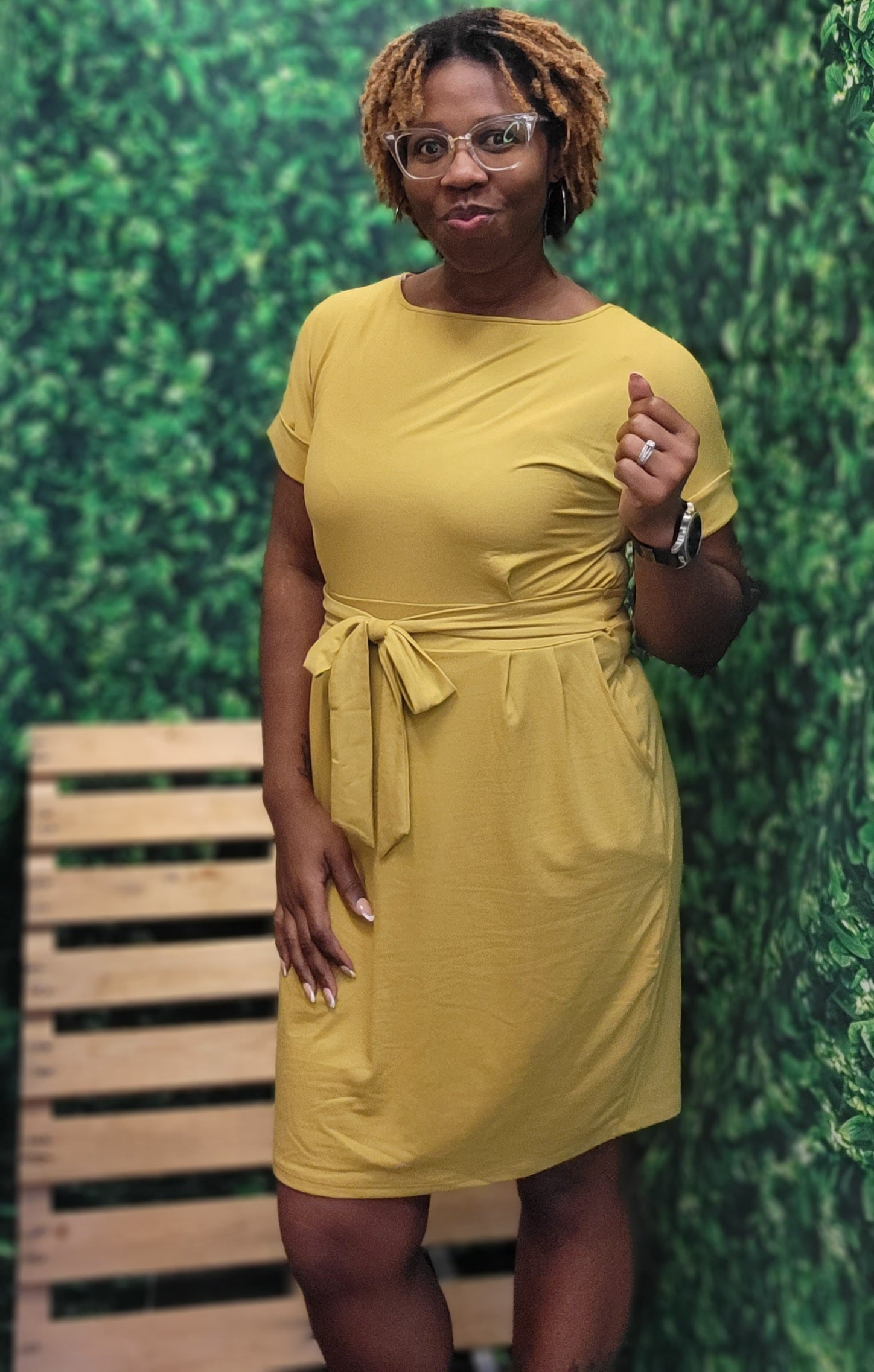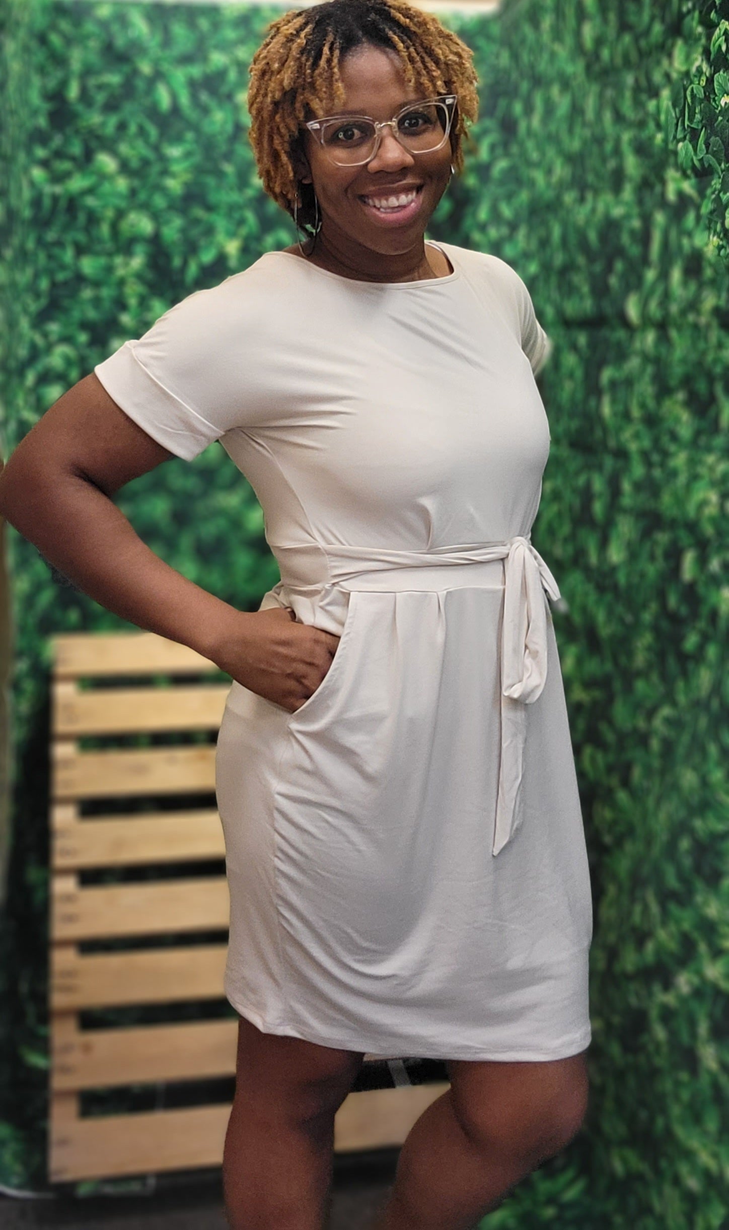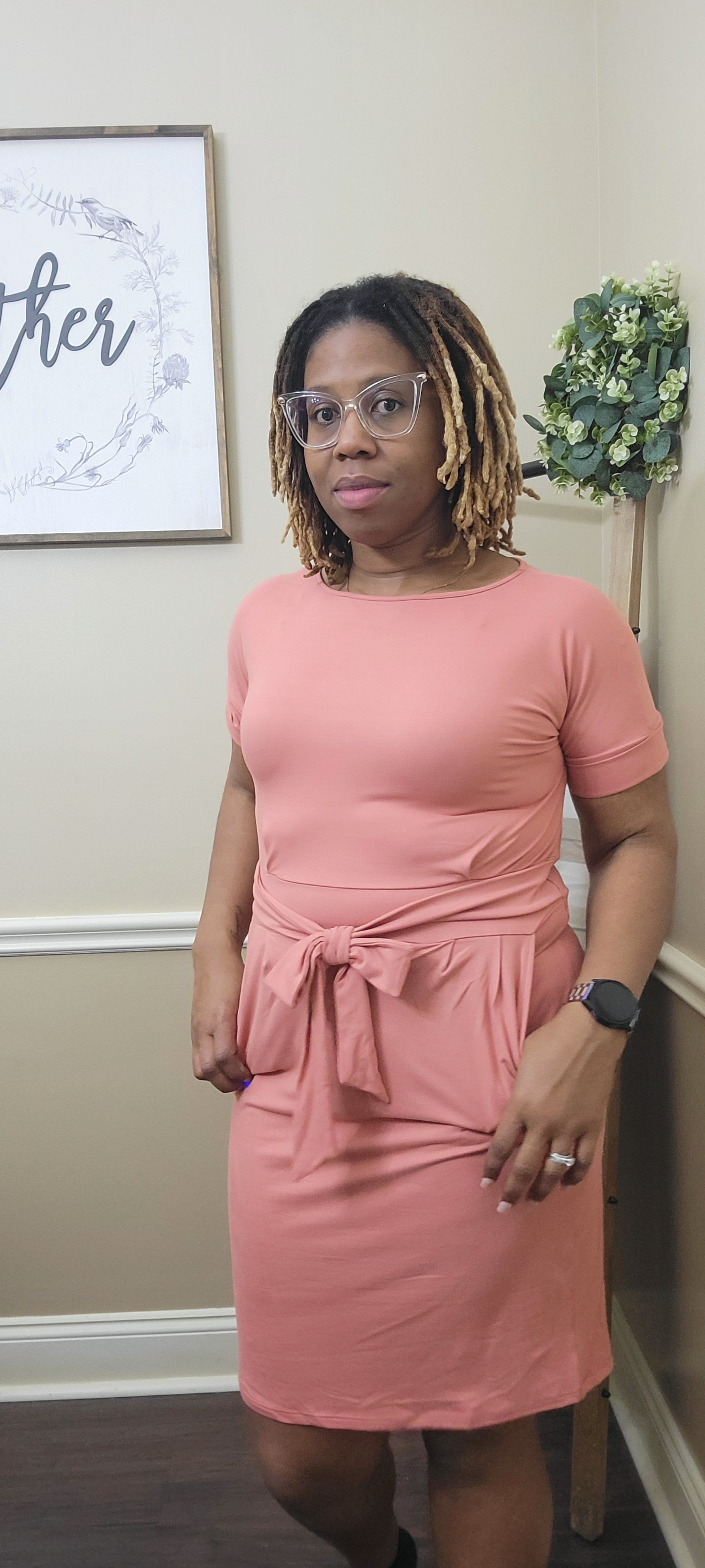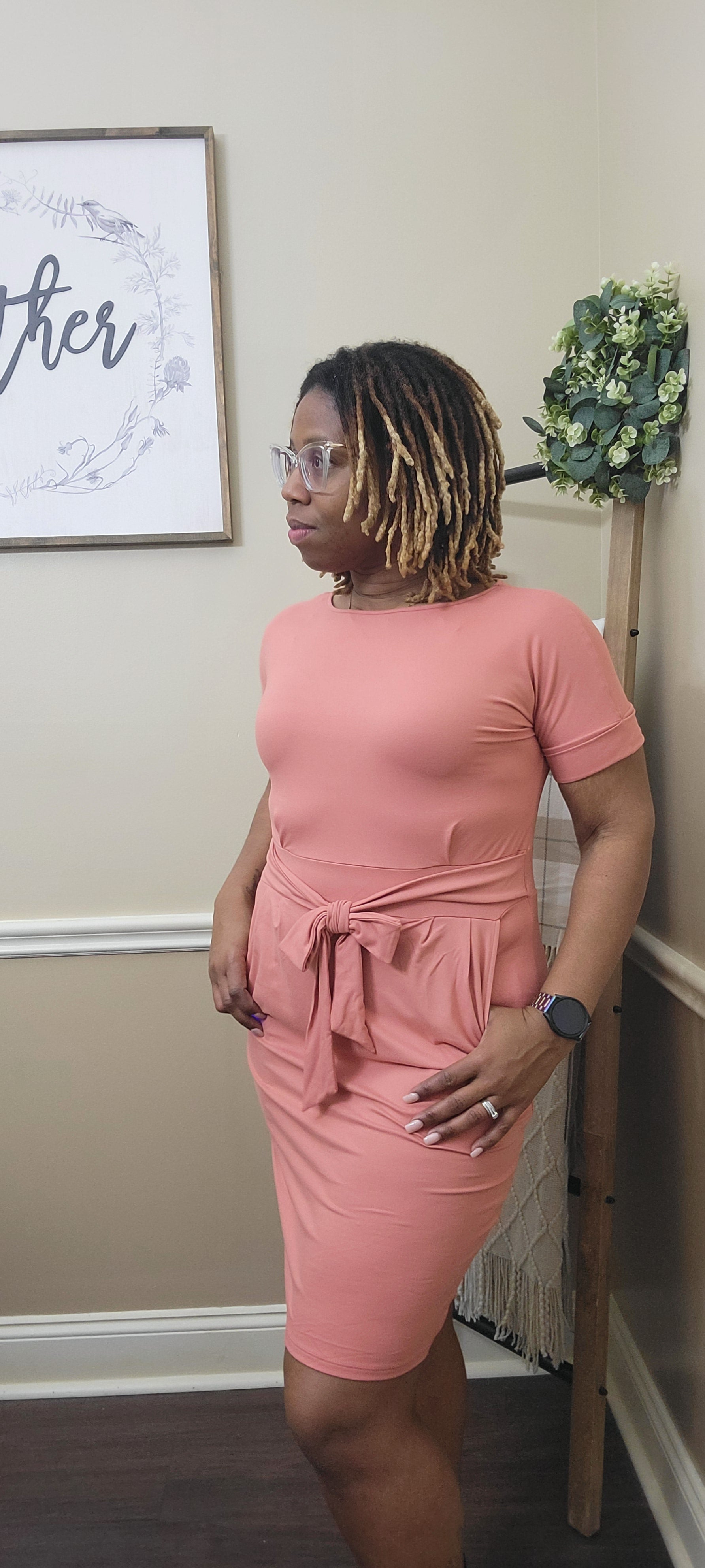 This round-neck, self-tie dress offers a perfect blend of casual and dressy style, and includes convenient pockets.