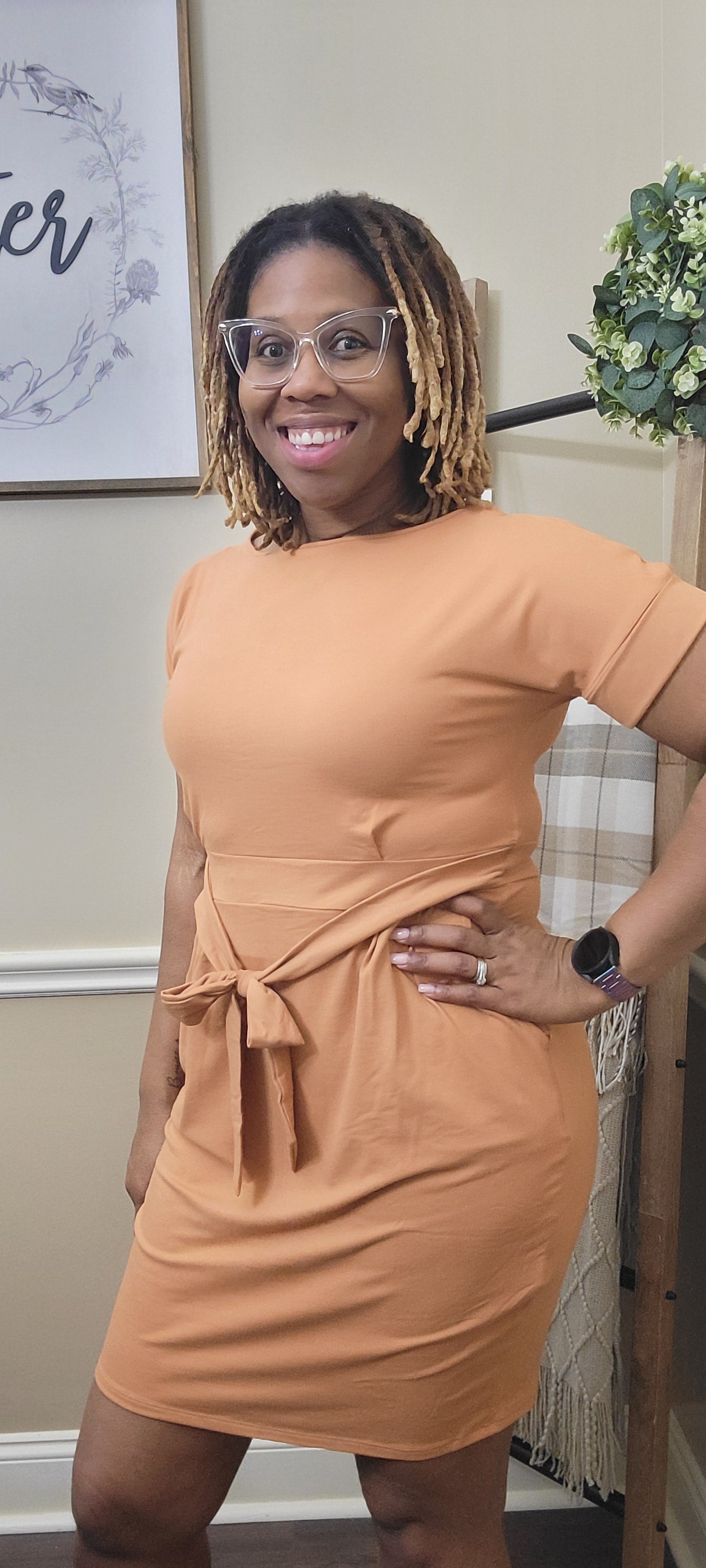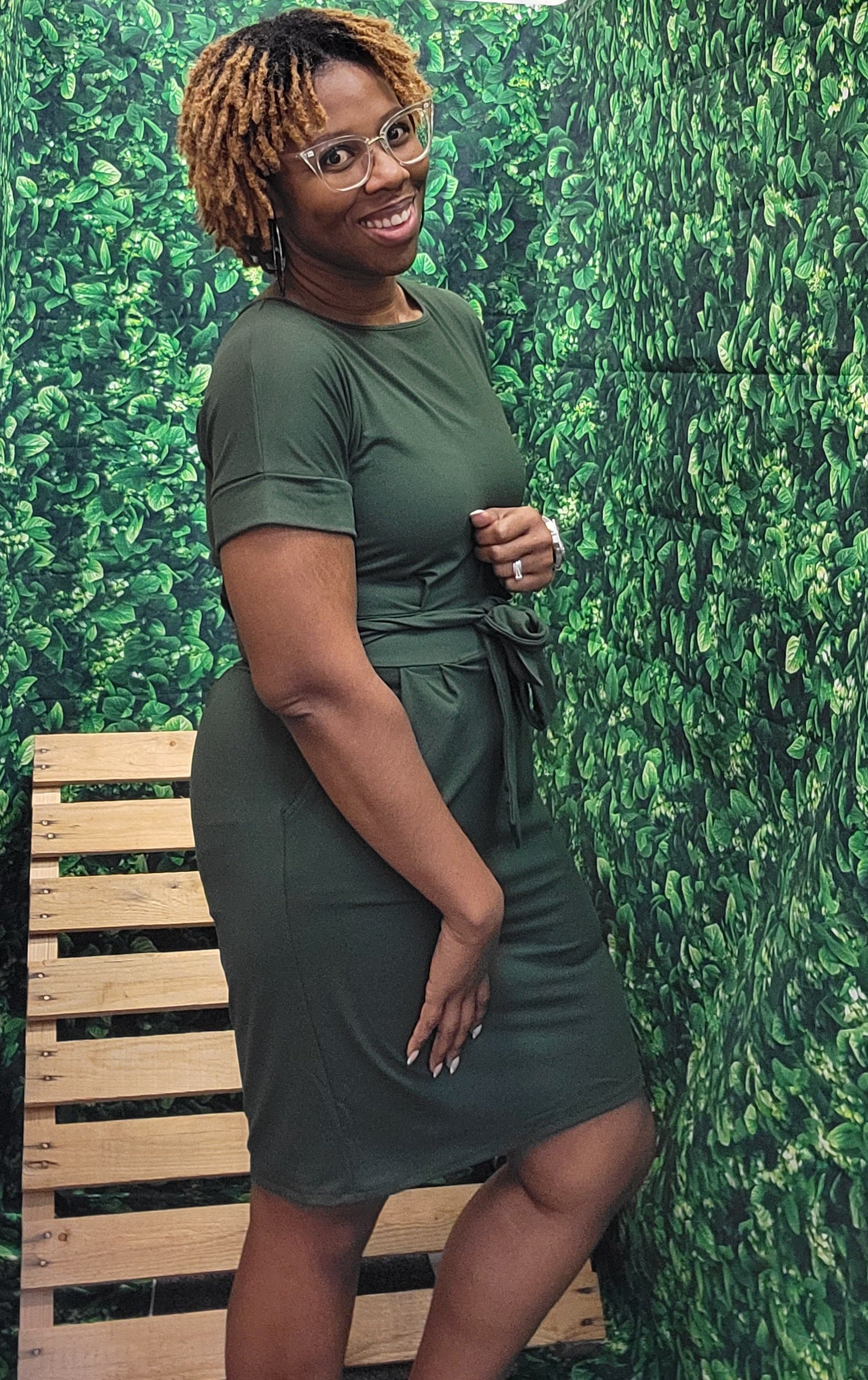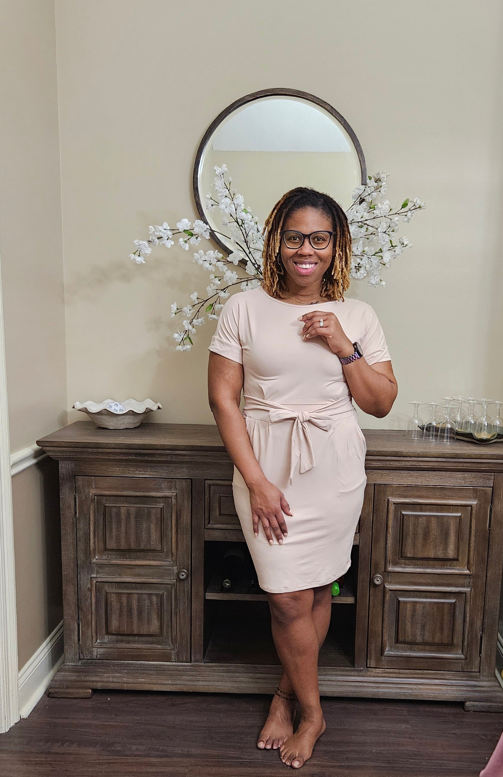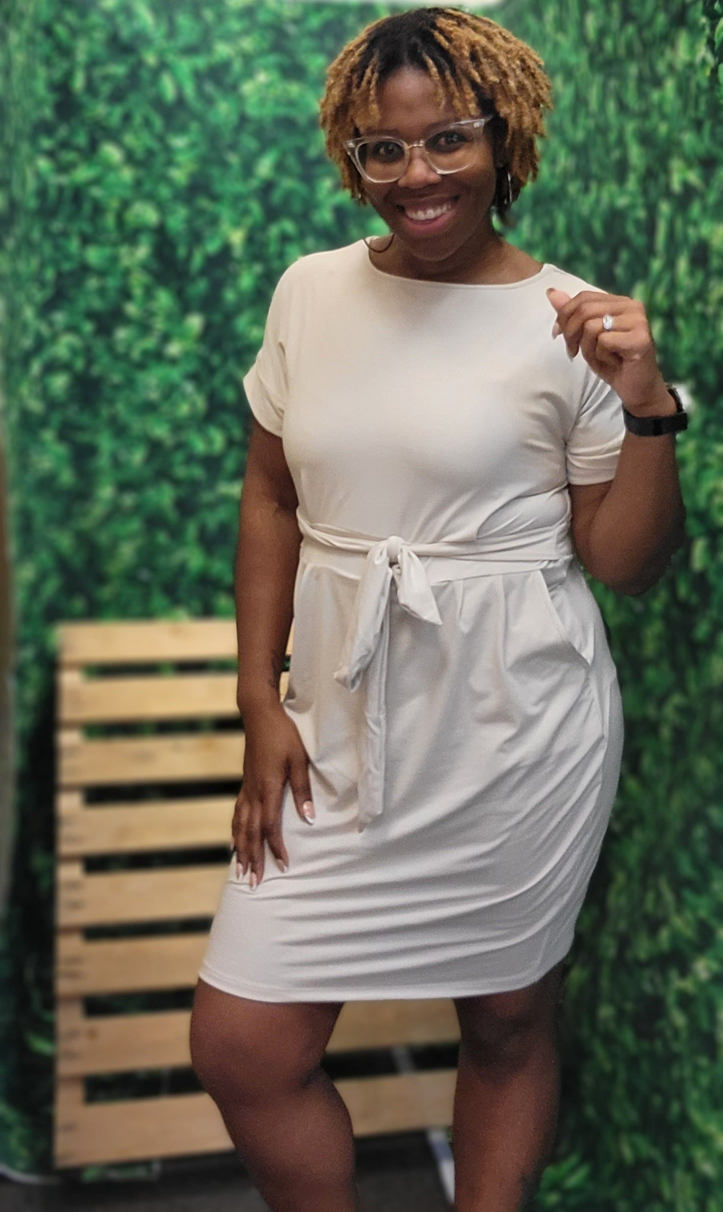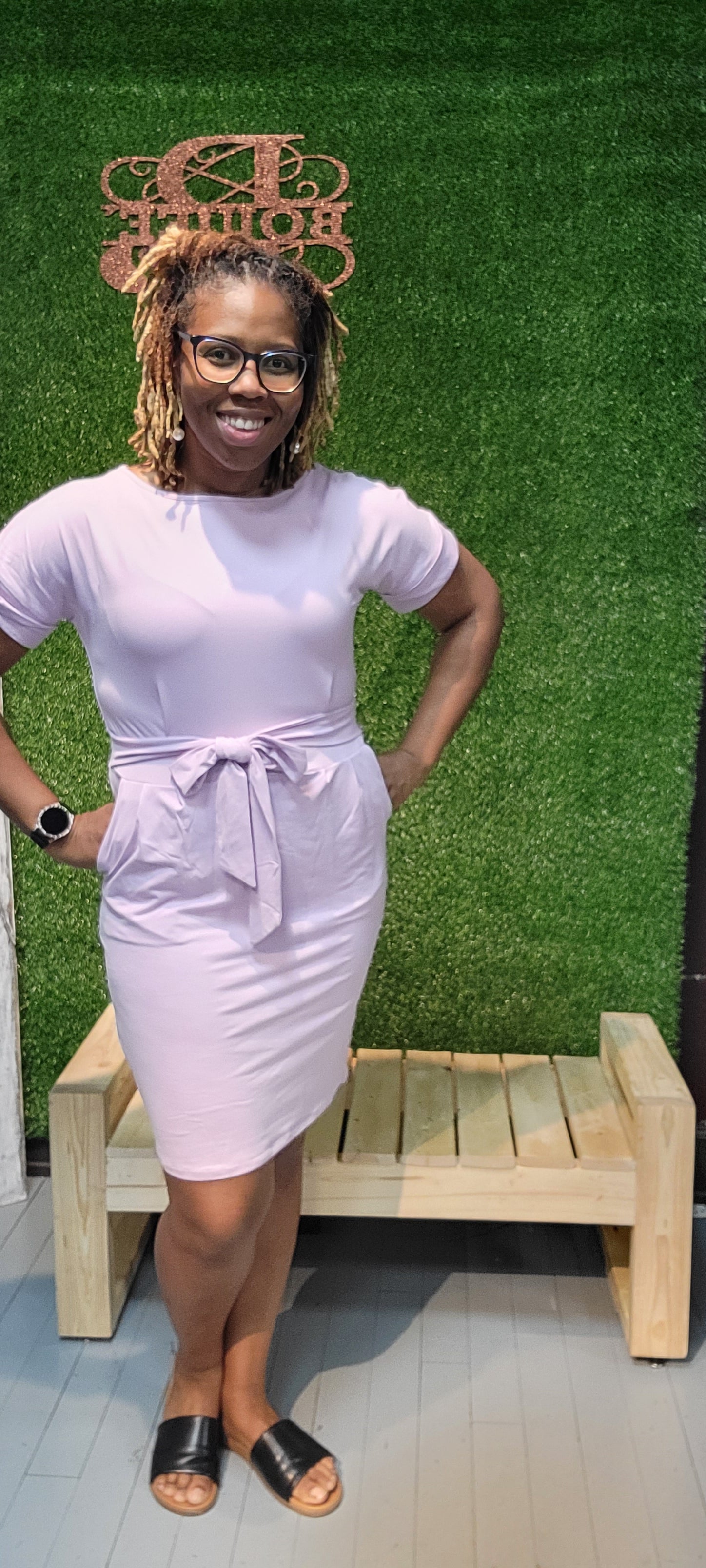 This round-neck, self-tie dress offers a perfect blend of casual and dressy style, and includes convenient pockets.