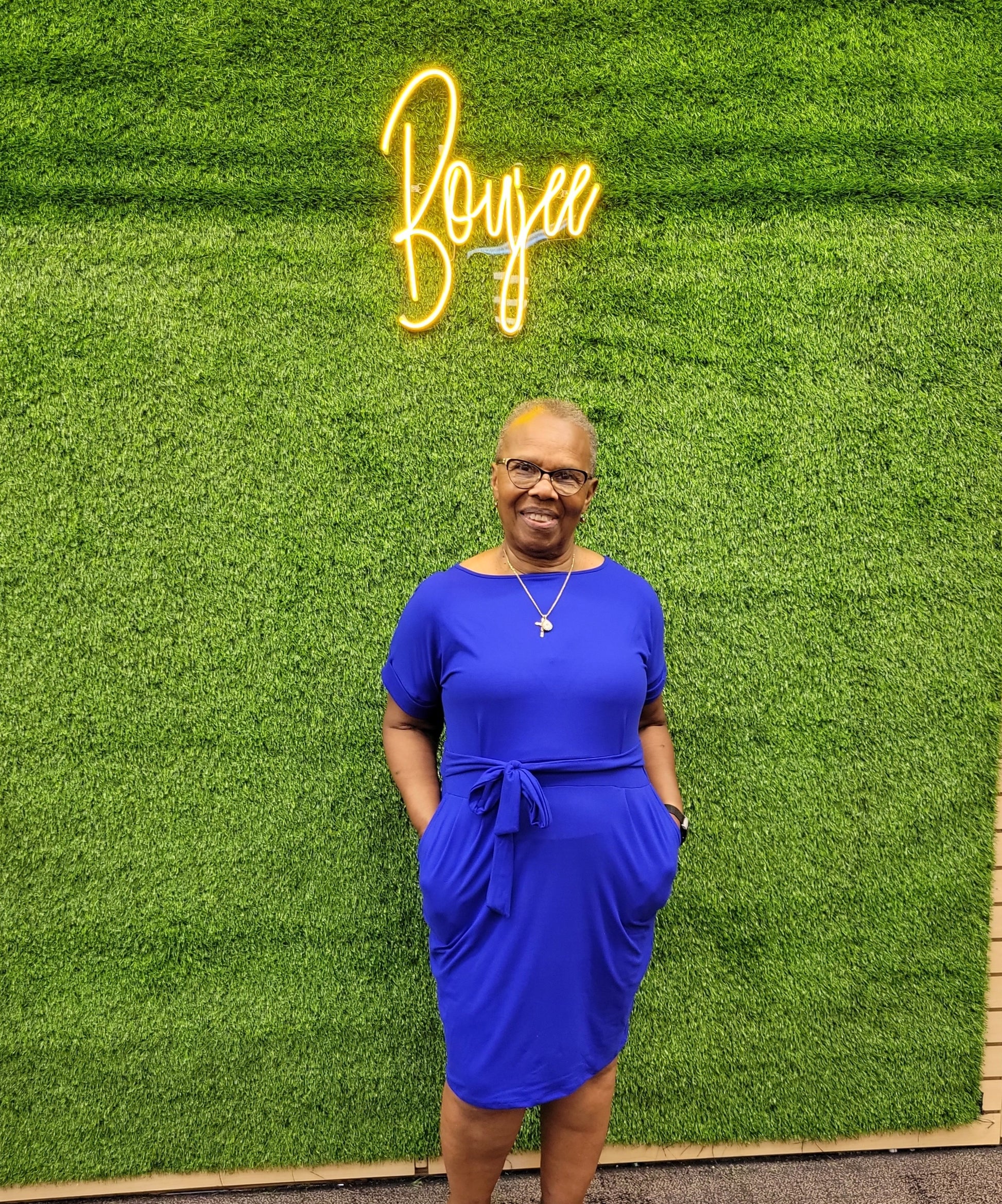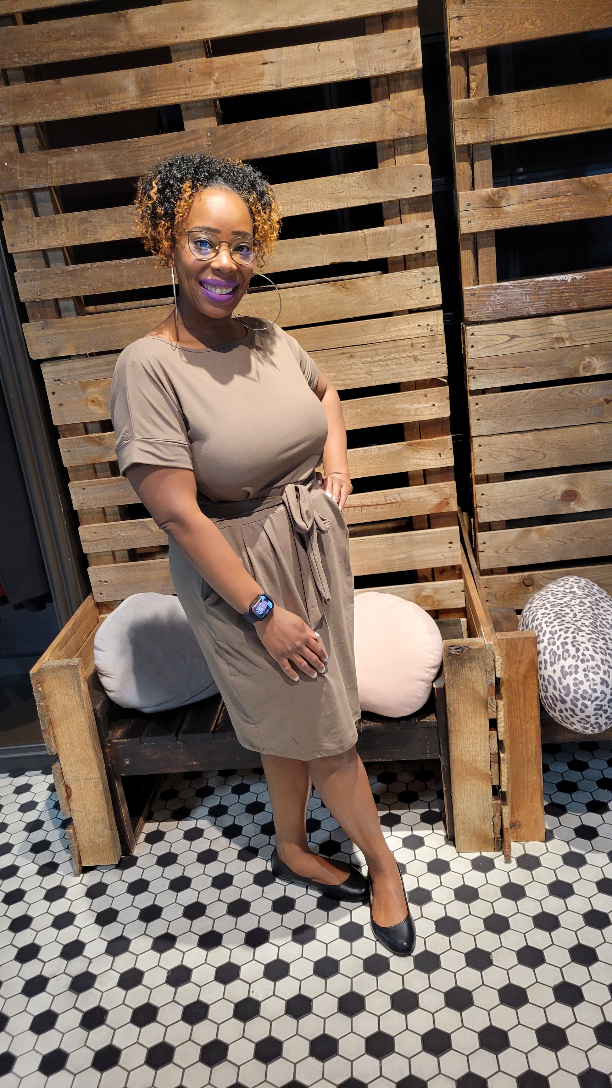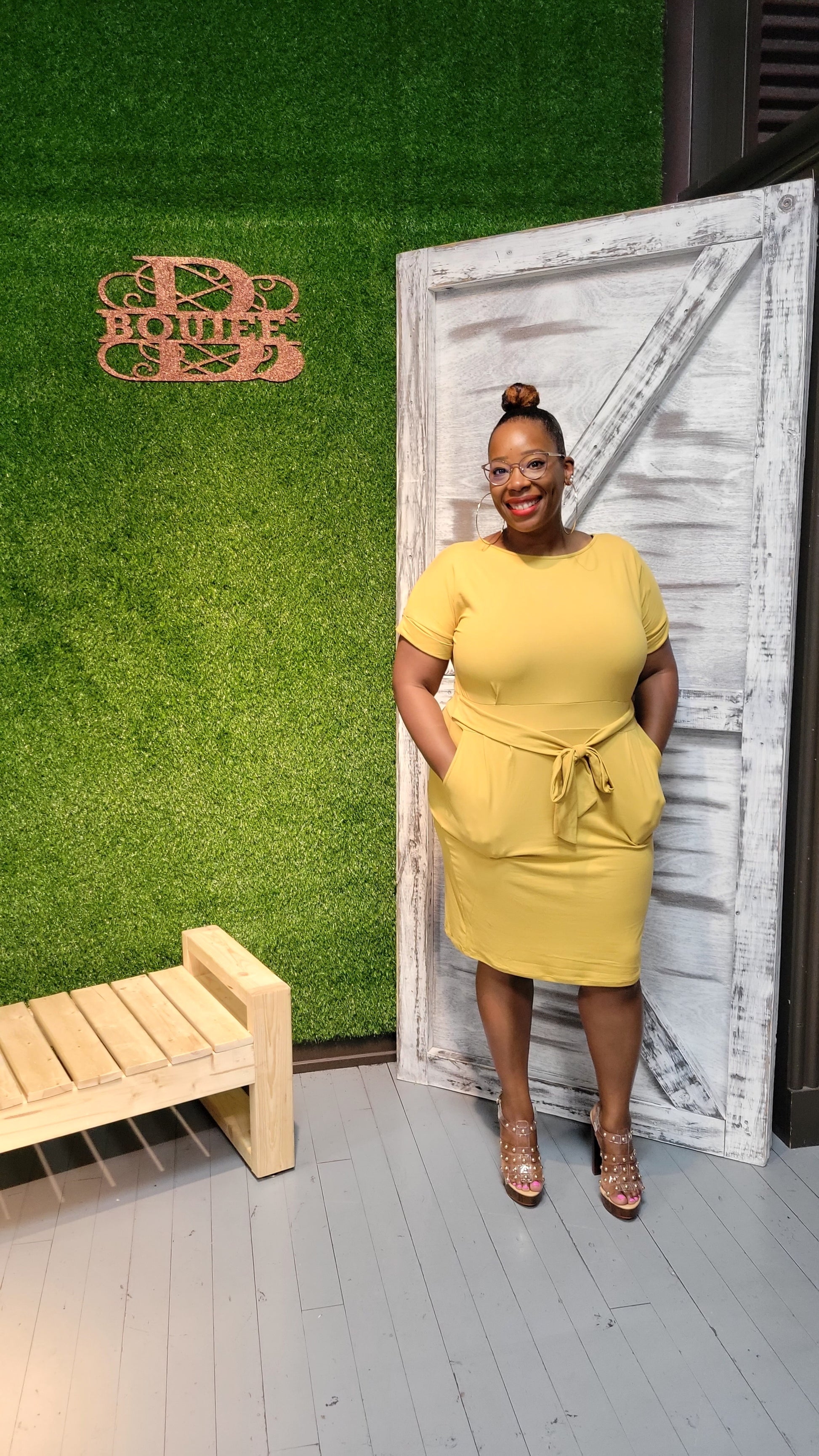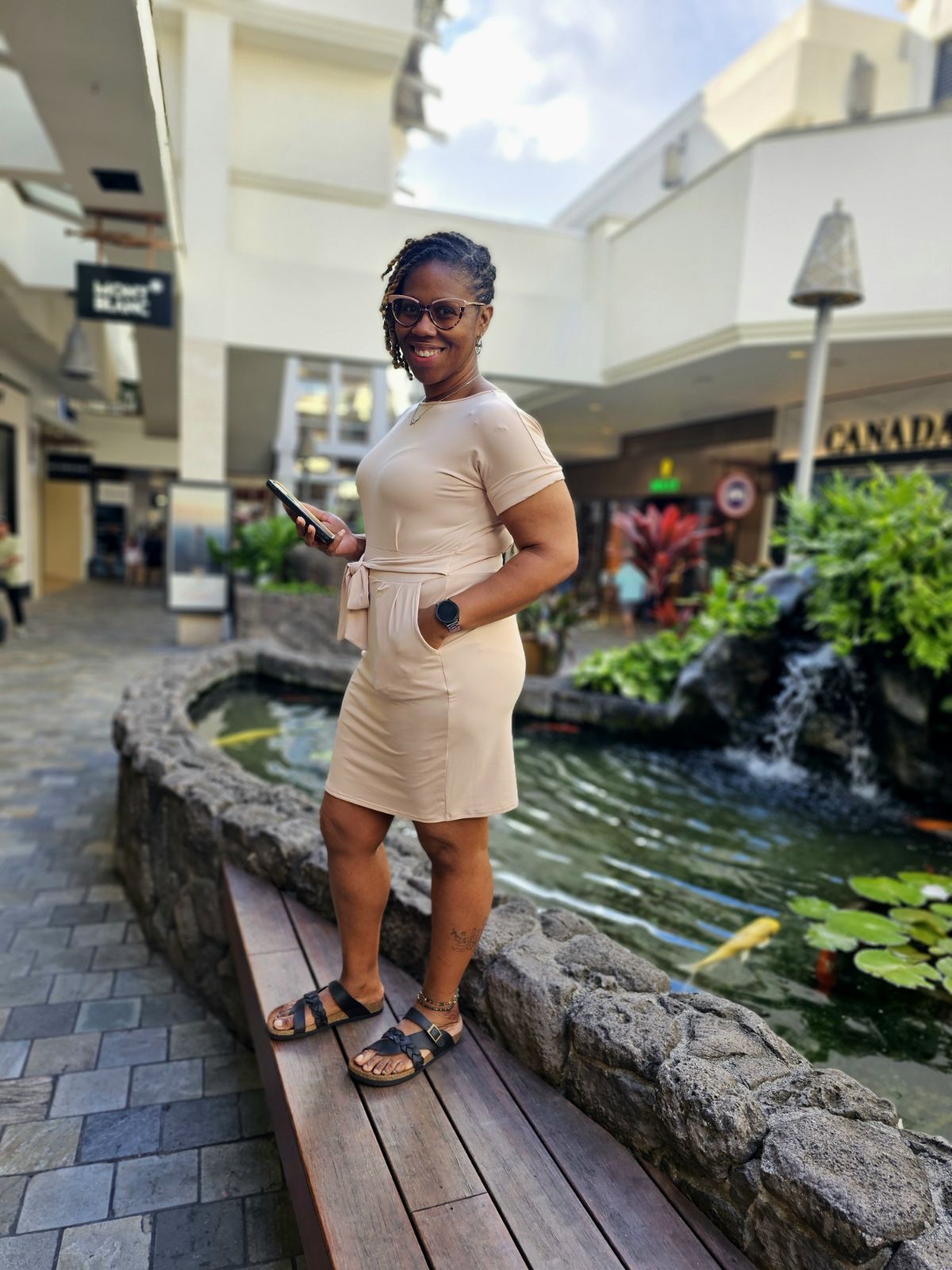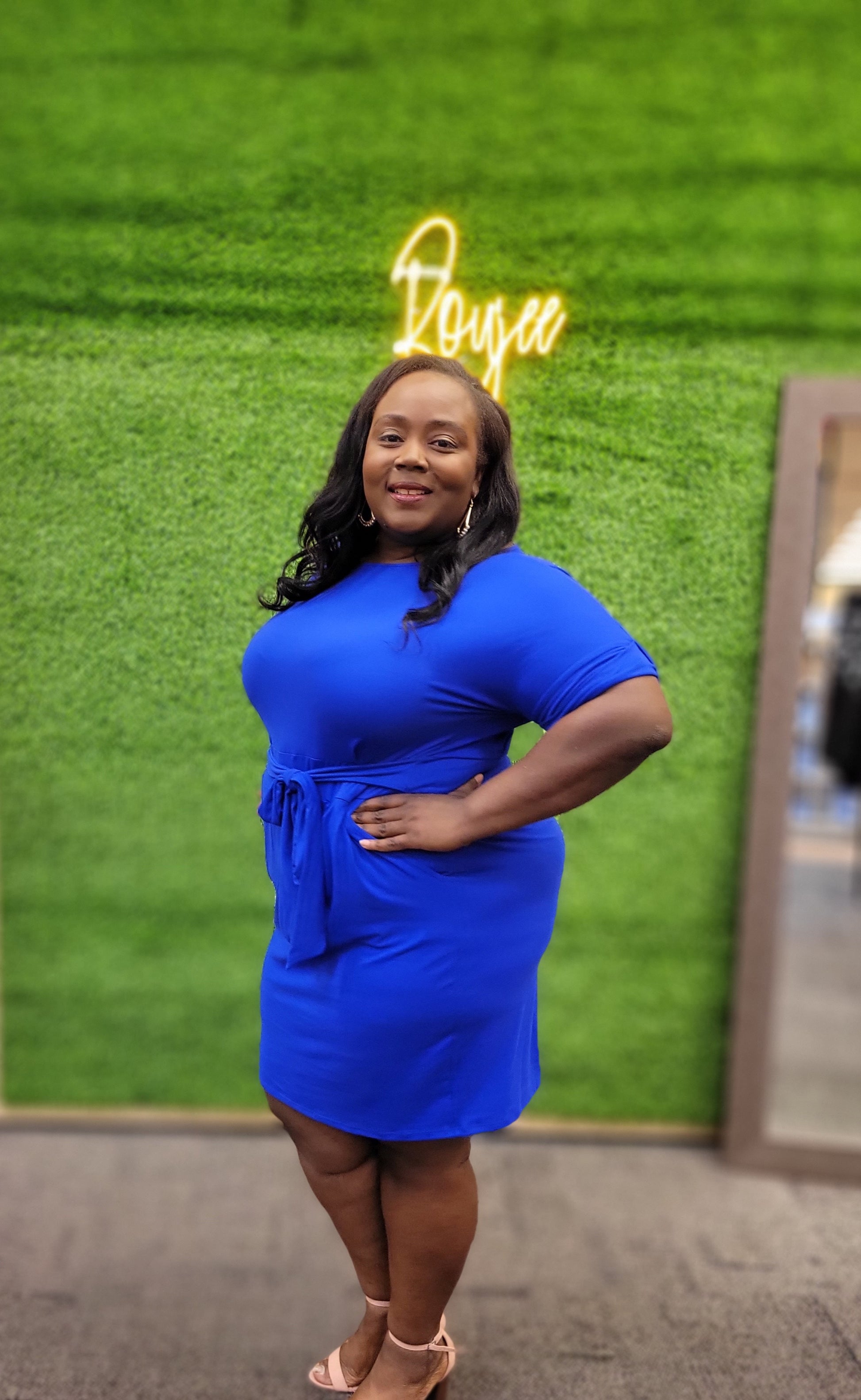 This round-neck, self-tie dress offers a perfect blend of casual and dressy style, and includes convenient pockets.