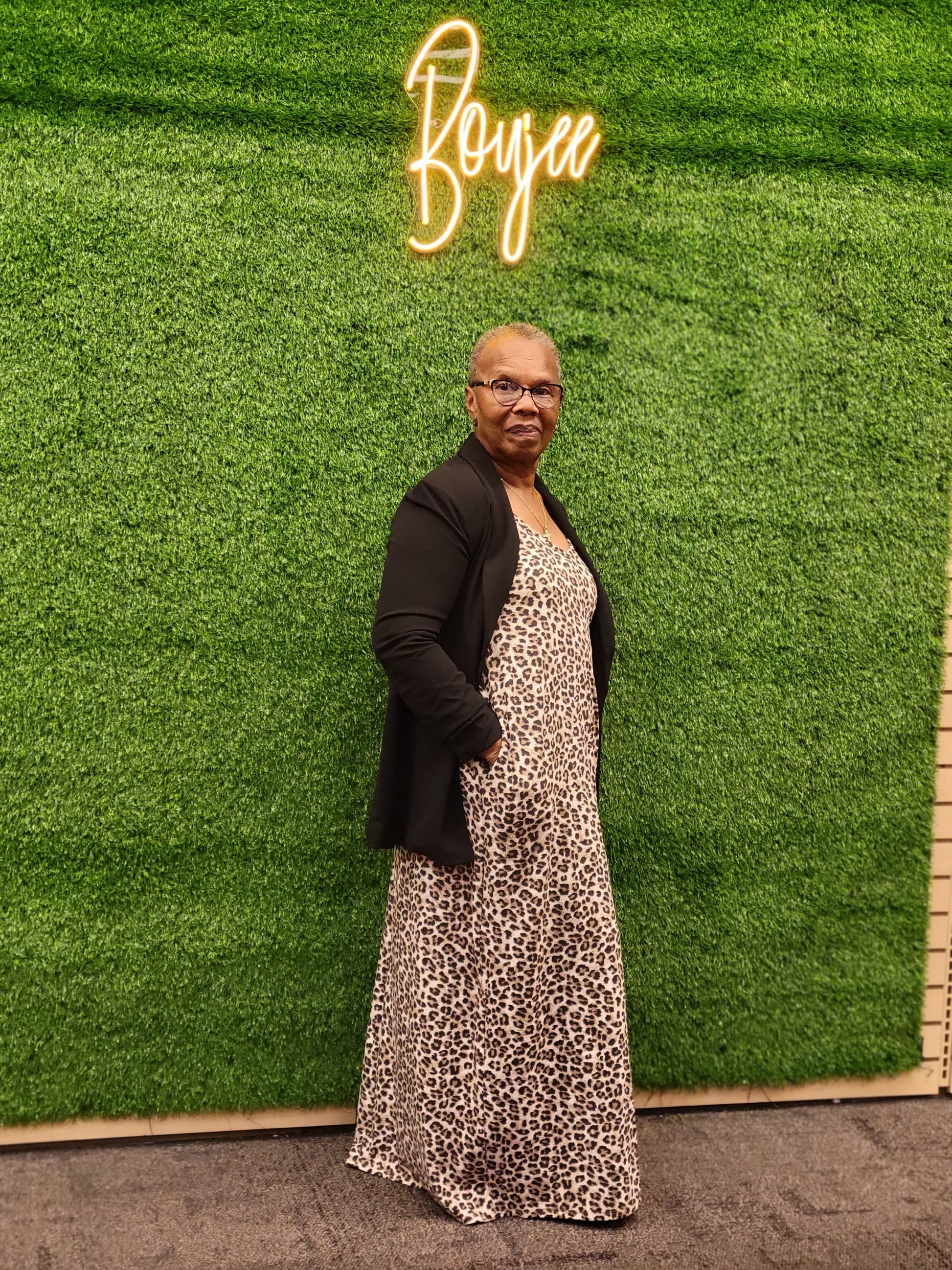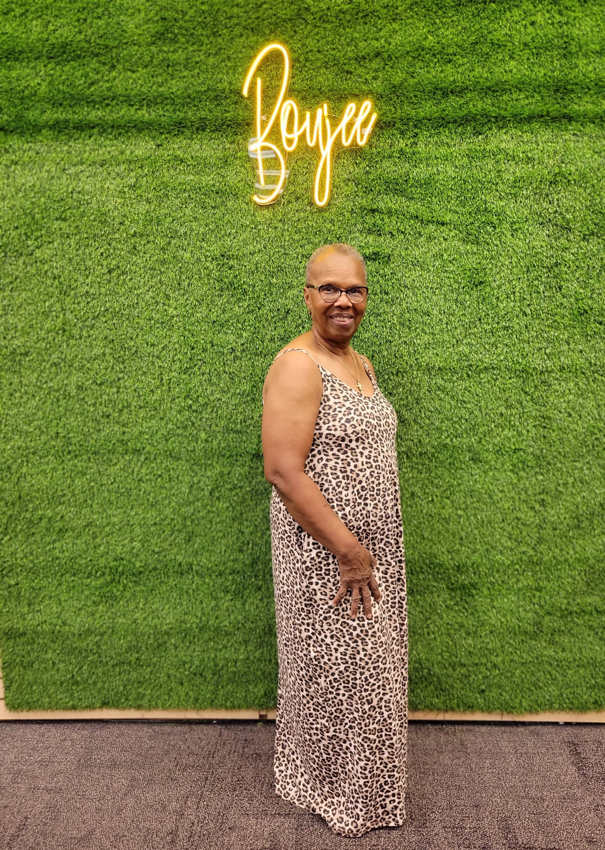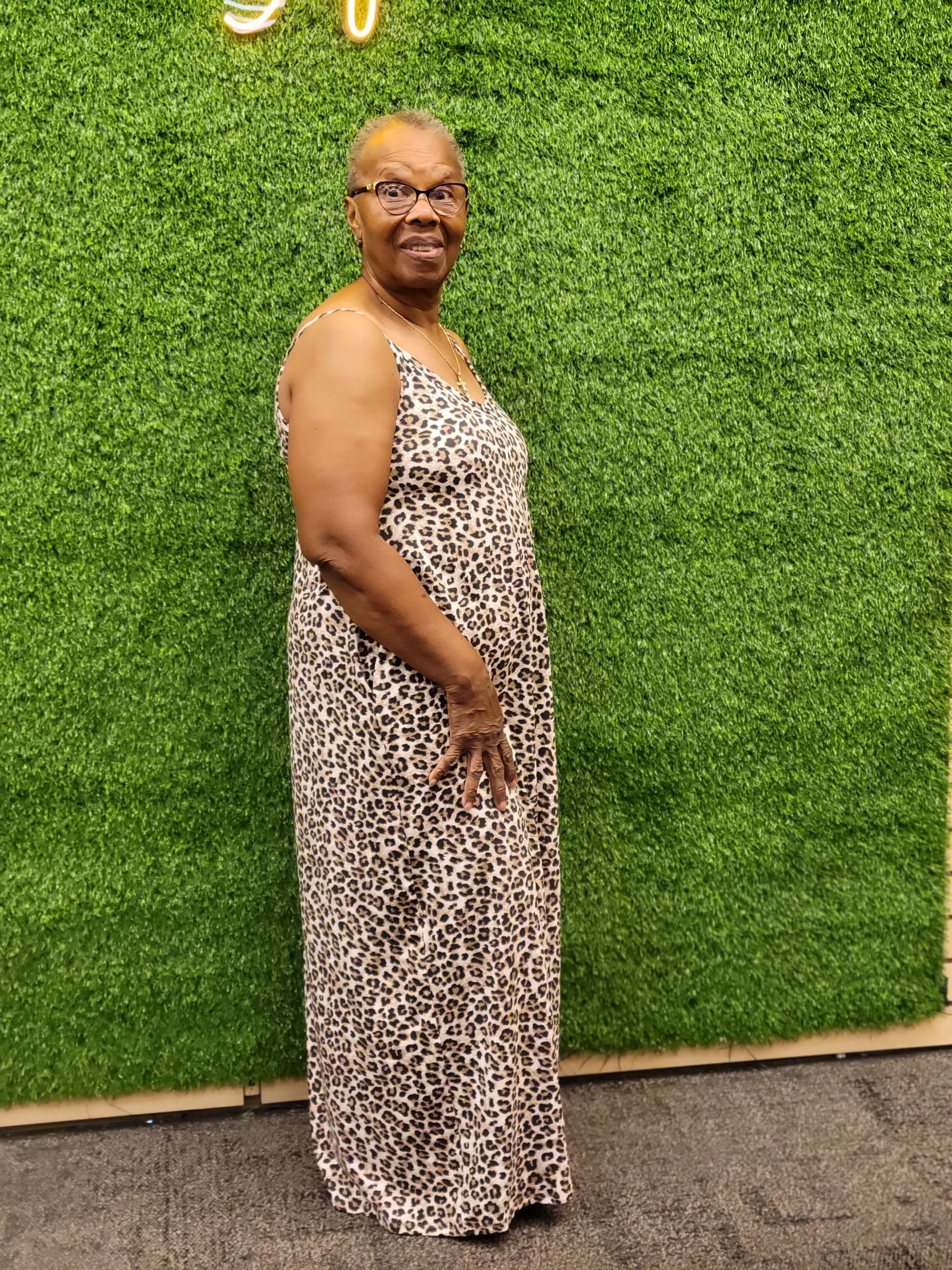Featuring a classic V neckline and adorned with a sophisticated leopard print, this maxi dress exudes luxury and elegance.