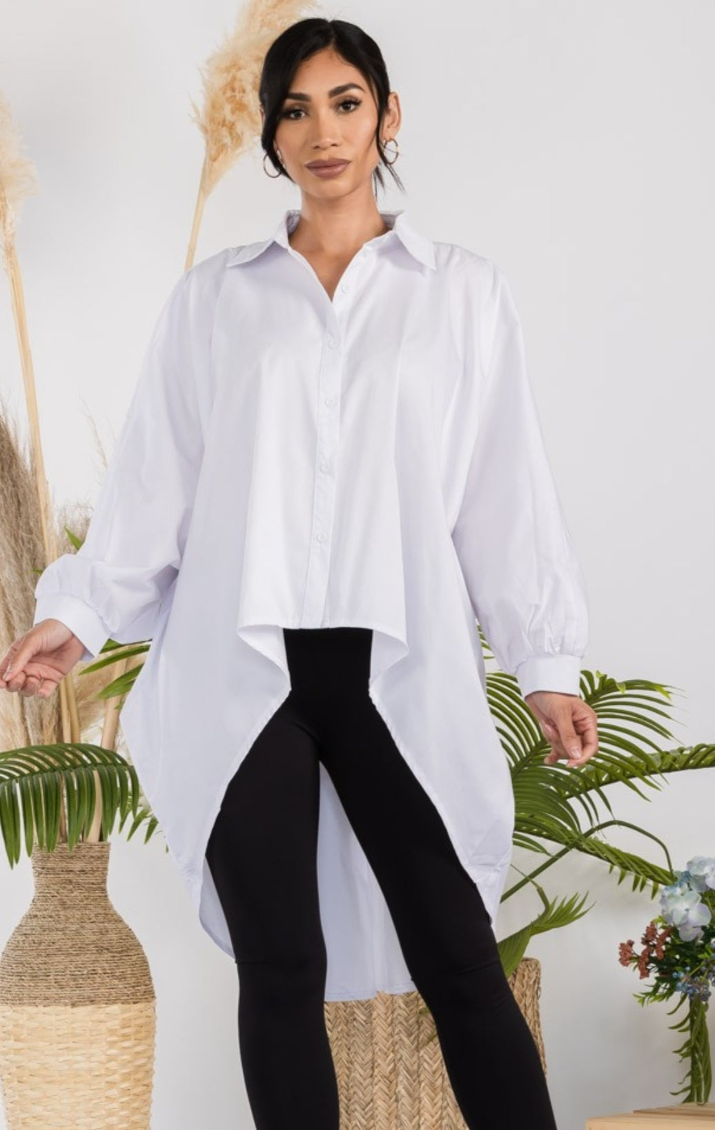 A chic and cozy long-sleeve blouse with a hi-lo style, perfect for a fashionable and relaxed ensemble.