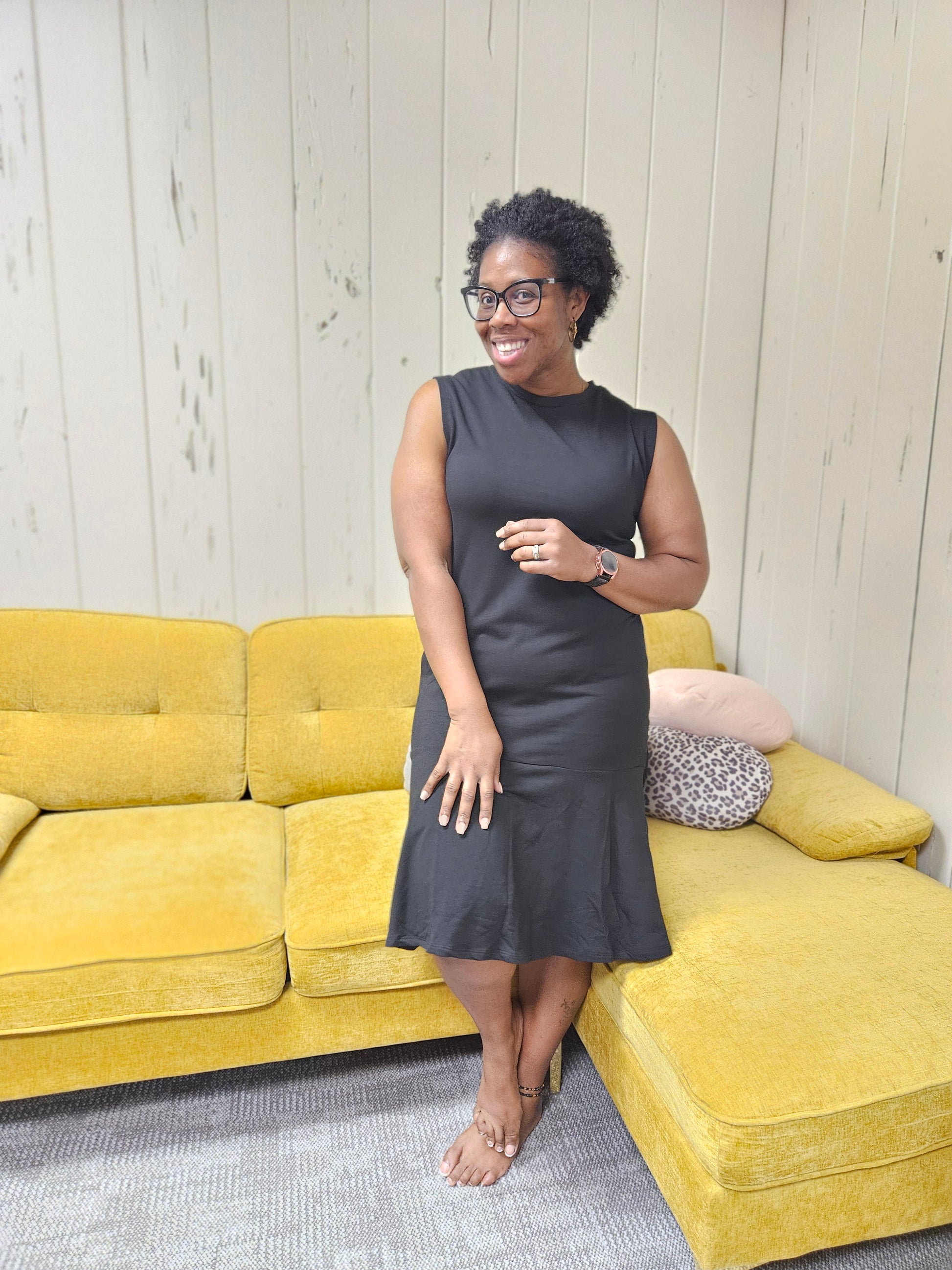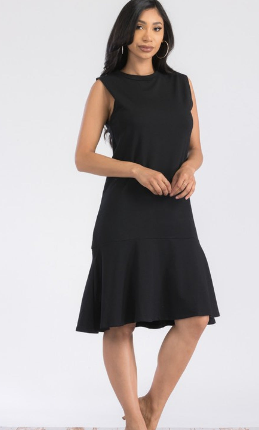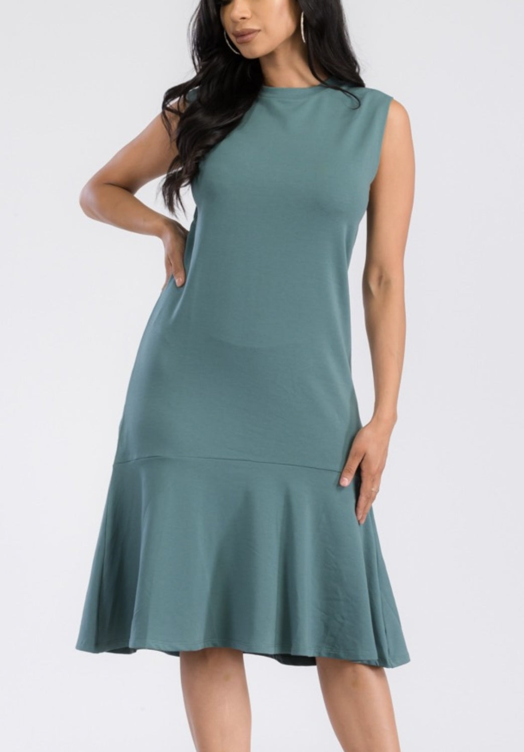This midi length sleeveless dress features an A-line silhouette with a drop waist and loose fit, made of a blend of 50% polyester, 45% cotton, and 5% spandex. Crafted in China with precision and quality.