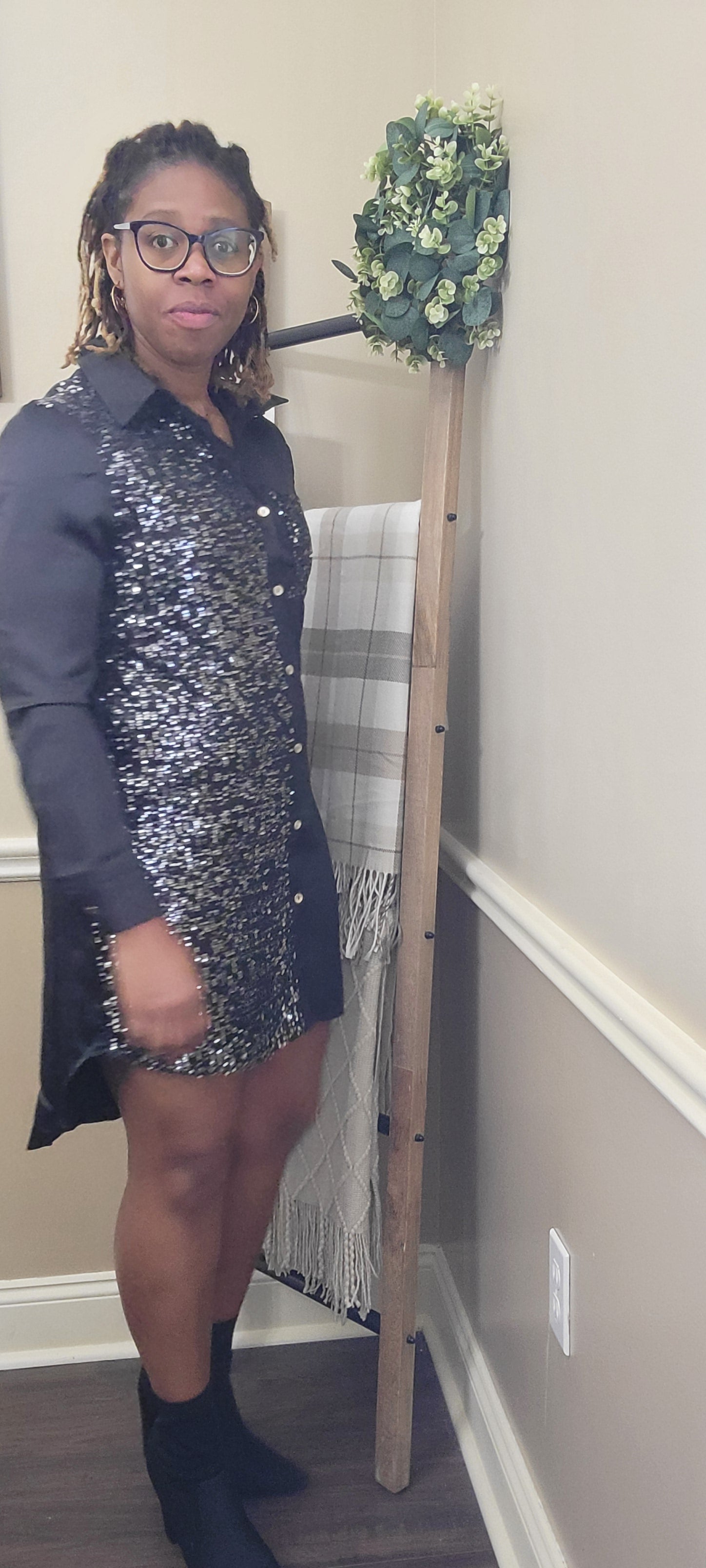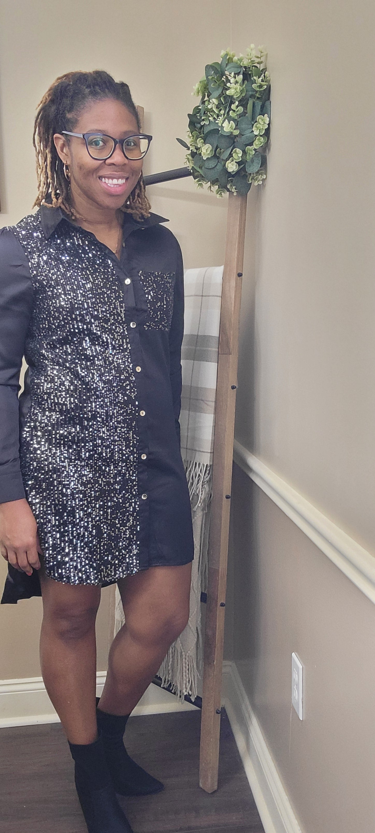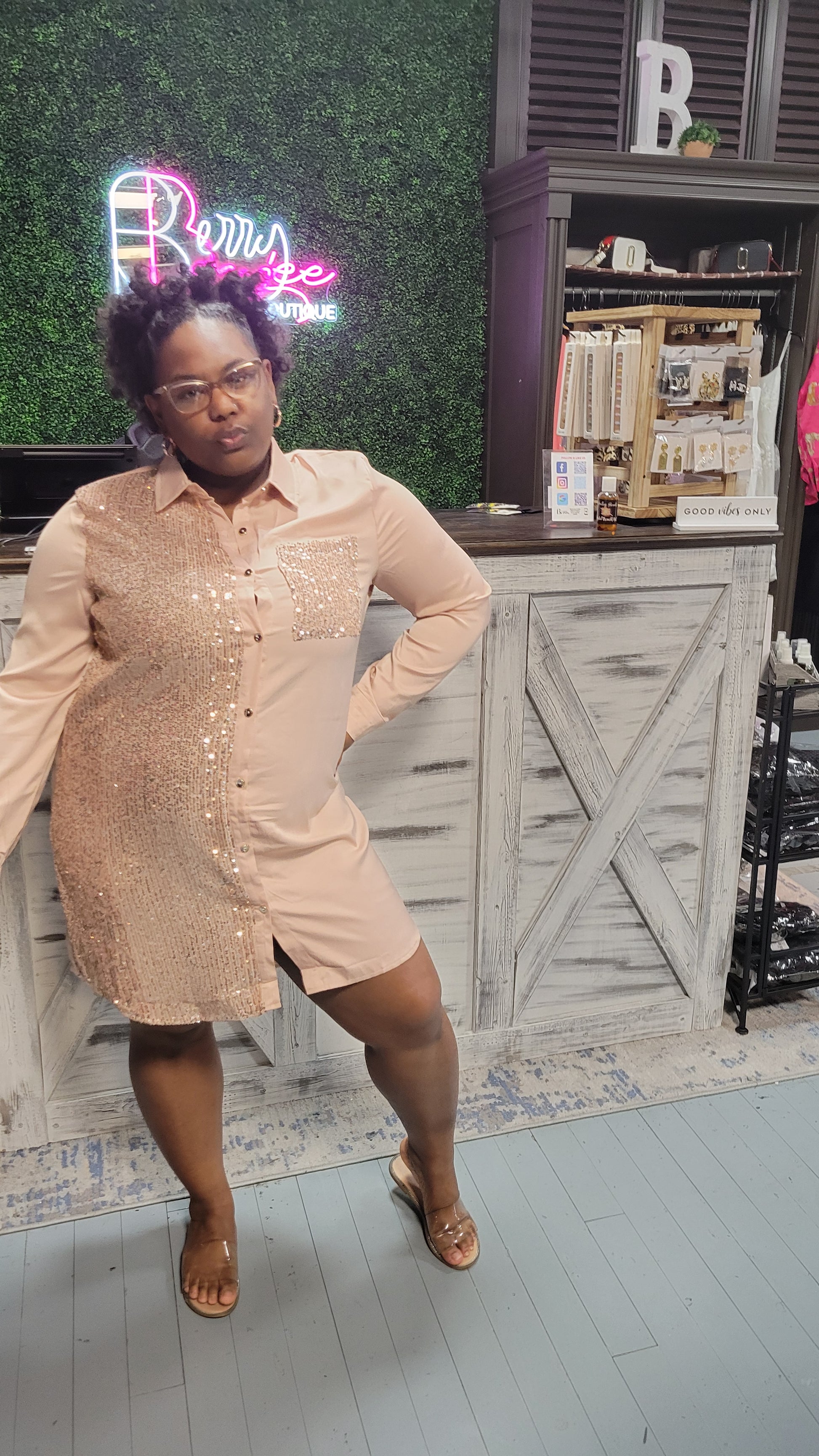 This dress or shirt features a design of sequins juxtaposed with a pocket, buttoned closure, and spliced detailing.