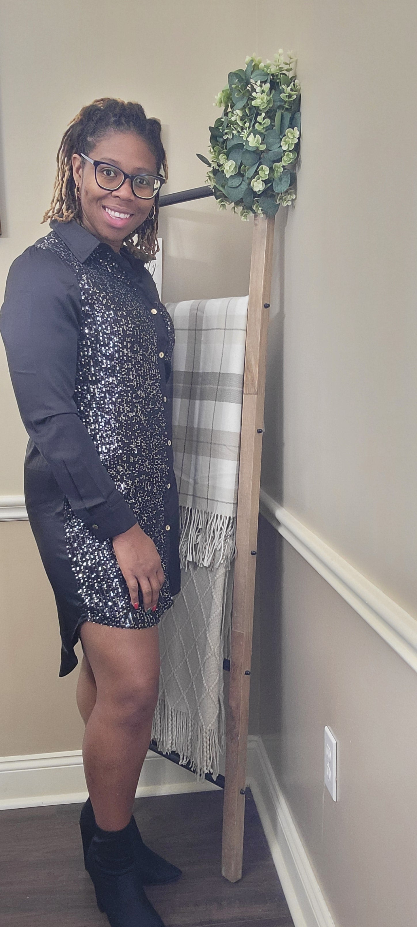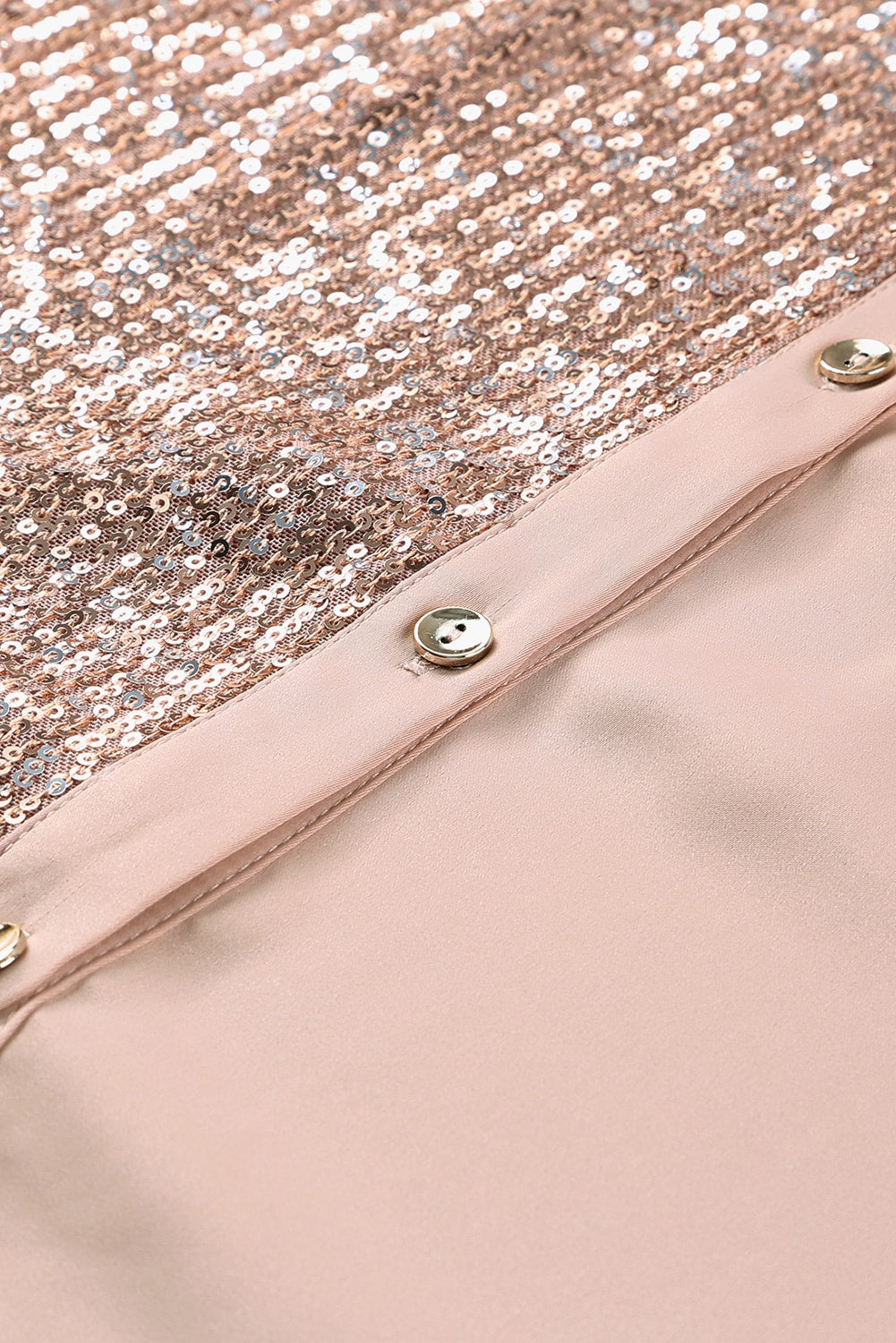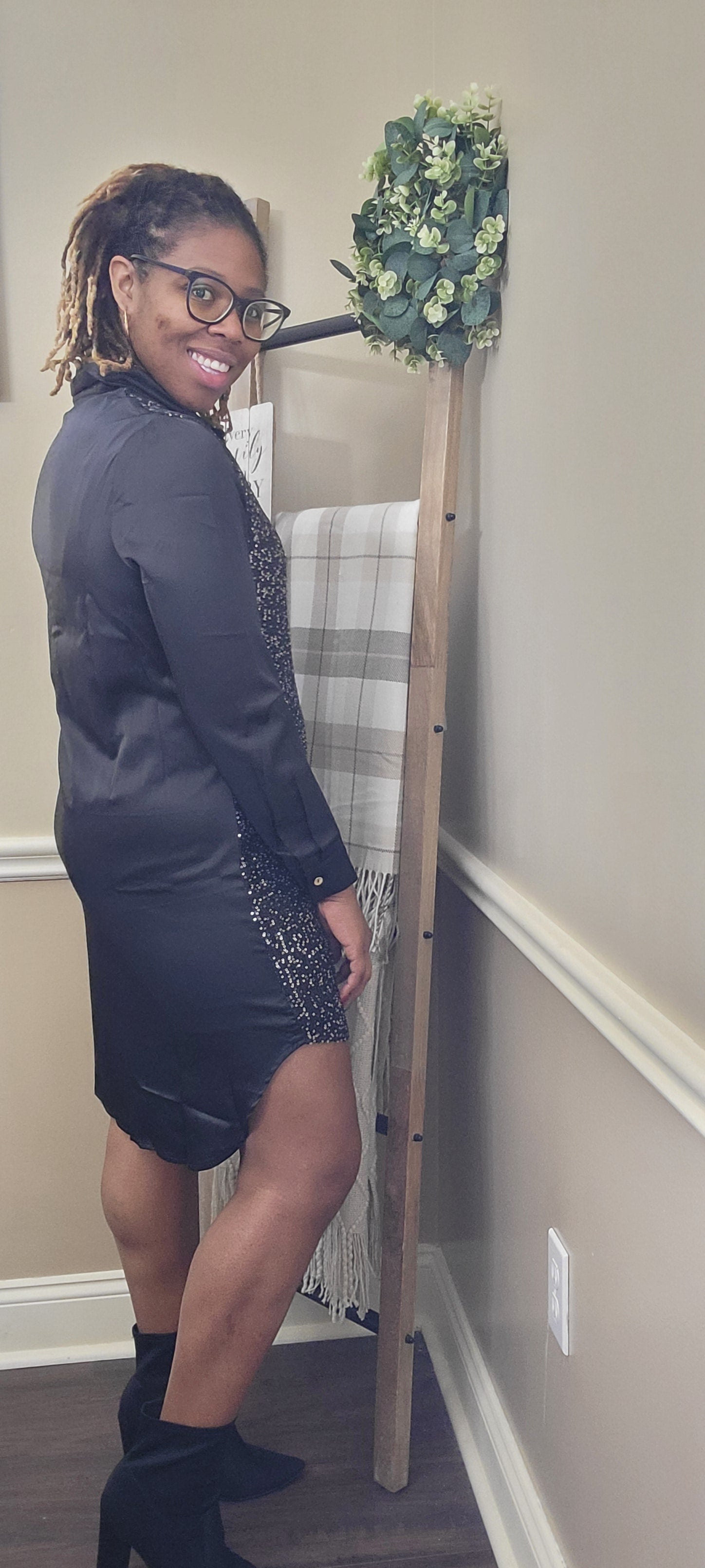 This dress or shirt features a design of sequins juxtaposed with a pocket, buttoned closure, and spliced detailing.