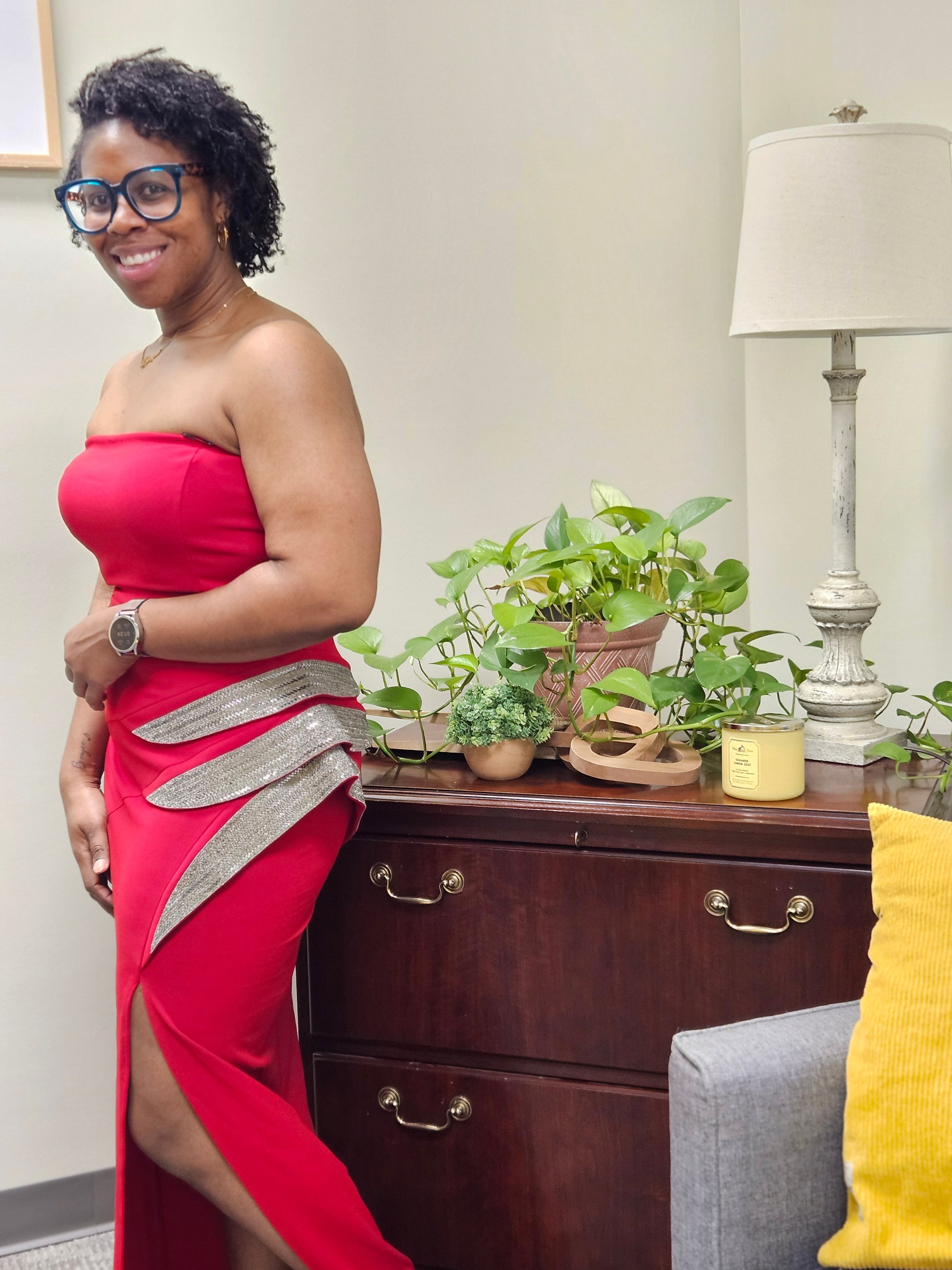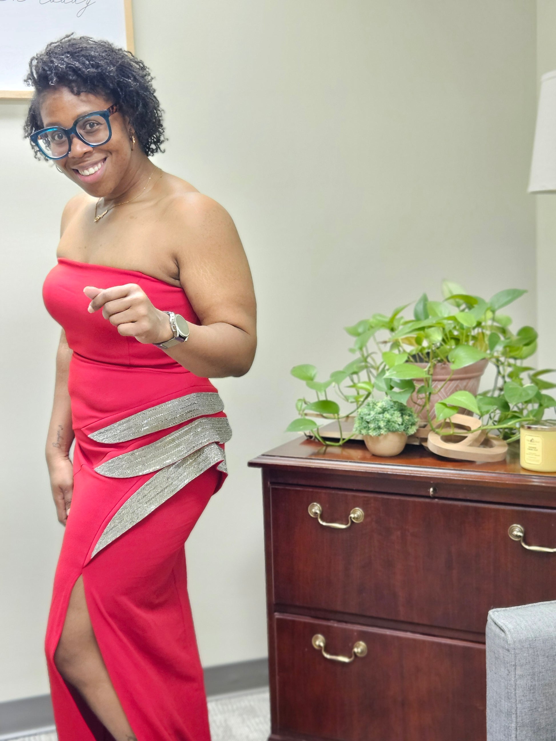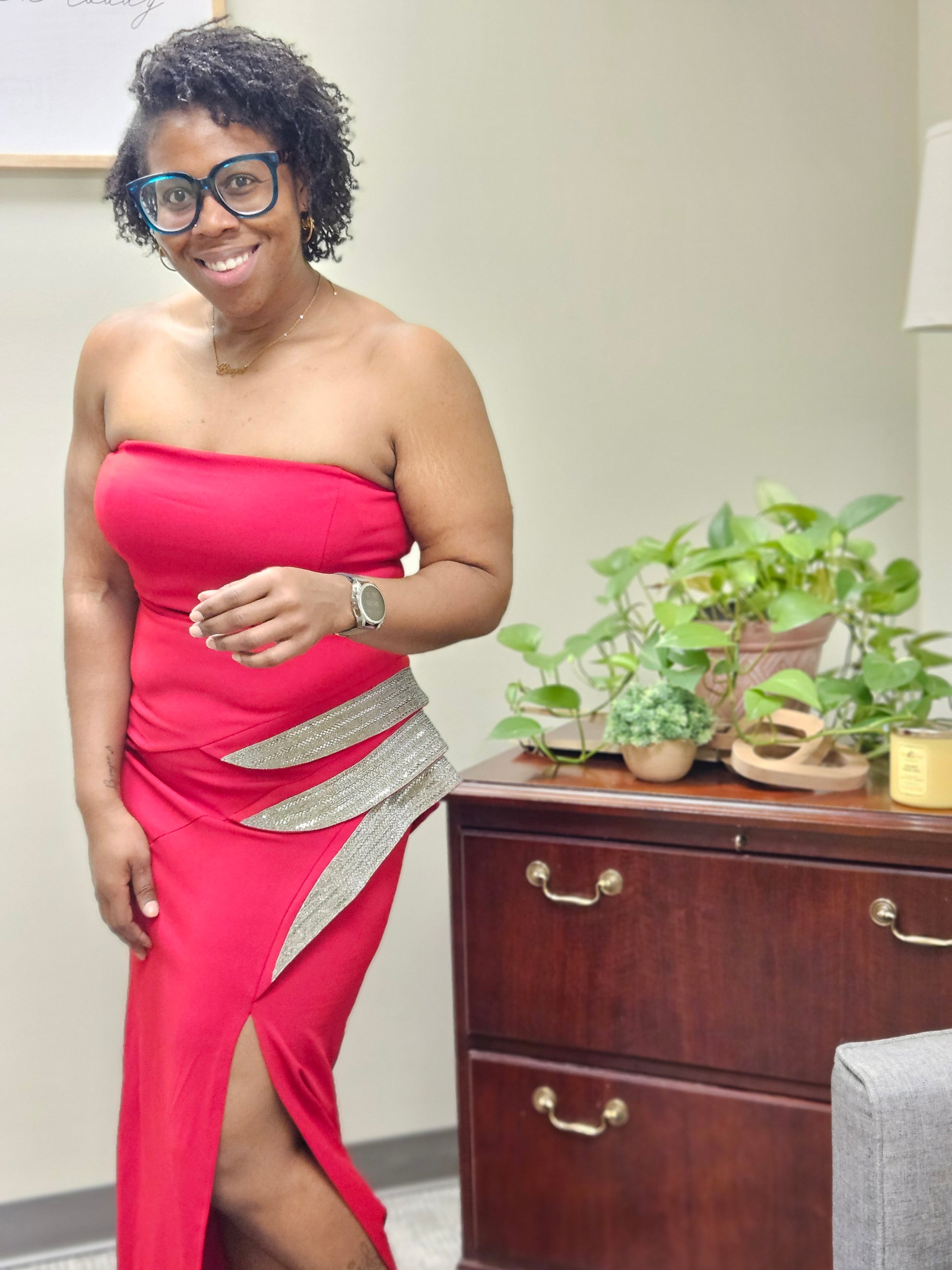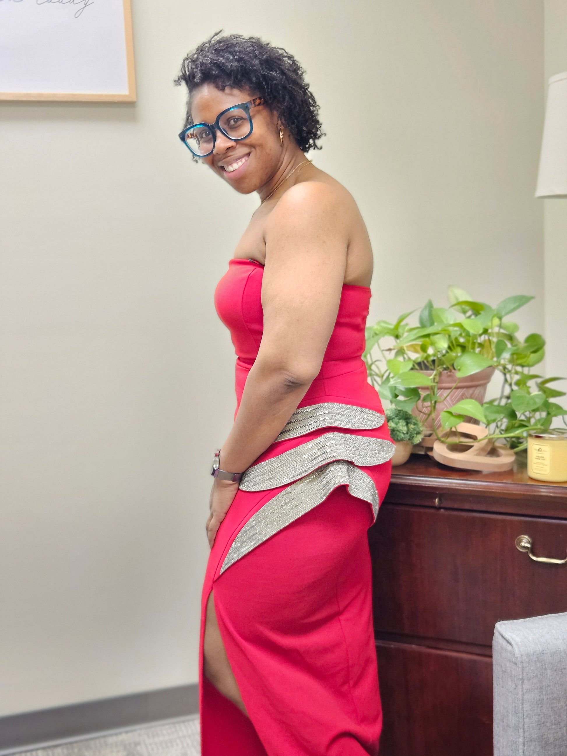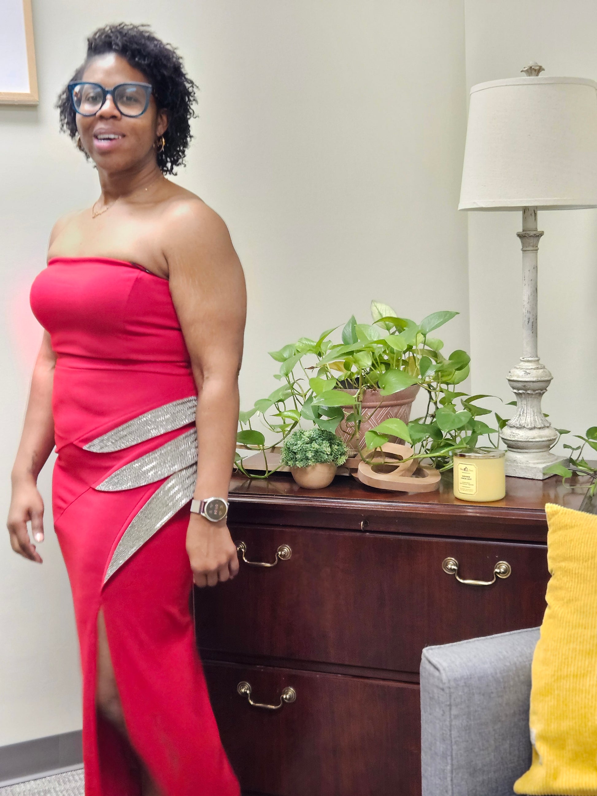 Experience perfection with this tube top maxi dress, featuring rhinestone detailing, a zipper back, and a bold side slit on the right side of the skirt. Take the risk and make a statement while standing out in this professionally styled dress!