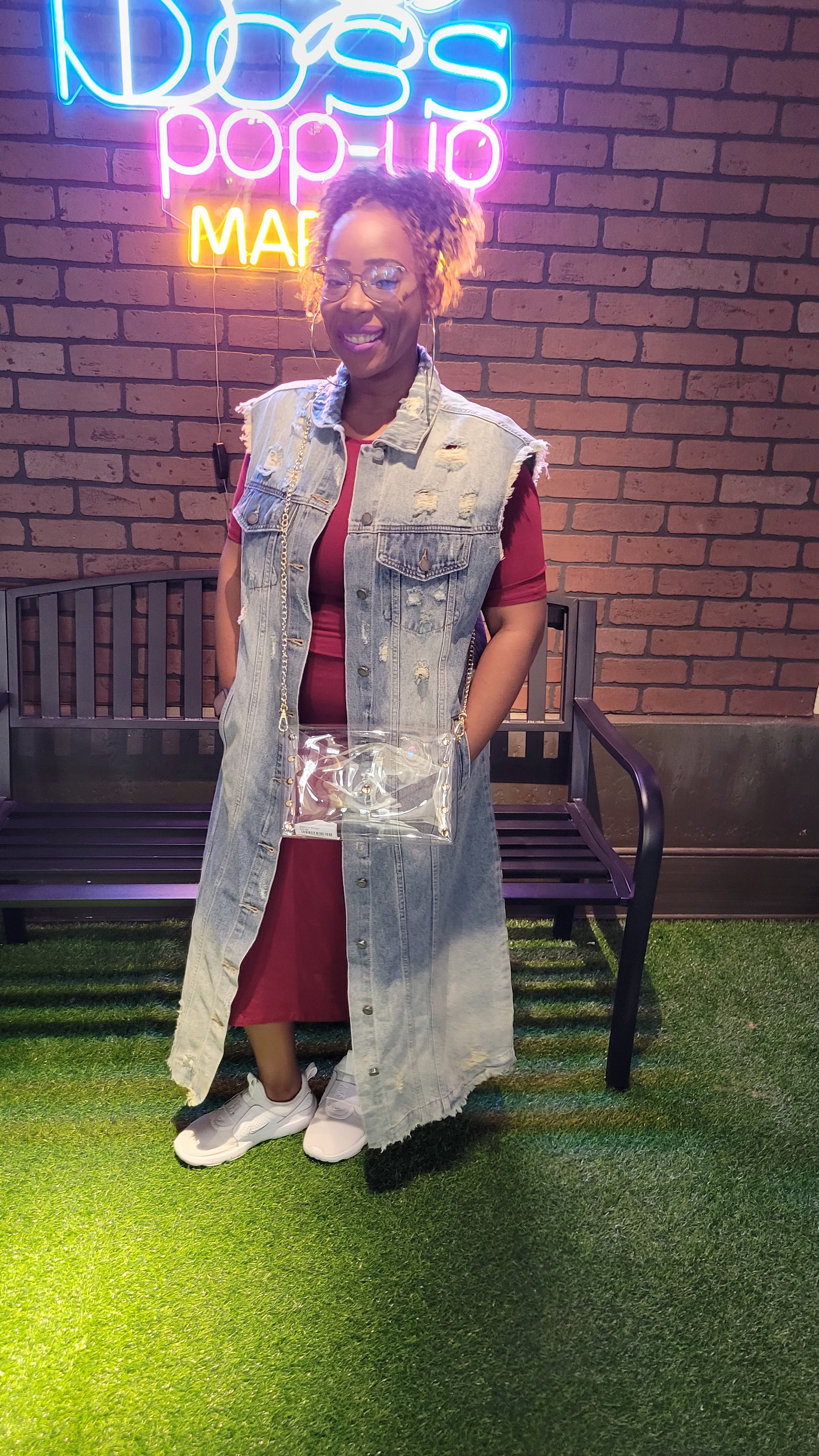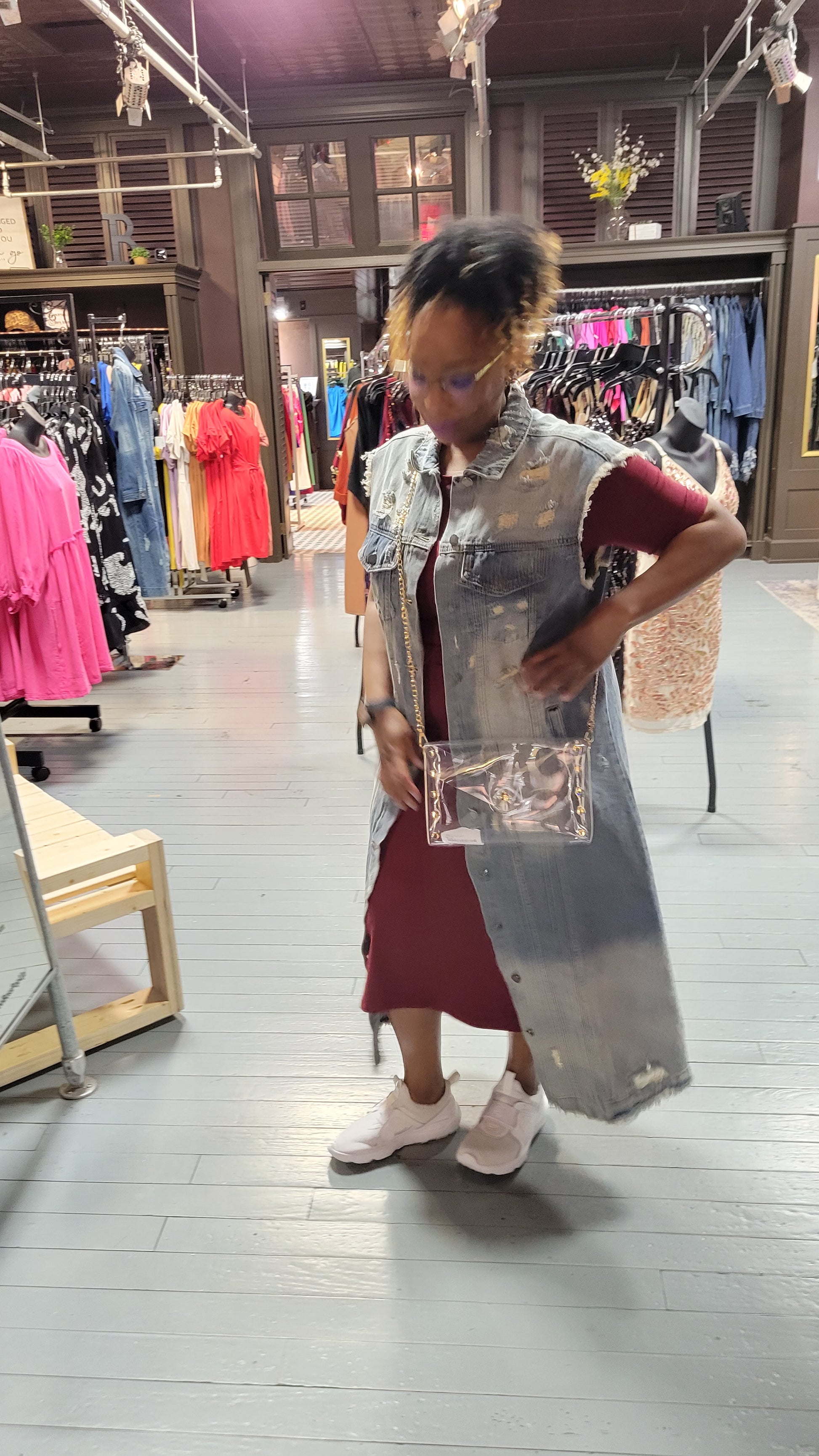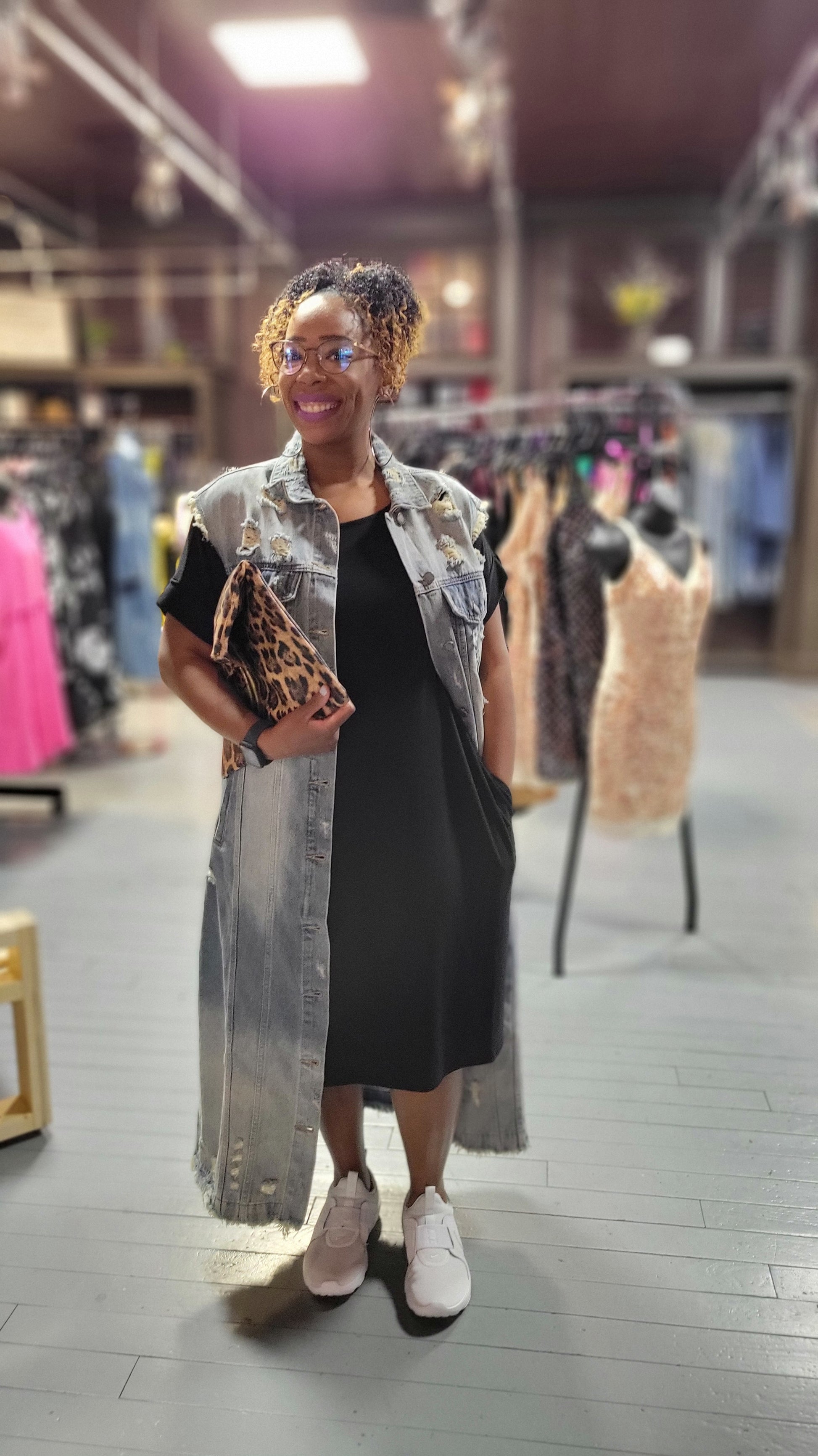 This mid-length denim vest features distressed details and a button fastening. Has pockets