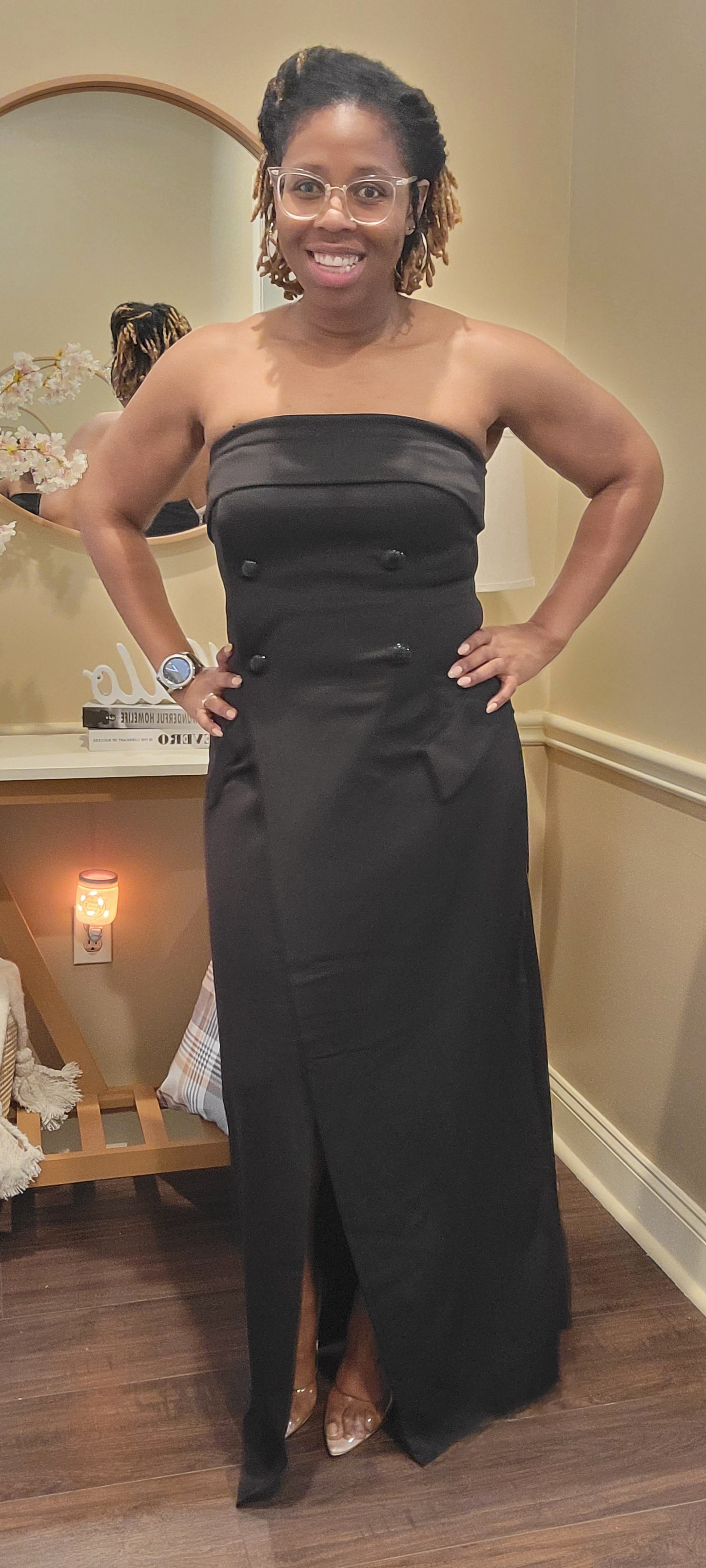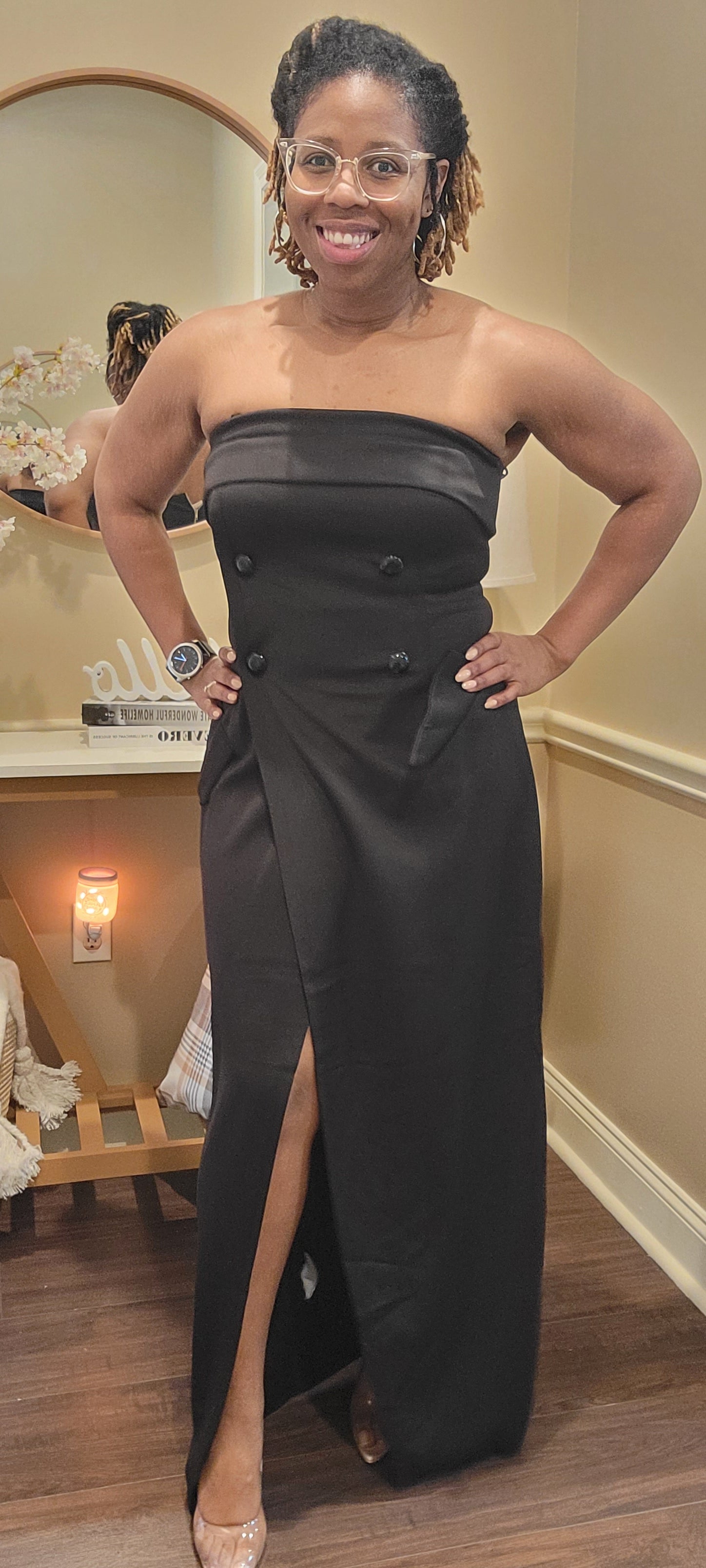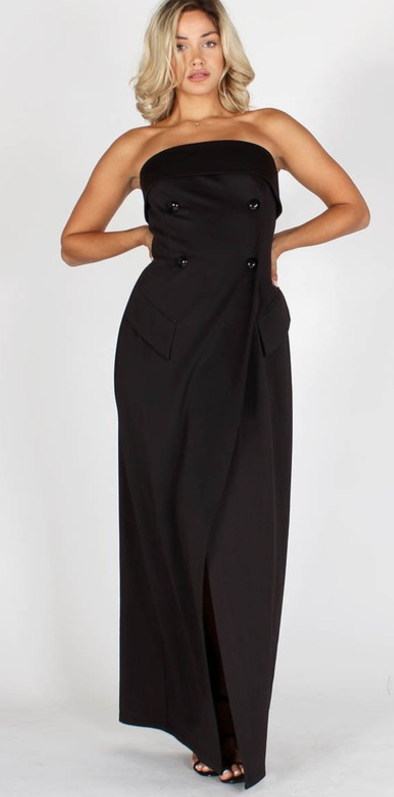 This maxi dress features a solid, strapless design in a comfortable, loose fit with trimmed button accents, wrap-around front, ornamental pockets, a front slit, and an open-back with a zipper closure.