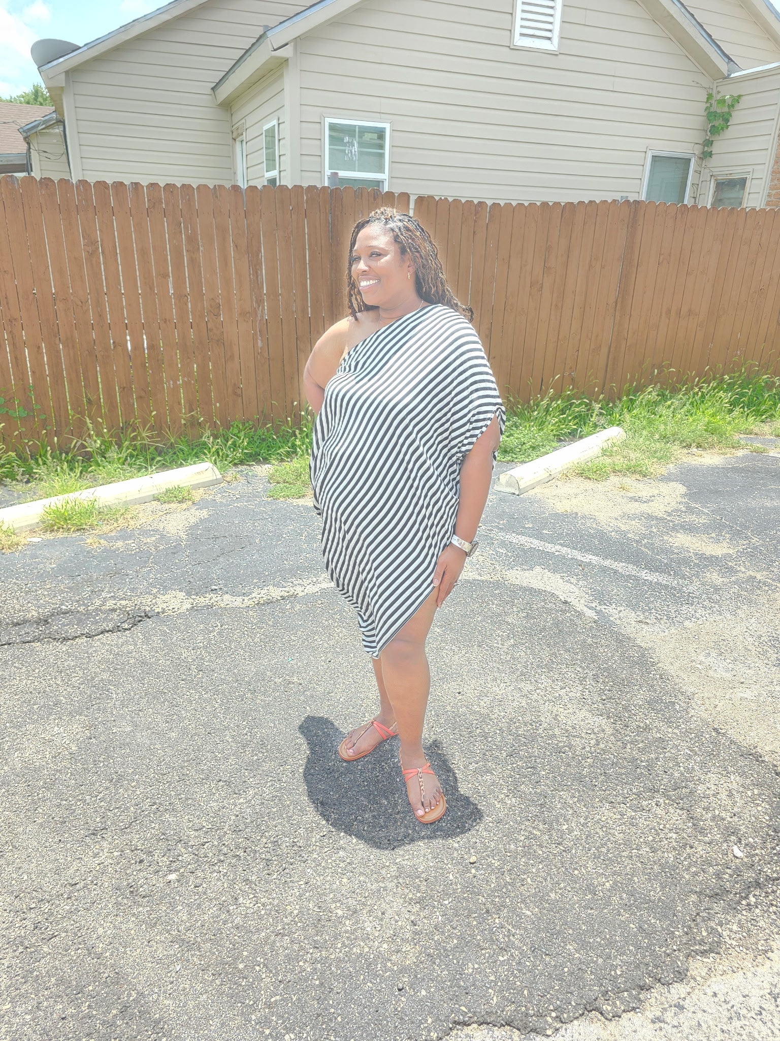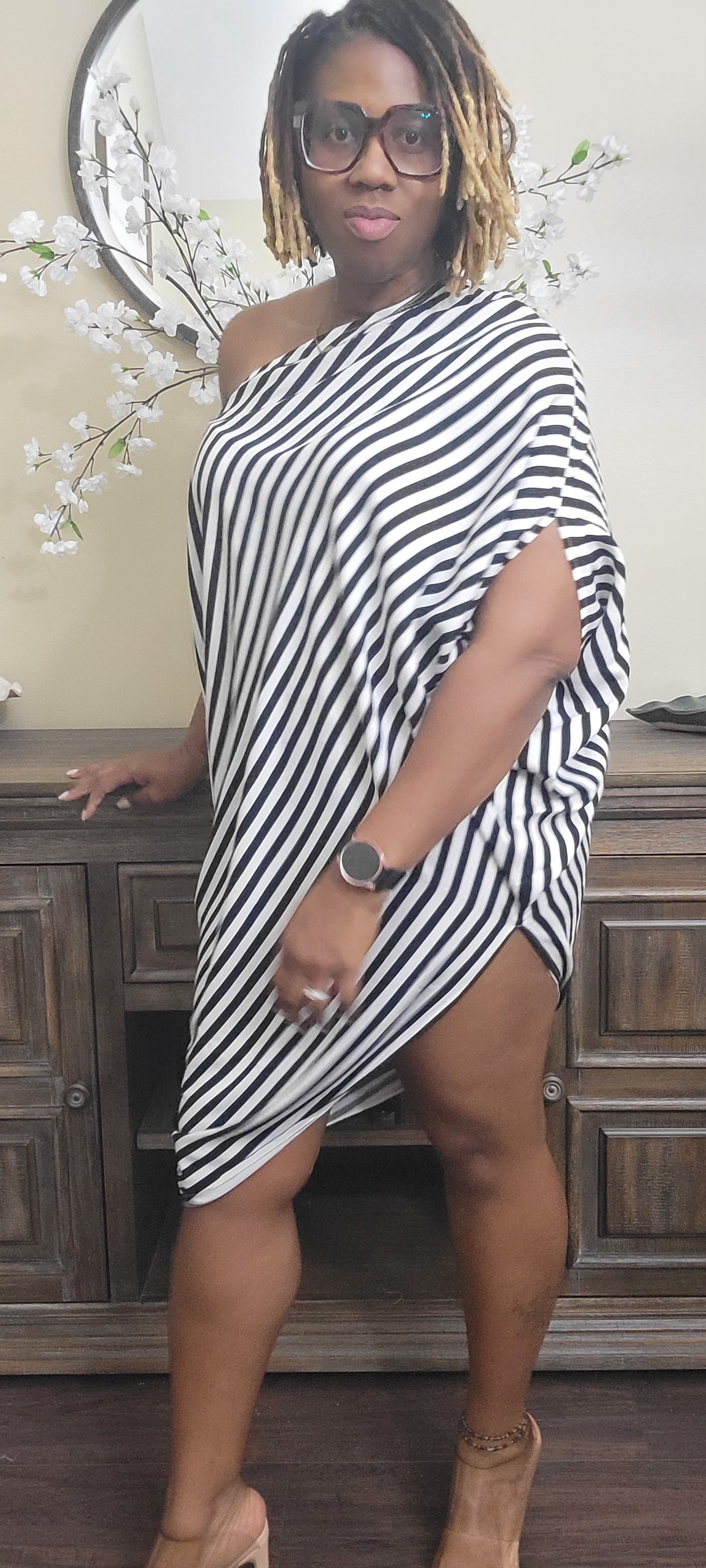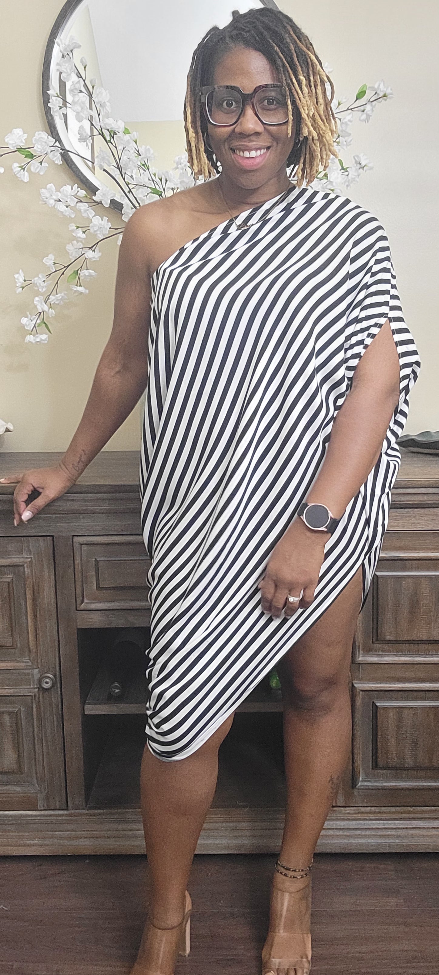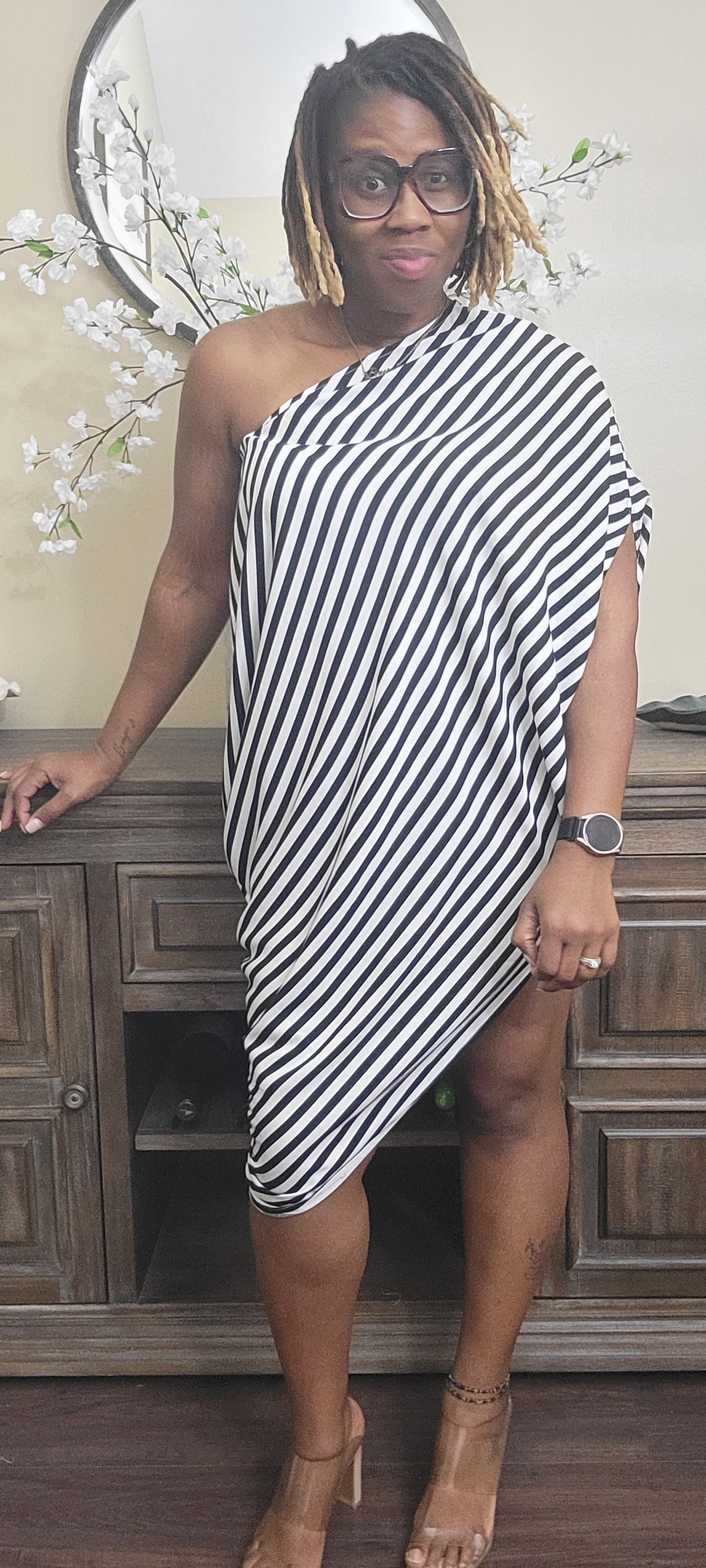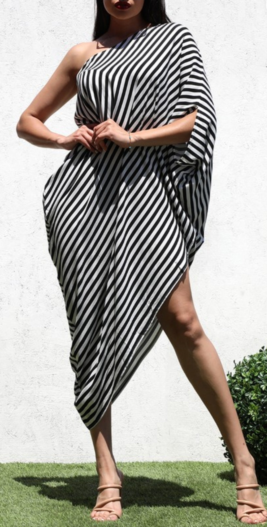 This dress has a relaxed fit with a loose-fitting one shoulder and sleeve, adding versatility and functionality to your wardrobe.