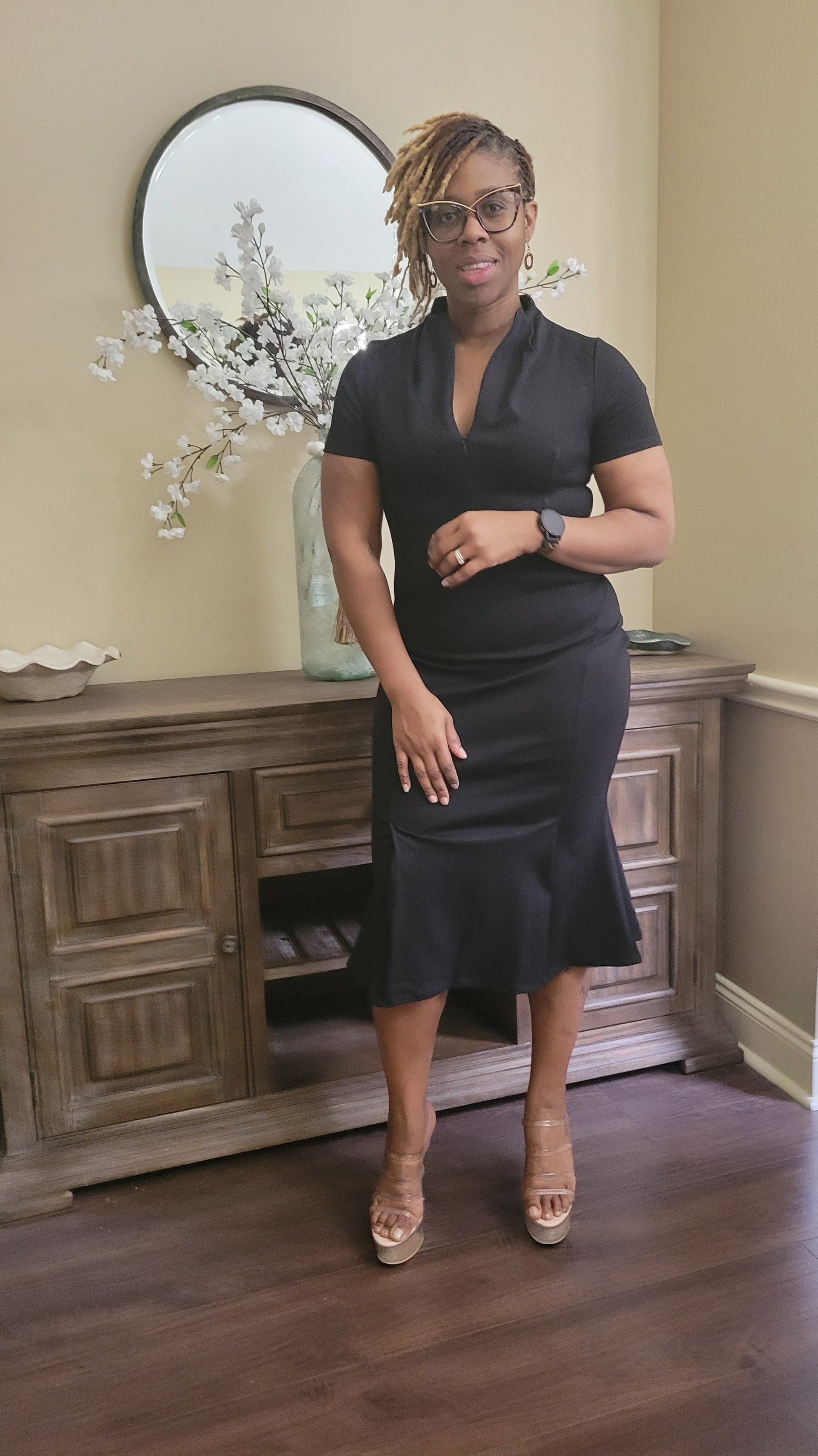 This short sleeve, high-neck midi dress features a mermaid silhouette and front-zip detail with princess seam.