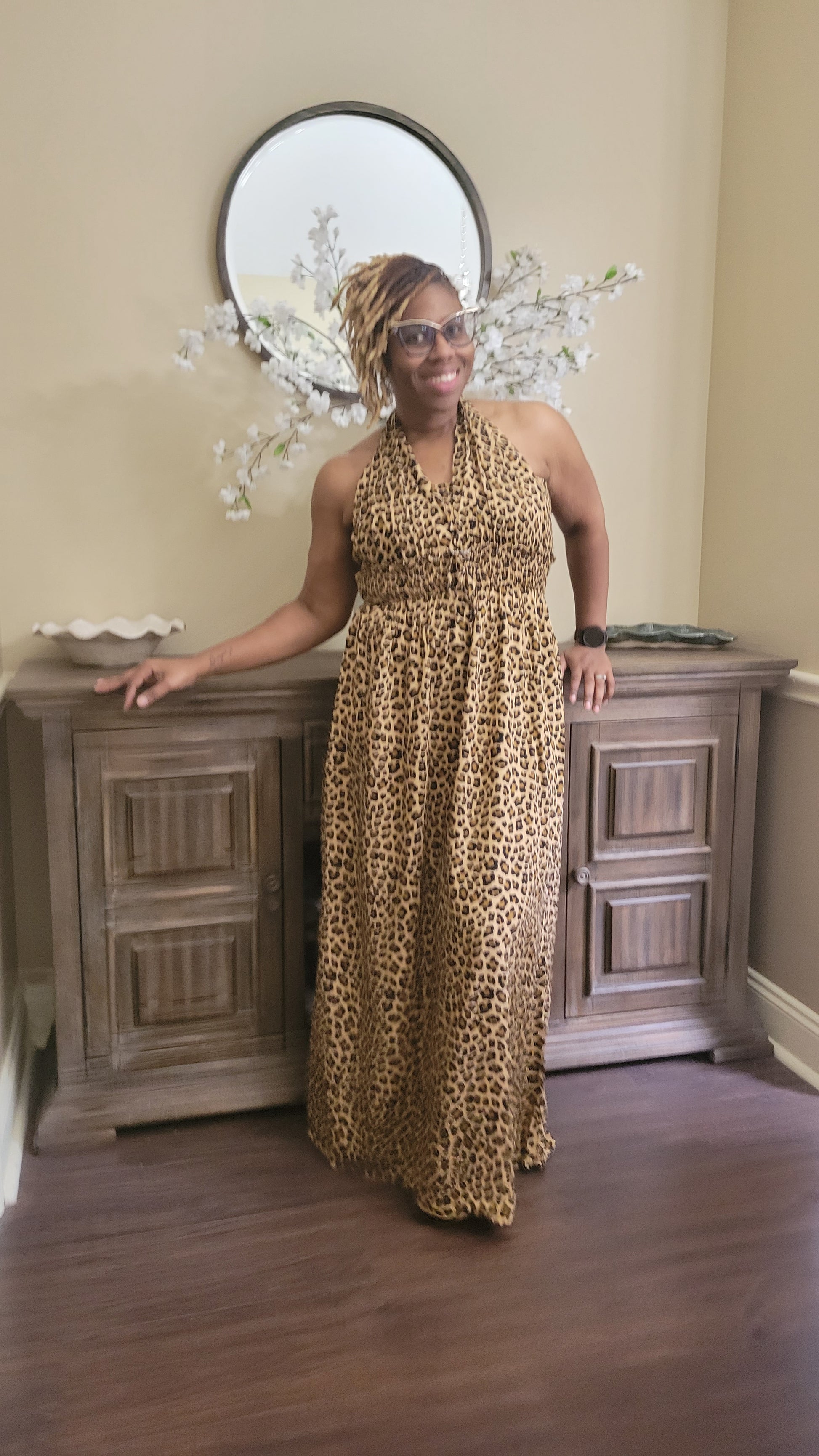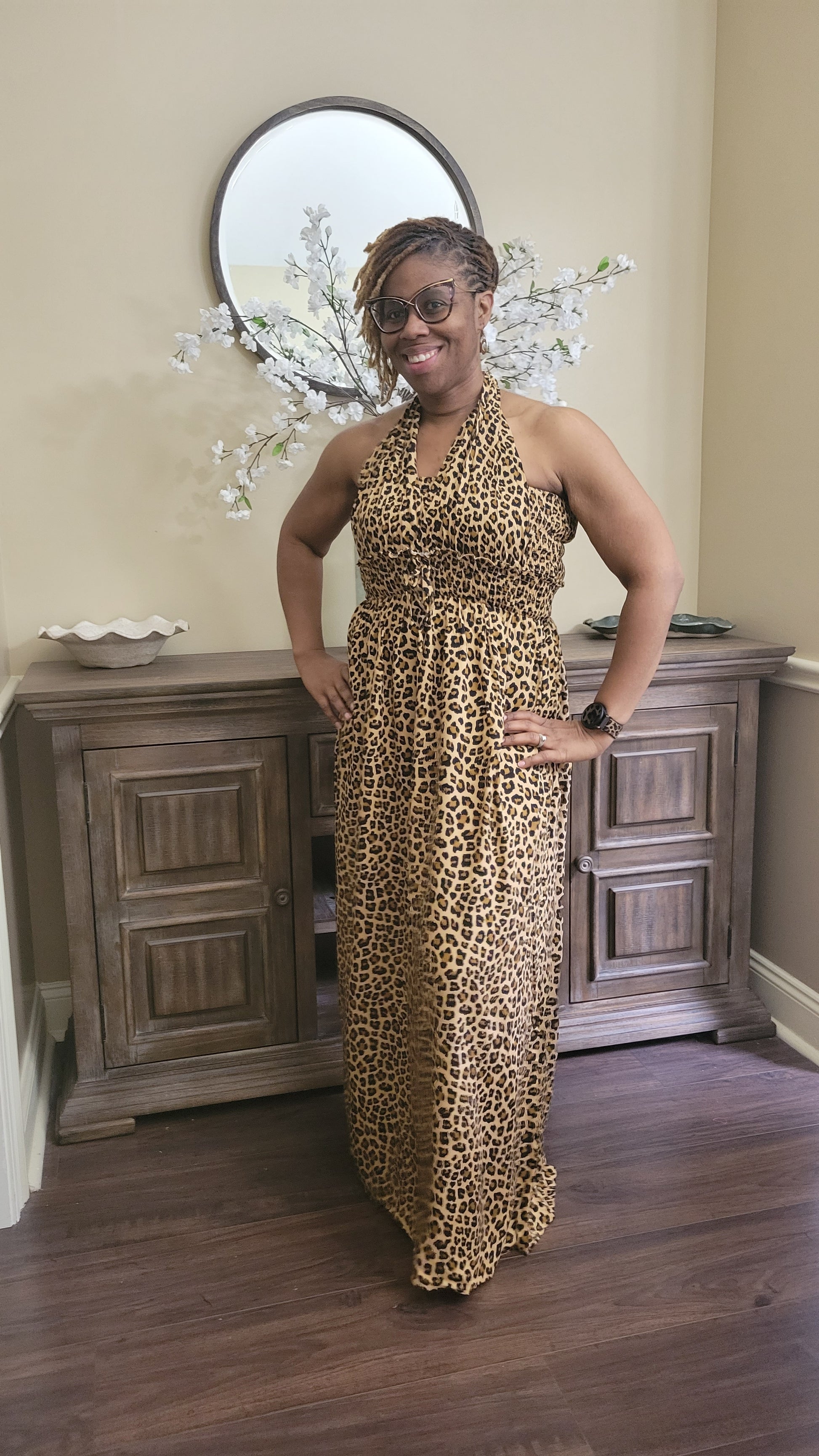 This printed halter smocked babydoll maxi dress is sure to become a favorite in any closet.