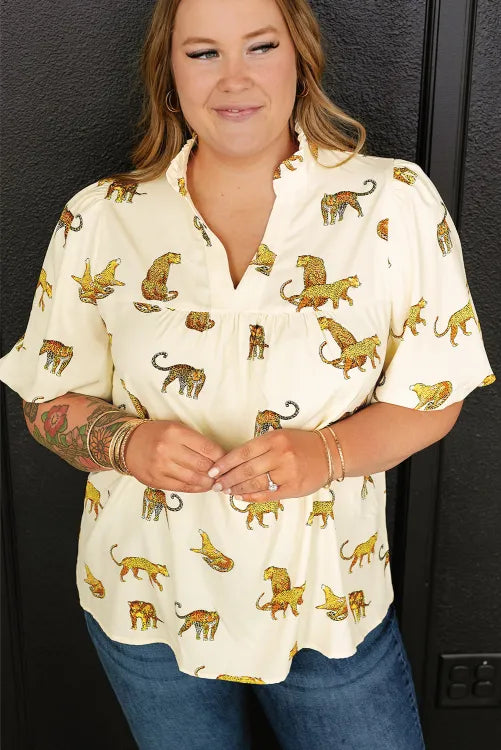 Get spotted in style with this beige animal print top featuring short puff sleeves.