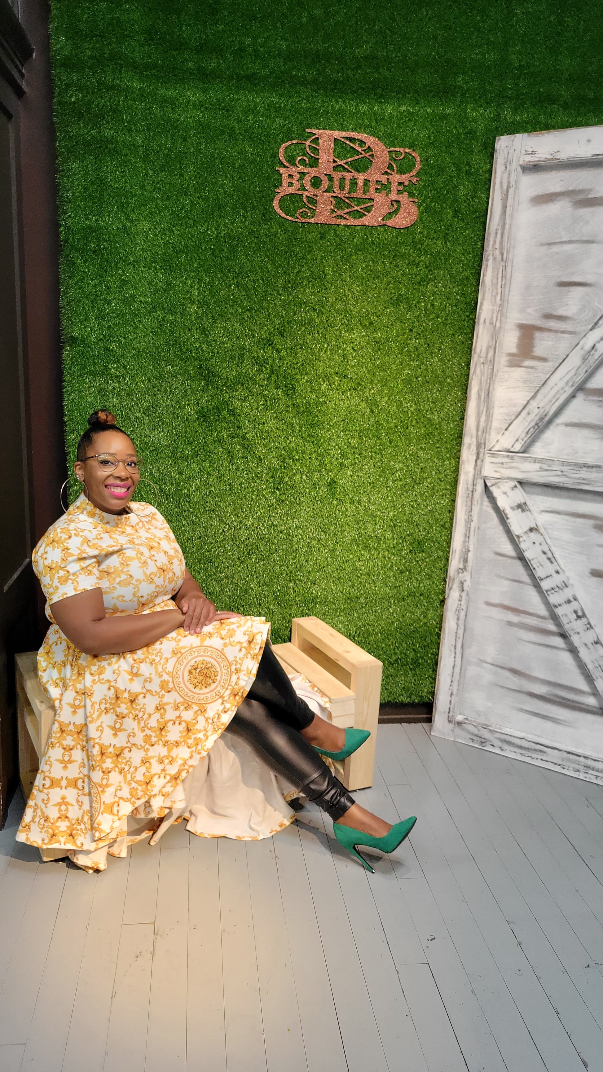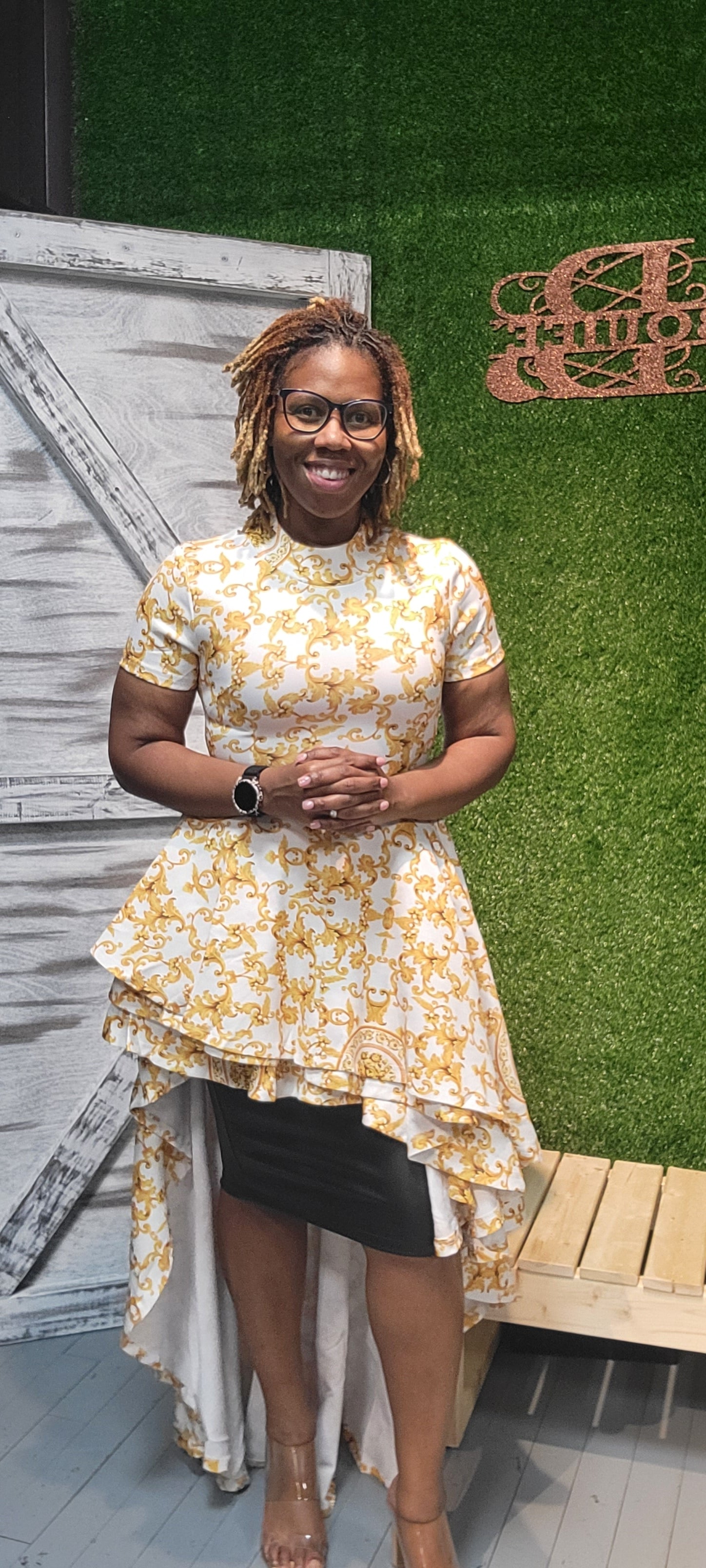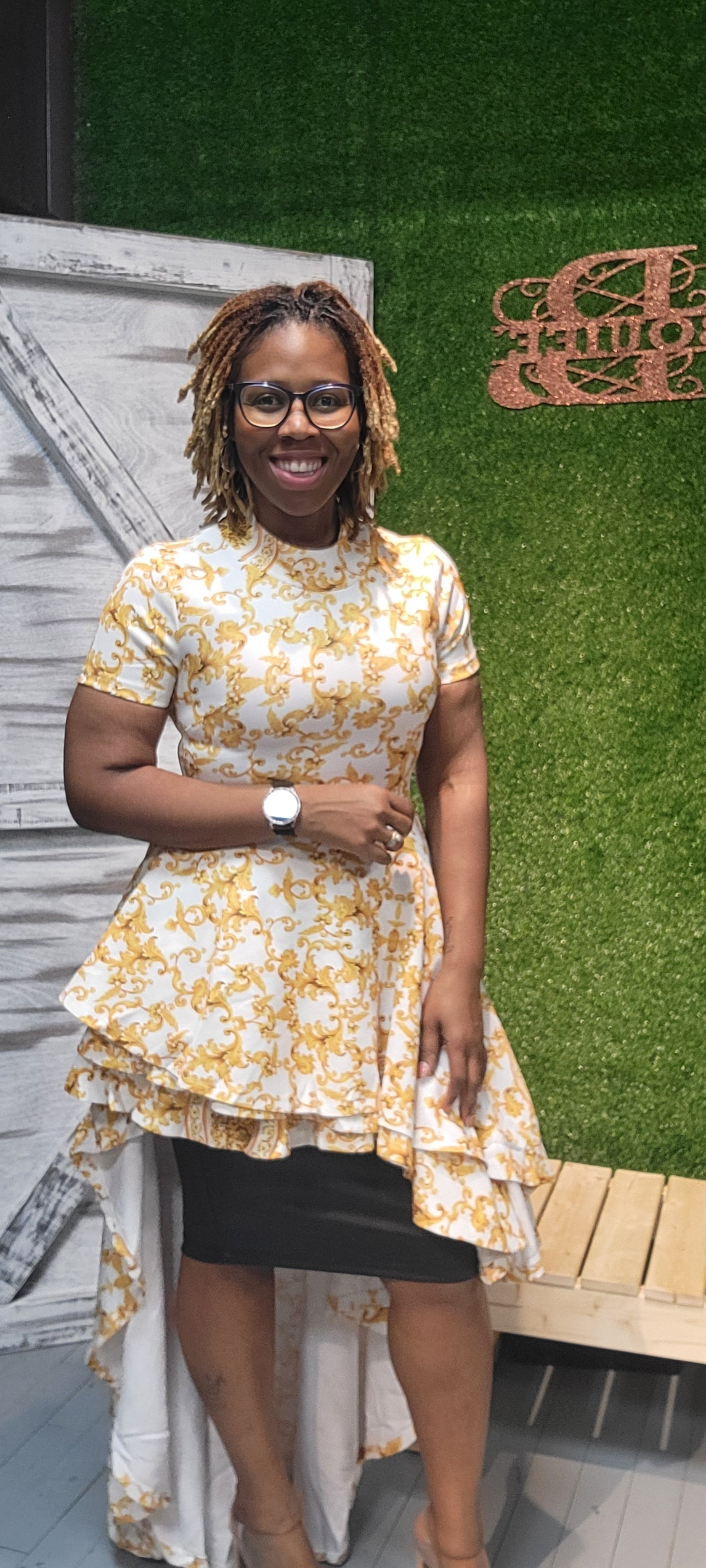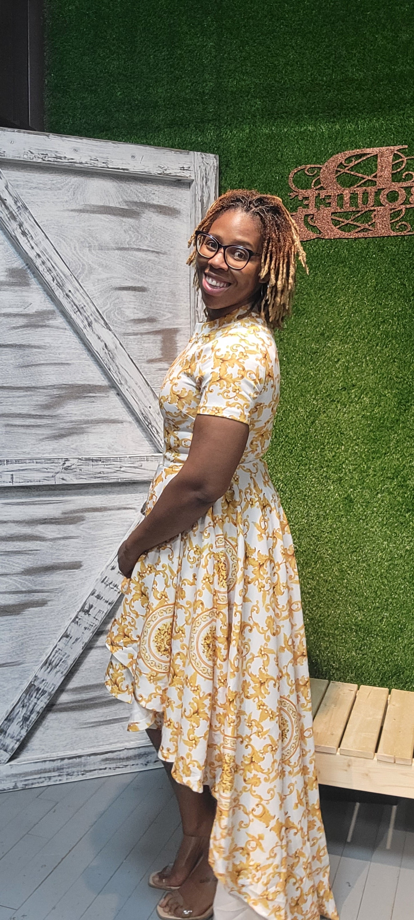 This white/gold maxi dress showcases a fit-and-flare silhouette and features a mock neck, short sleeves, layered skirt, pleats, and hi-low hem. A white panel adds a classic element to the design, and a back zipper allows for easy closure.
