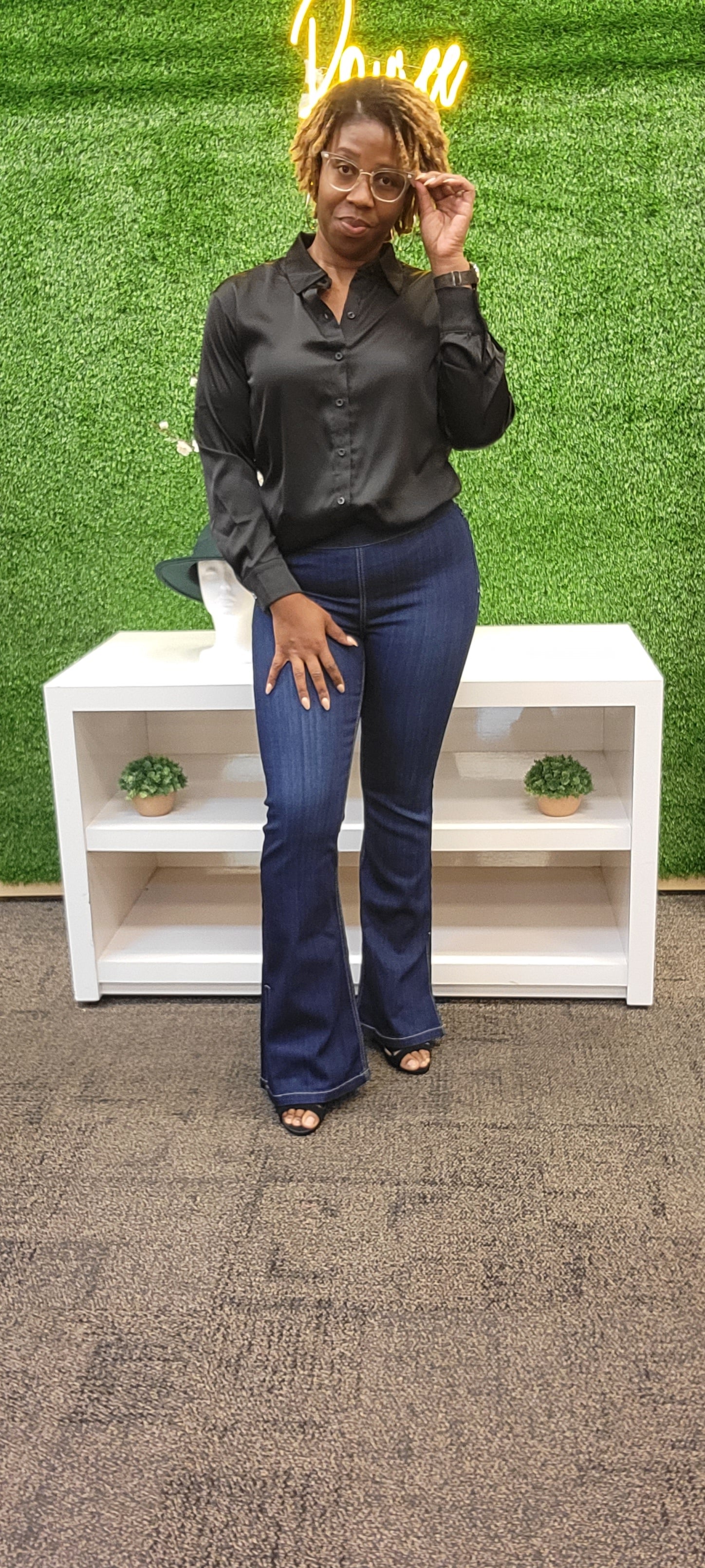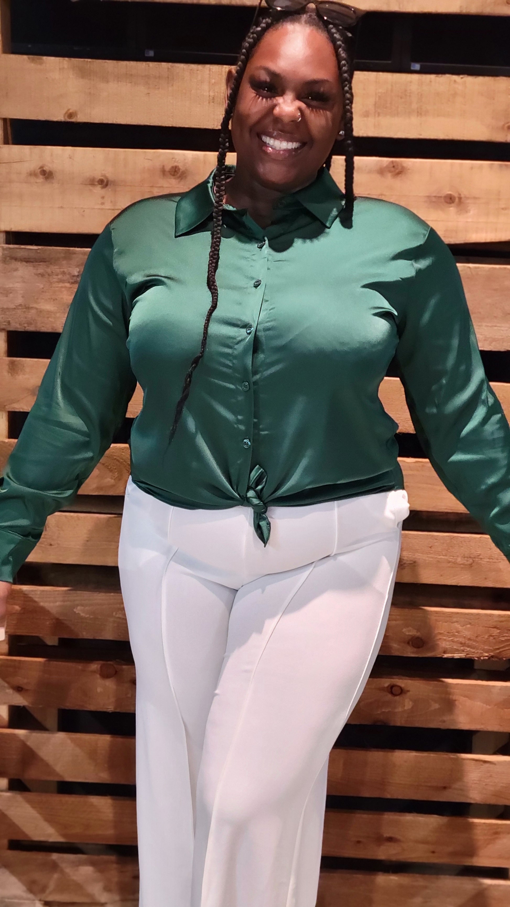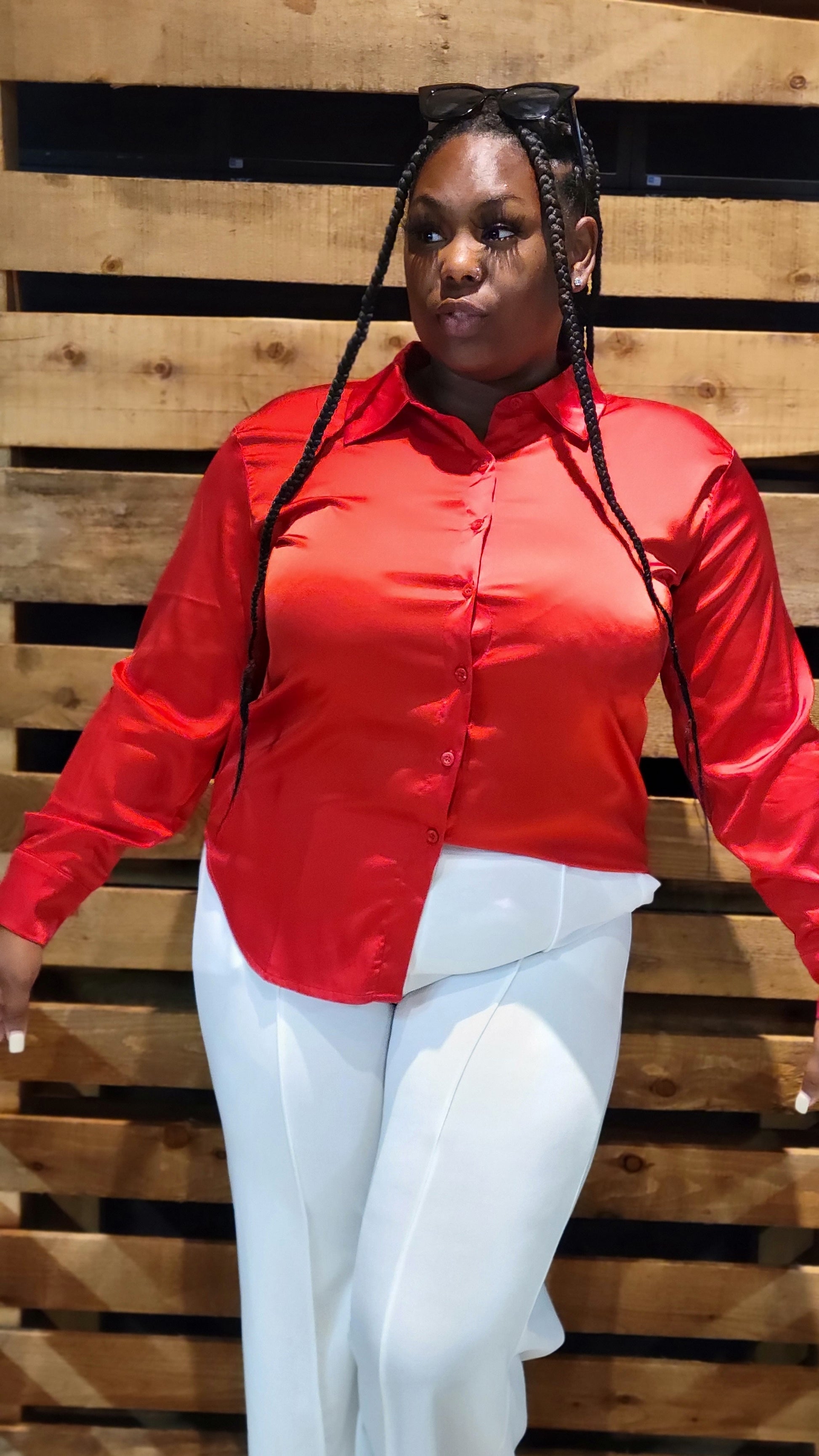Crafted from opulent satin charmeuse, this button down blouse exudes an elegant appearance. Charmeuse, a lavish fabric with a lustrous face and matte reverse, is typically woven using silk.