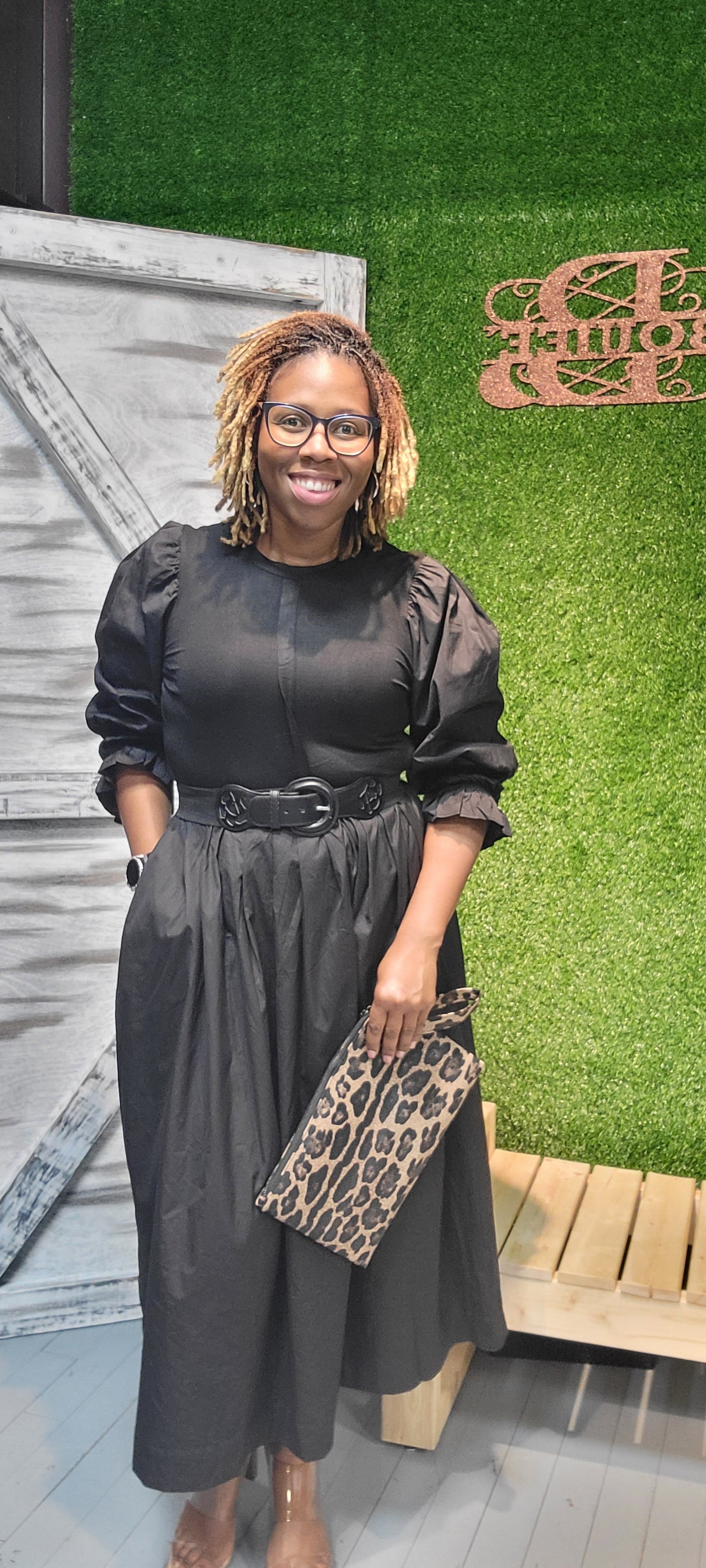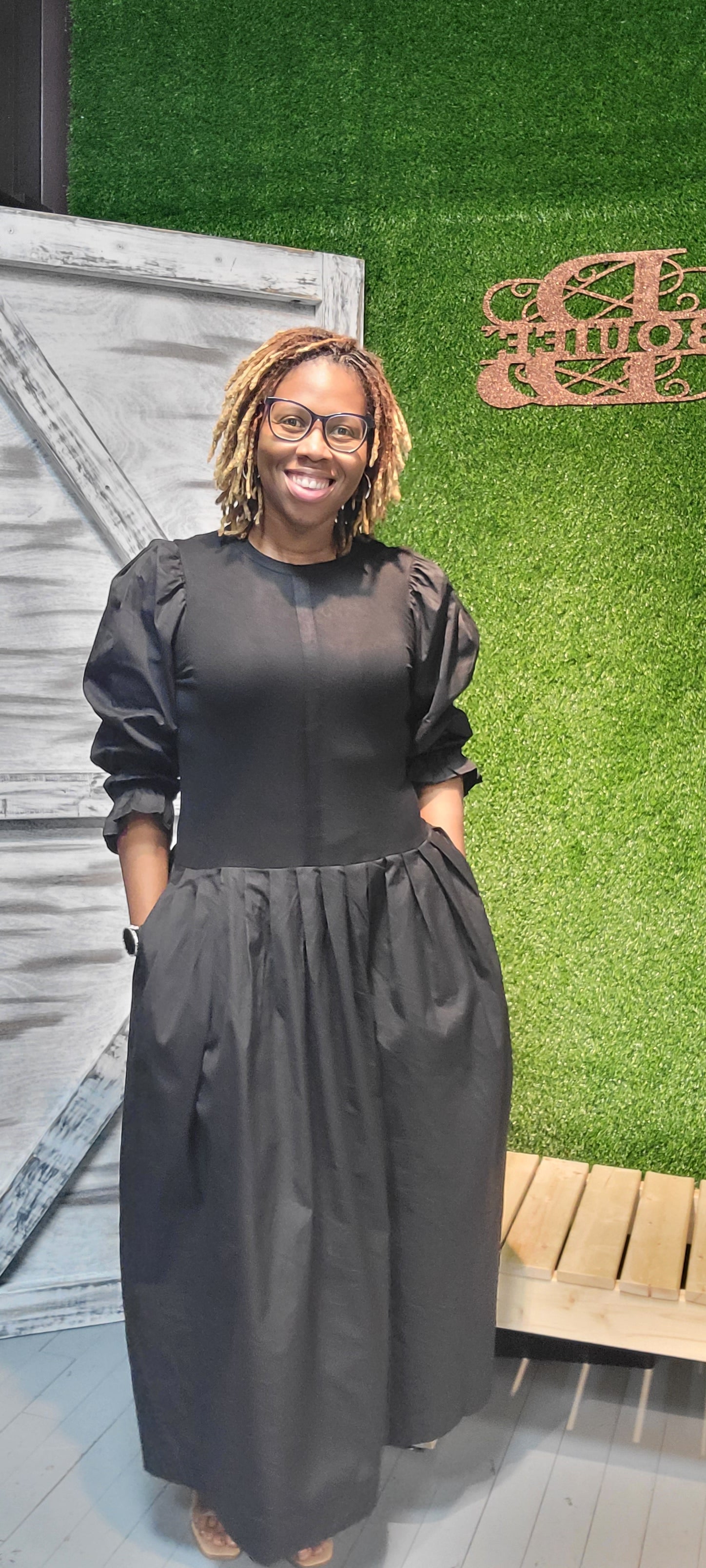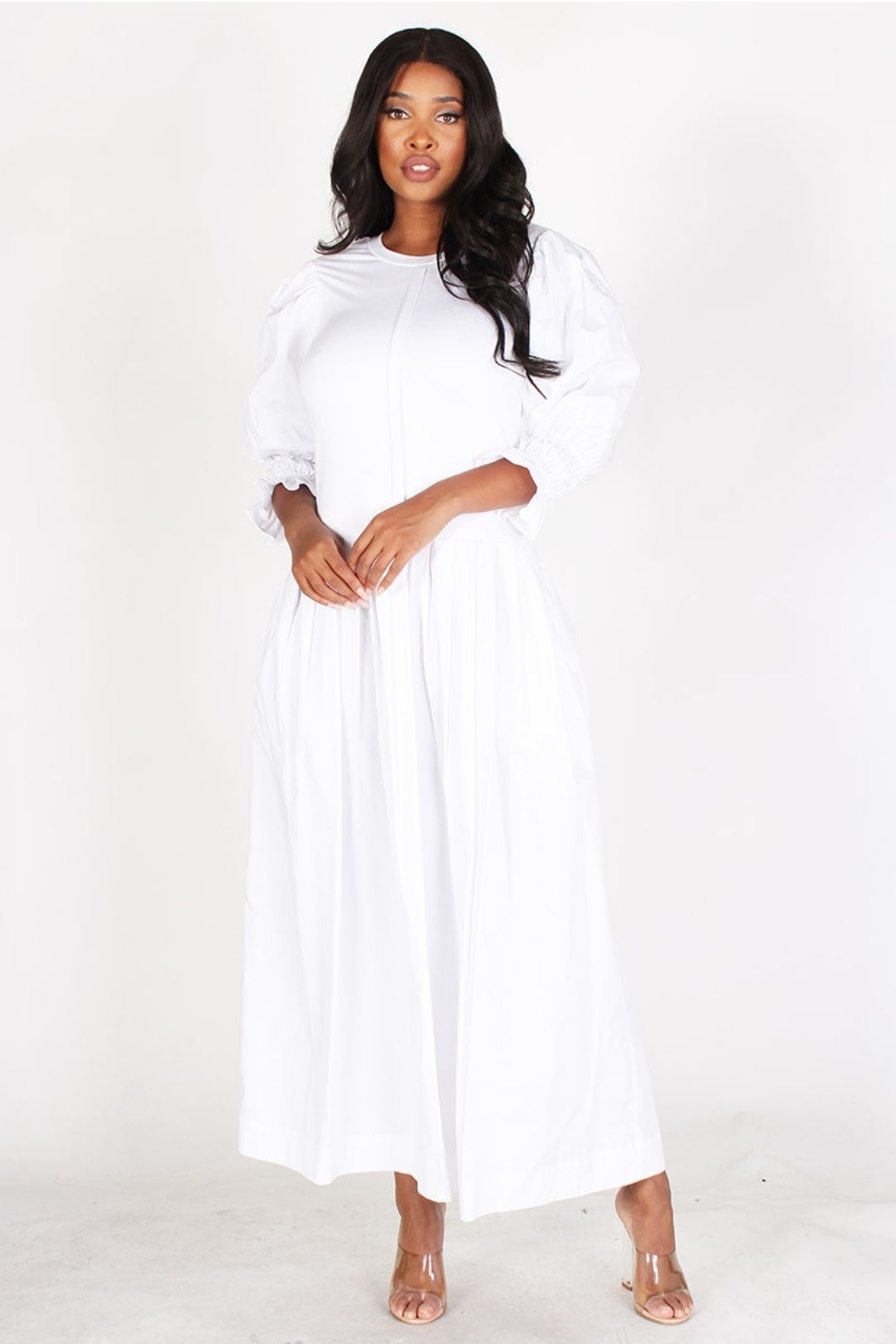 Features a poet's sleeve, round neckline, and solid construction, this maxi-length dress includes pockets for added convenience.