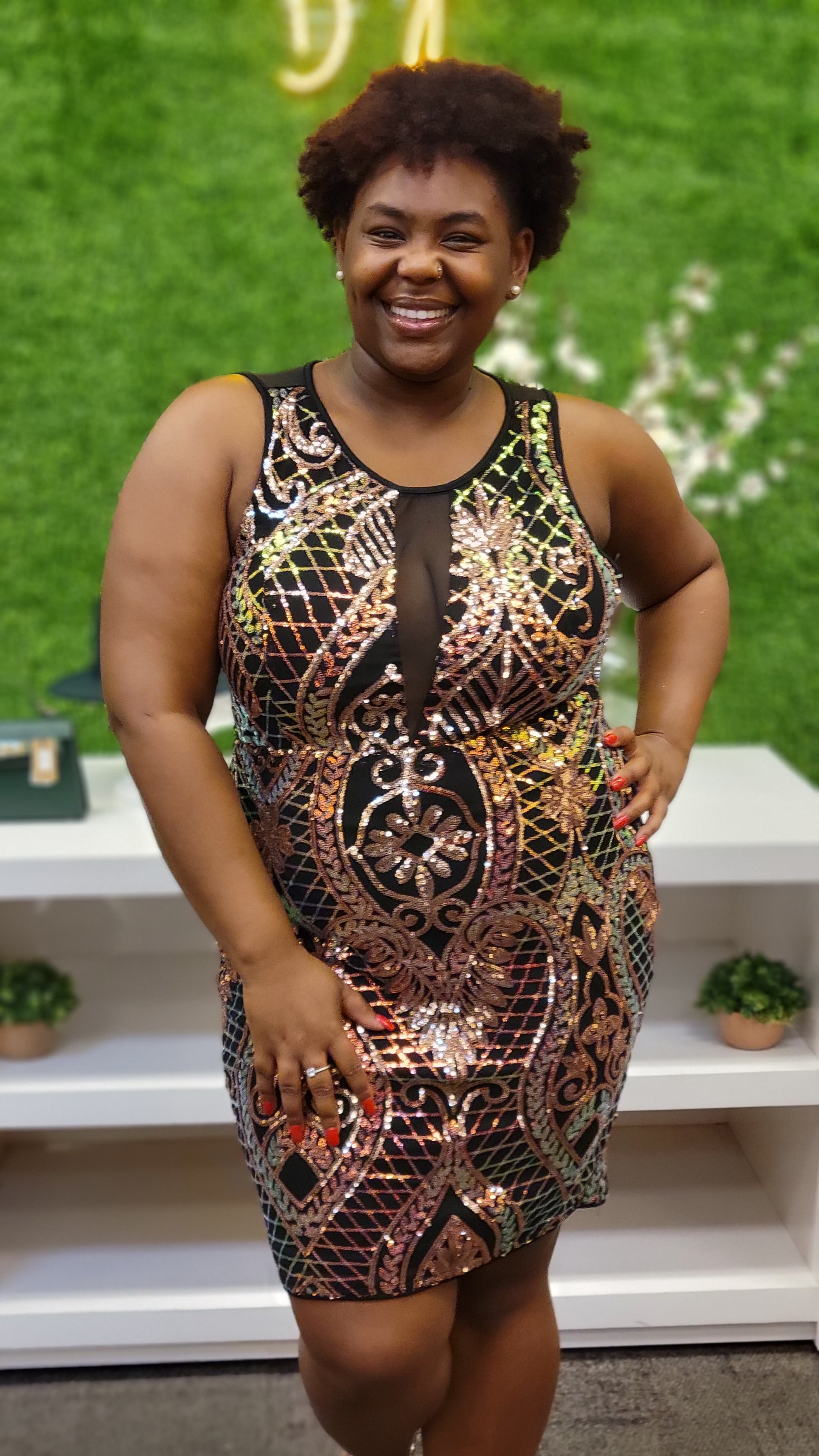 This sleeveless bodycon fit mini dress featuring an allover geometric design with mesh cutout details is great for the holiday, after hours, or birthday parties.
