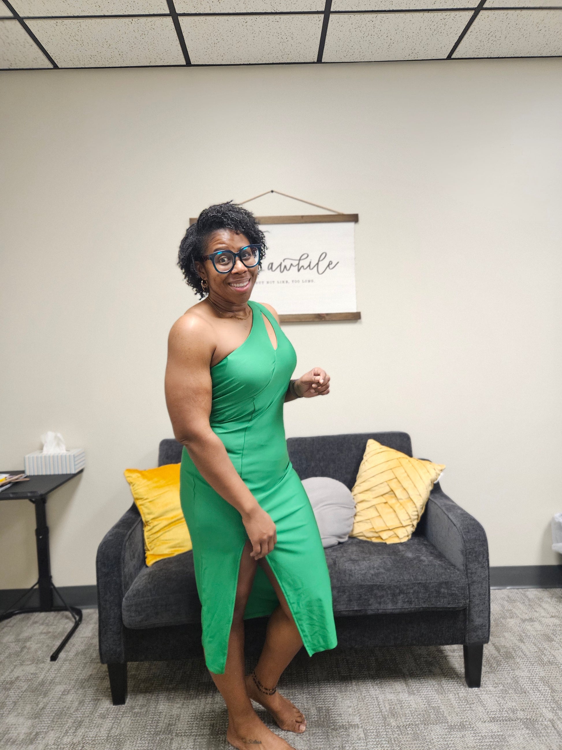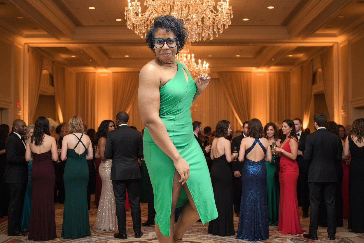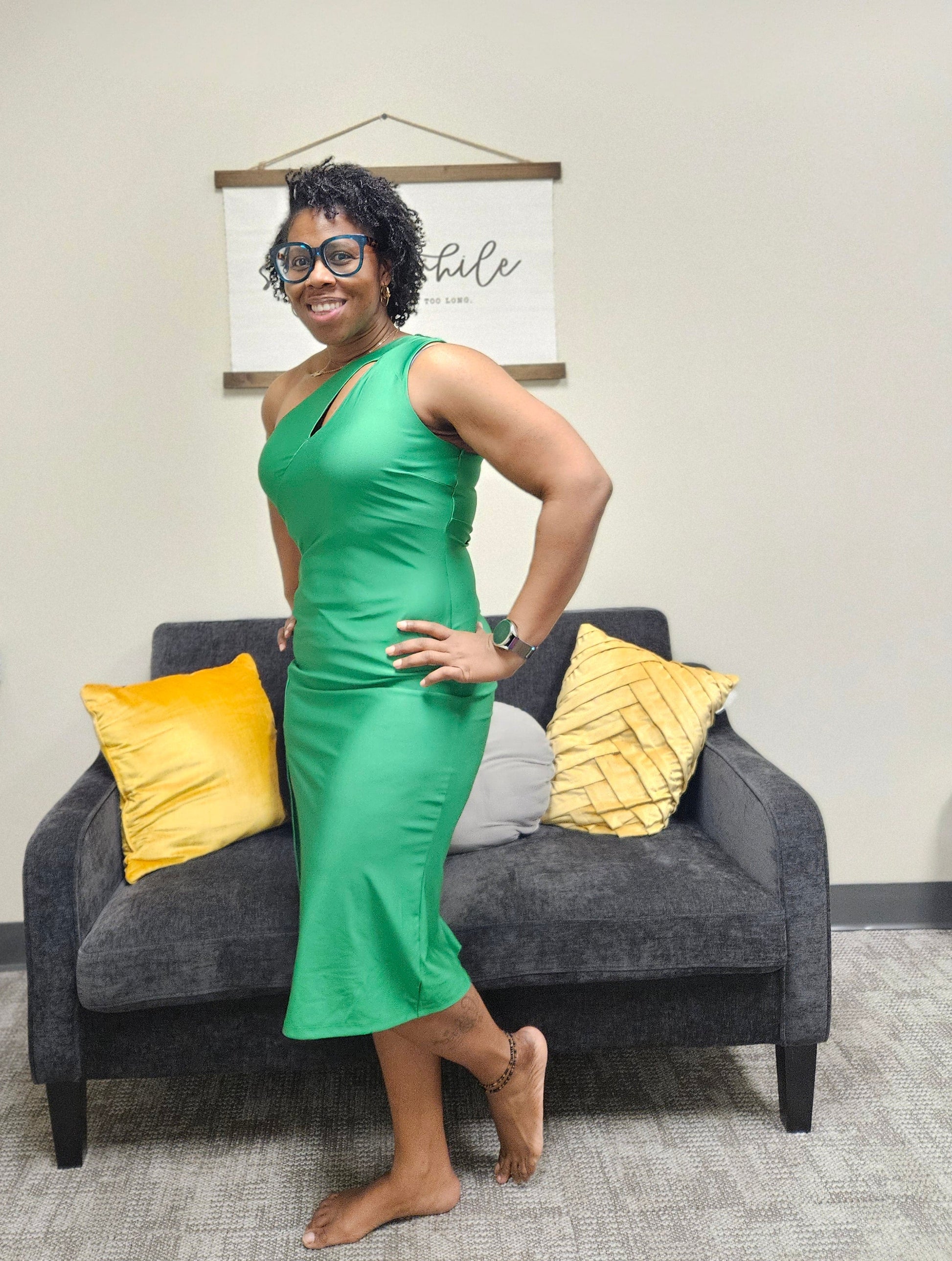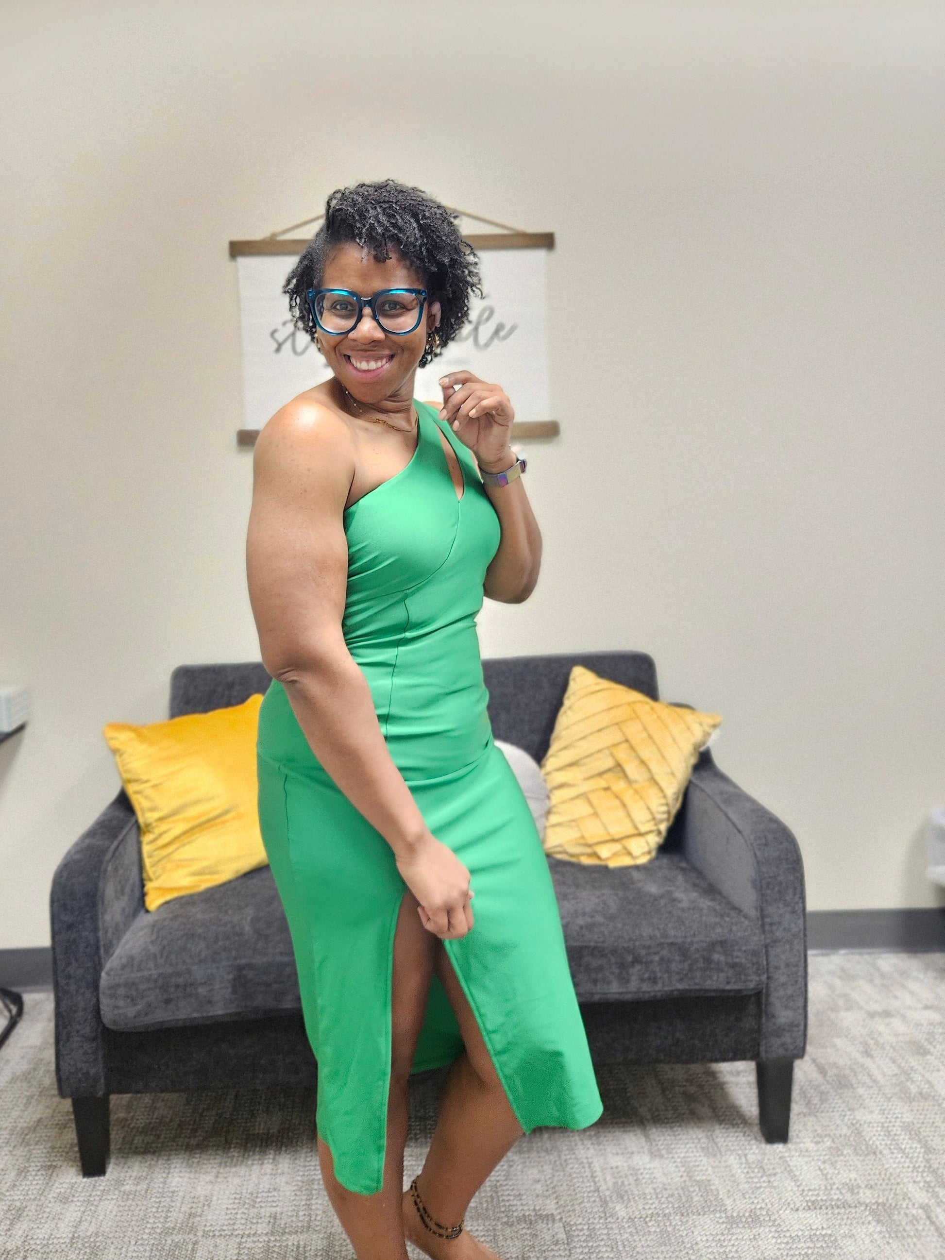 A Western-inspired midi dress and fancy craze fashion featuring a one-shoulder strap, chest cut out, side slit, solid color, and a bodycon silhouette.