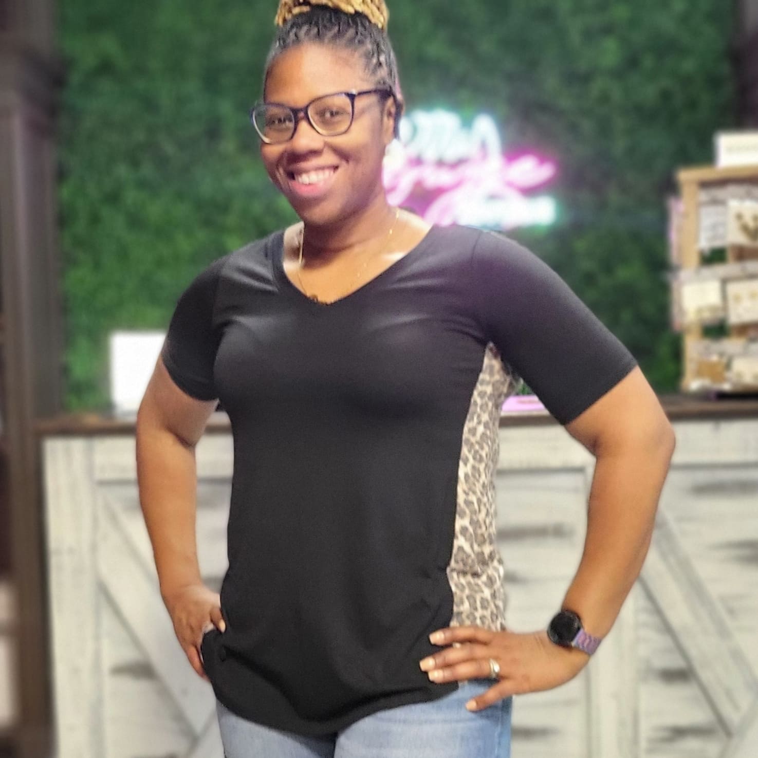 Stand out with Katina's Leopard V-Neck Top featuring a playful contrast side panel.