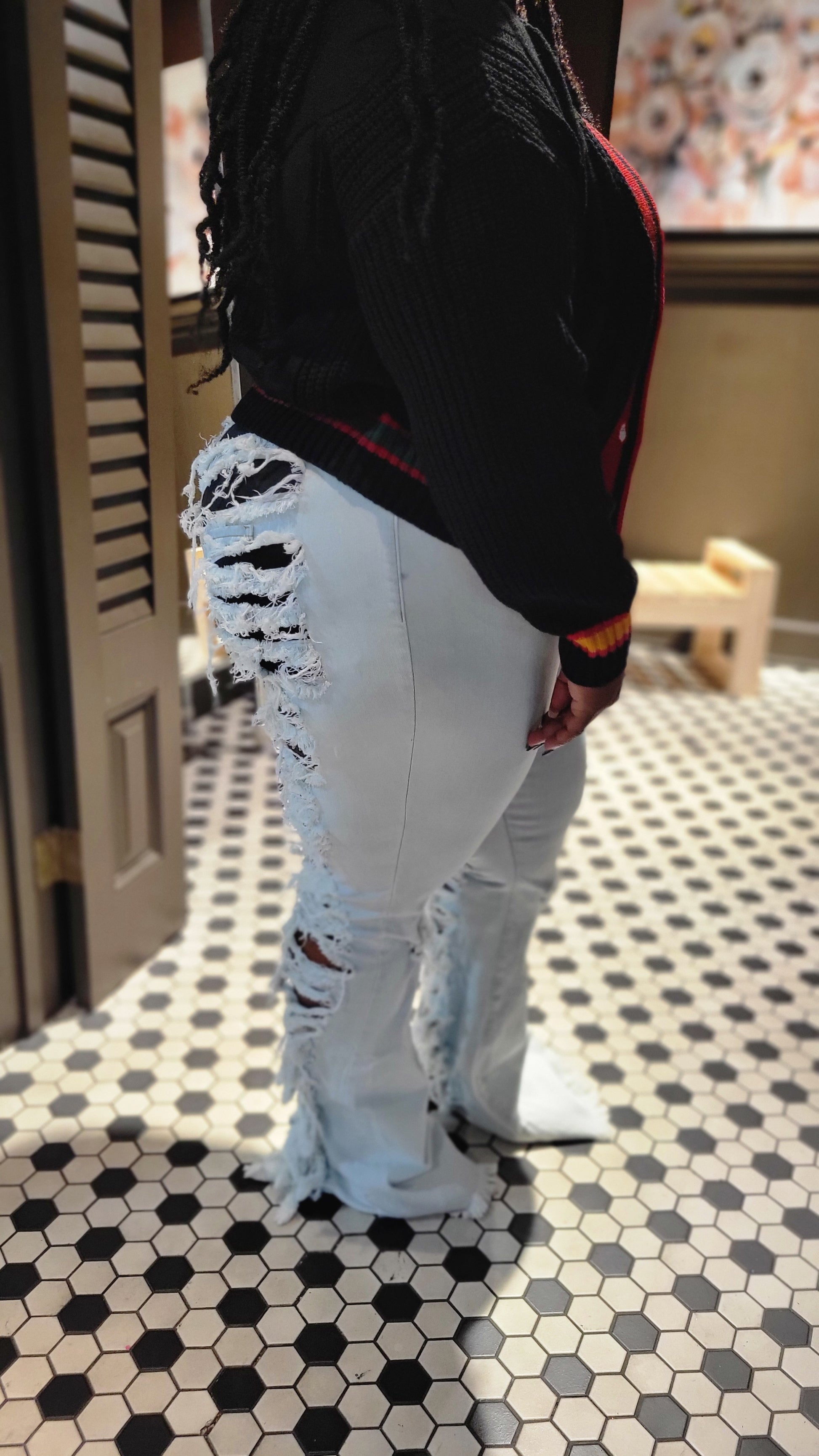 distressed frayed edge denim pants with button waist closure.