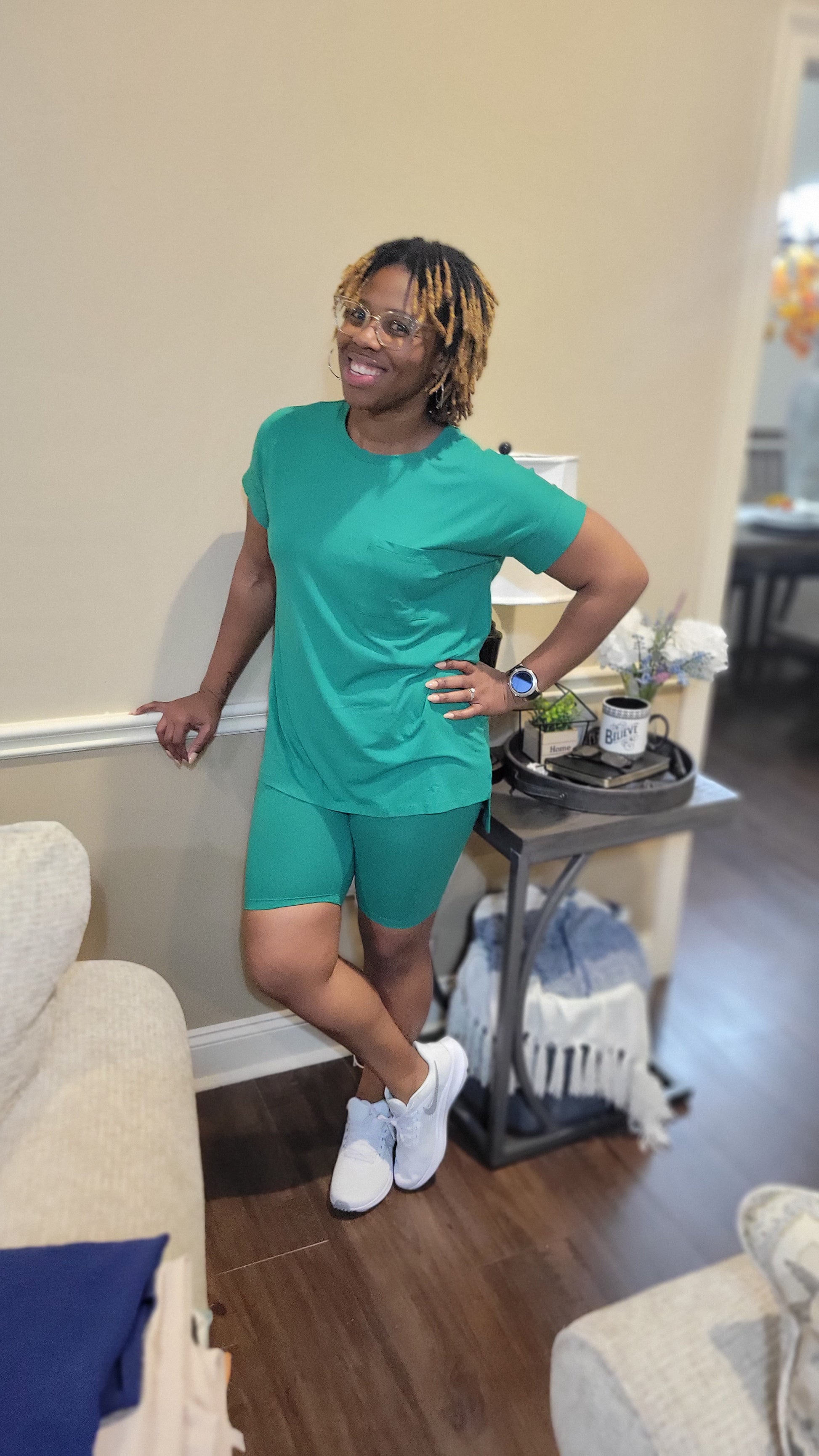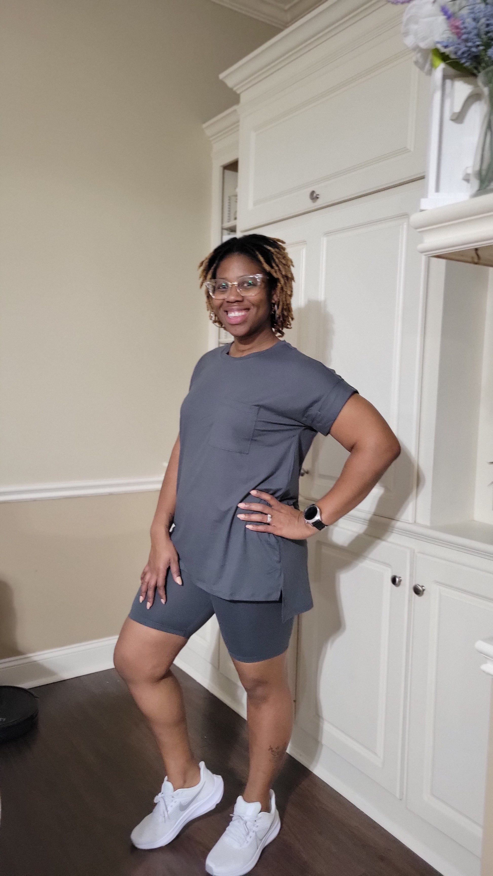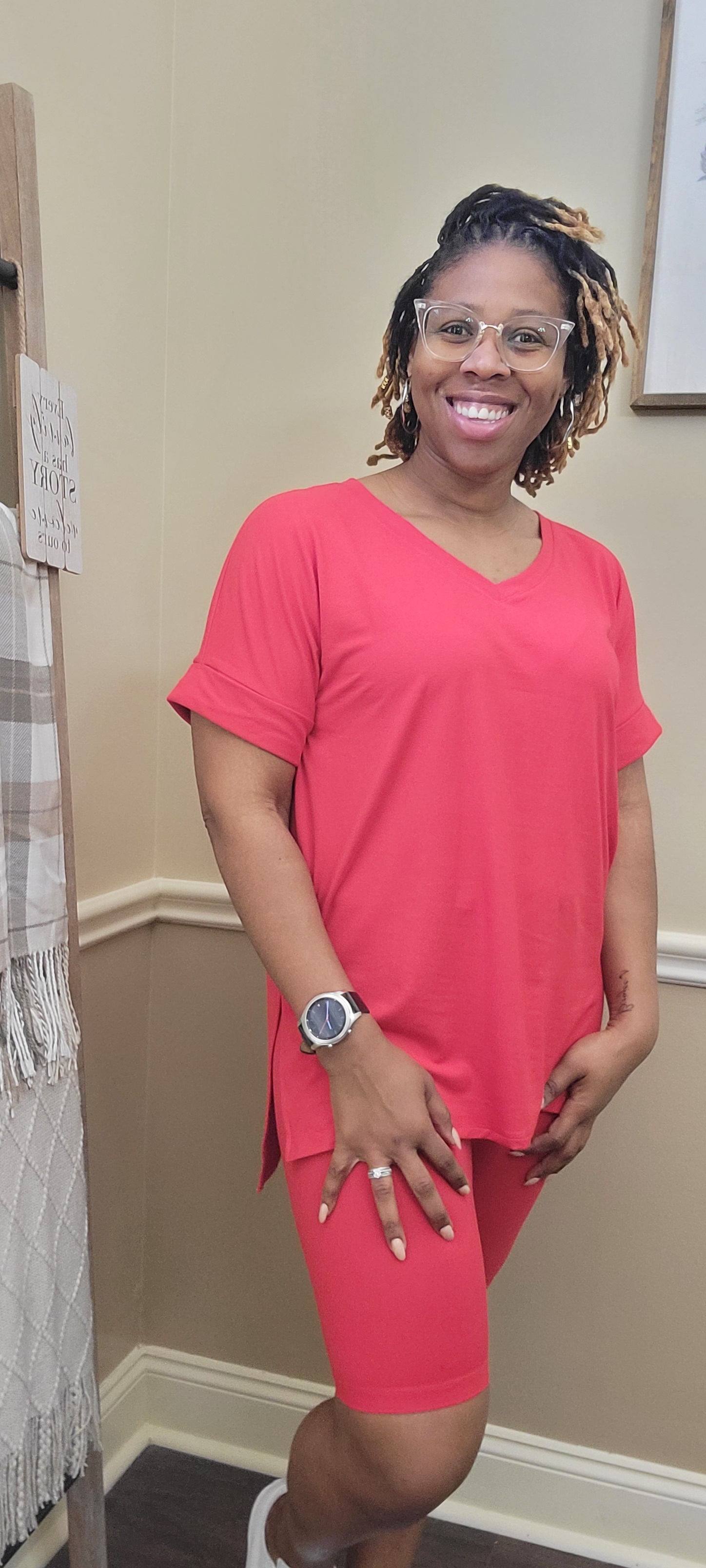 round neck Luxuriously soft, DTY-brushed short-sleeve top with side slits and coordinating hi-low hem biker shorts.