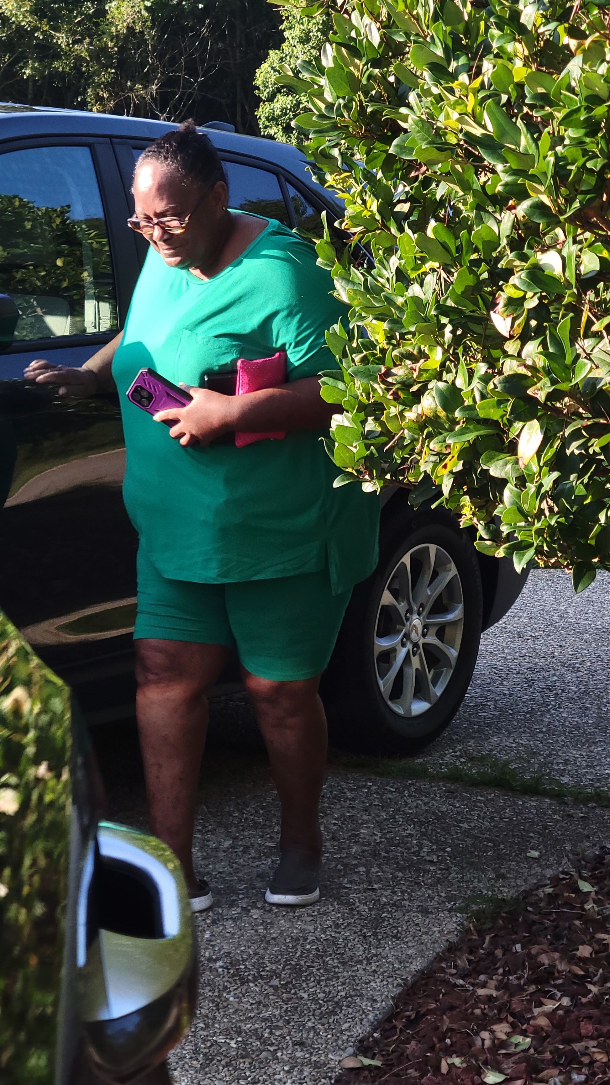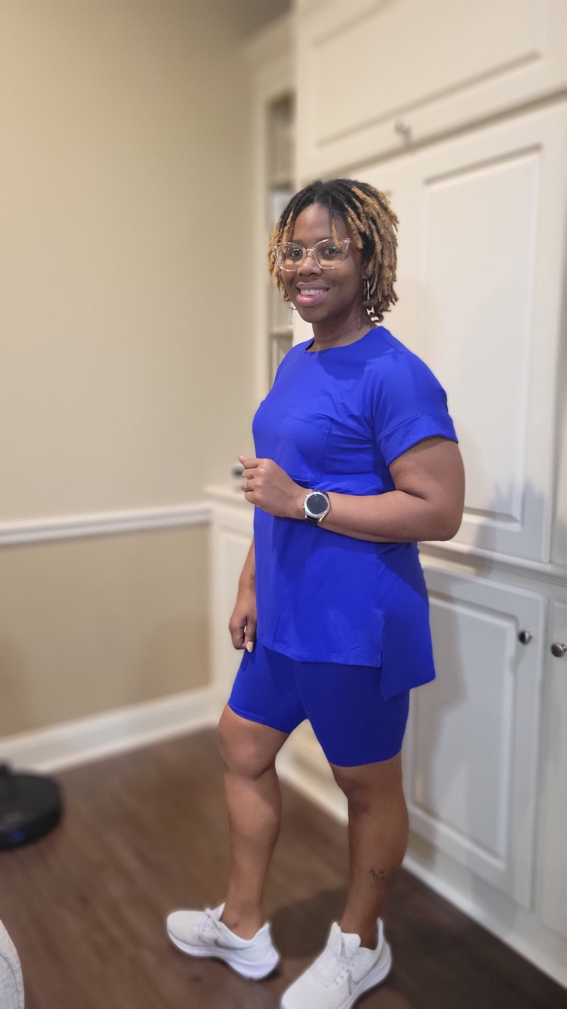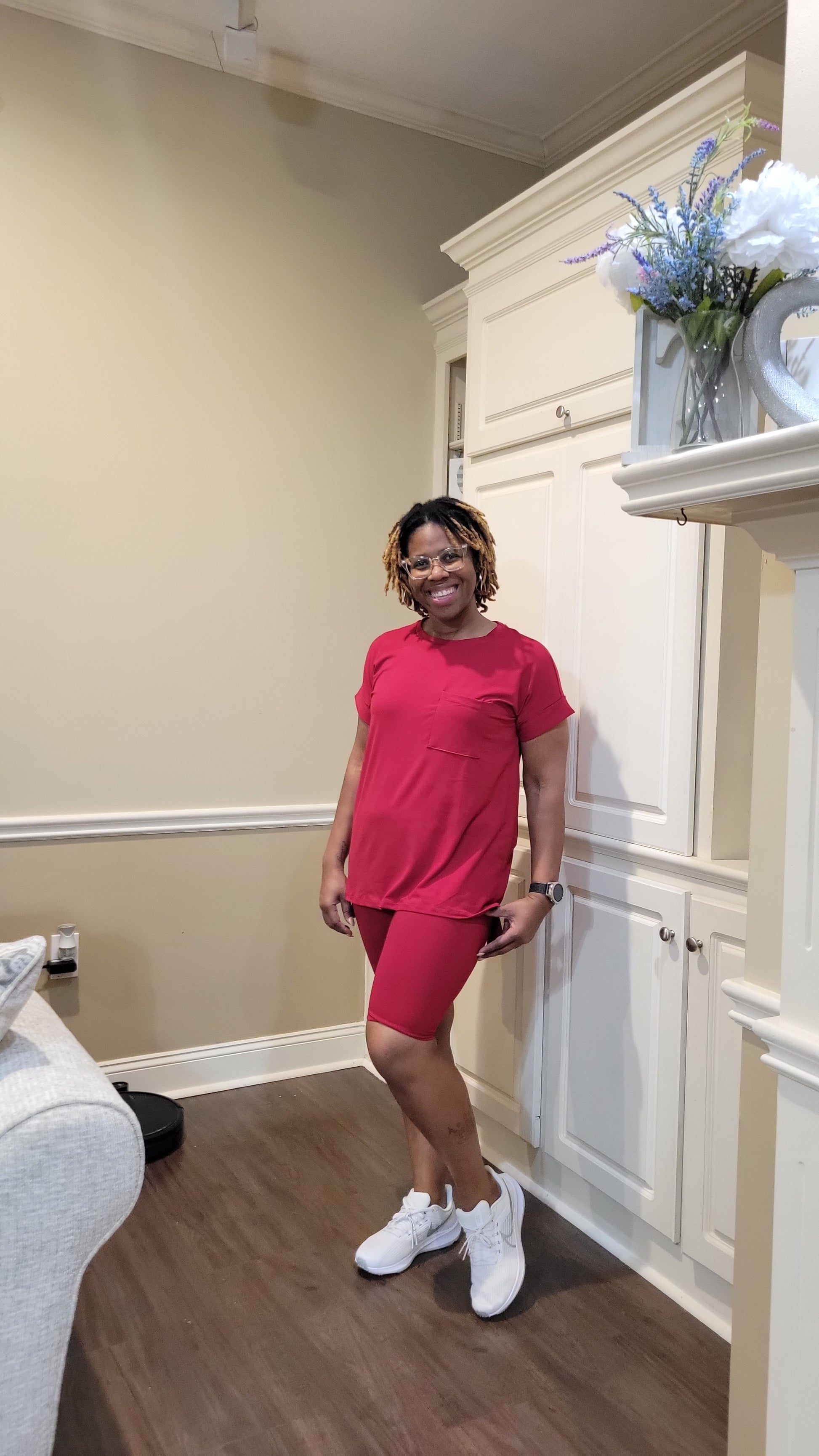 round neck Luxuriously soft, DTY-brushed short-sleeve top with side slits and coordinating hi-low hem biker shorts.