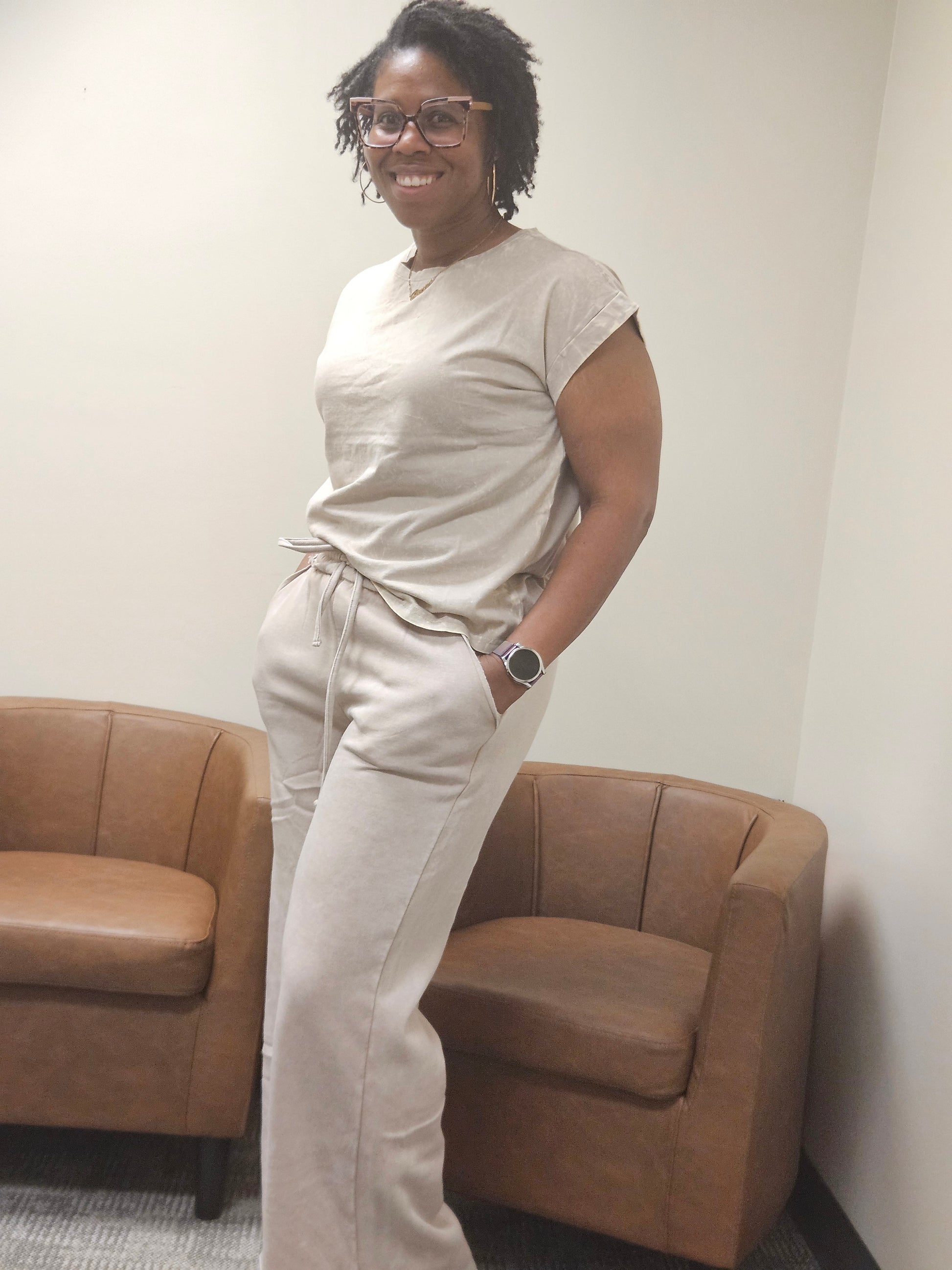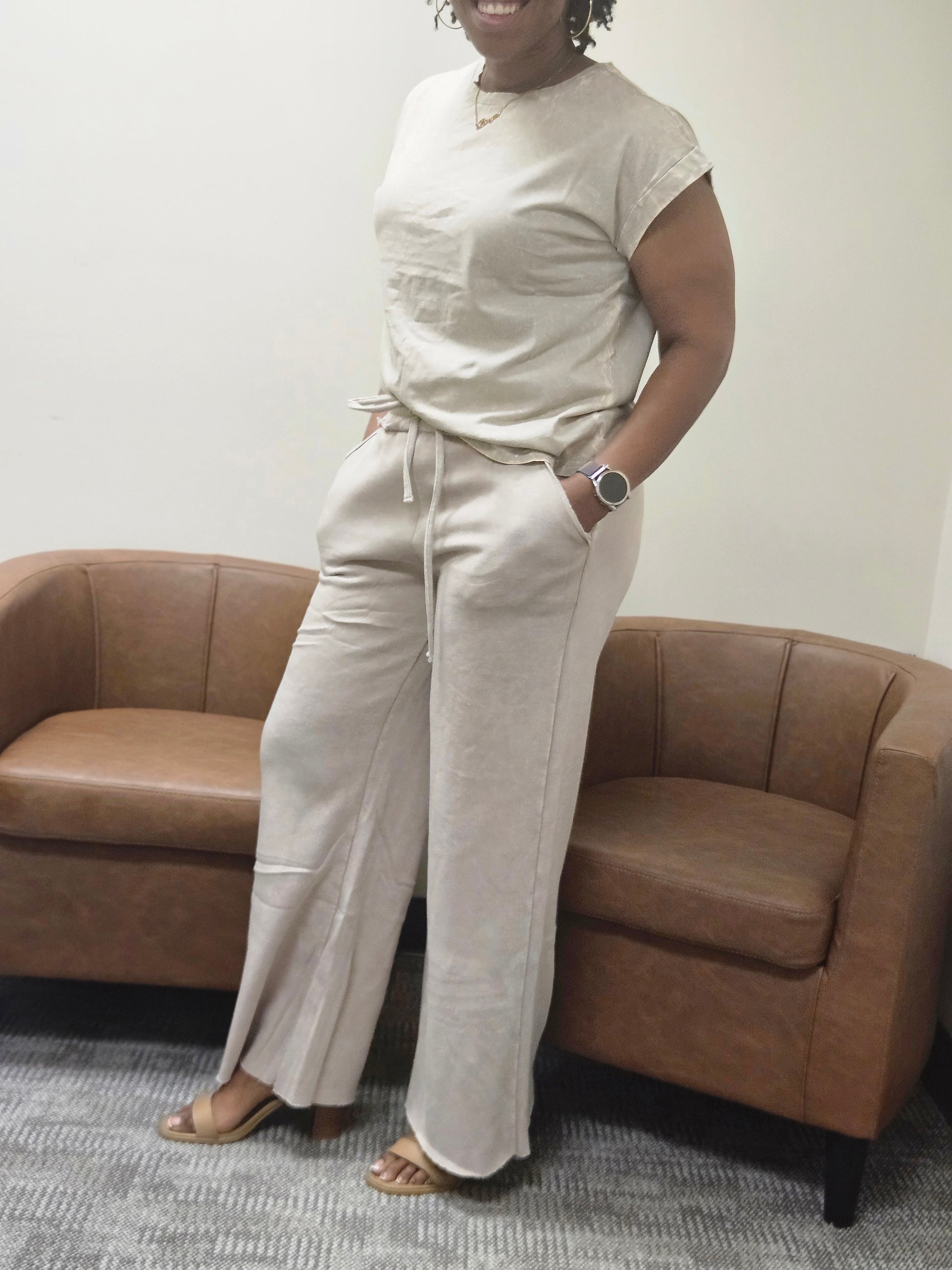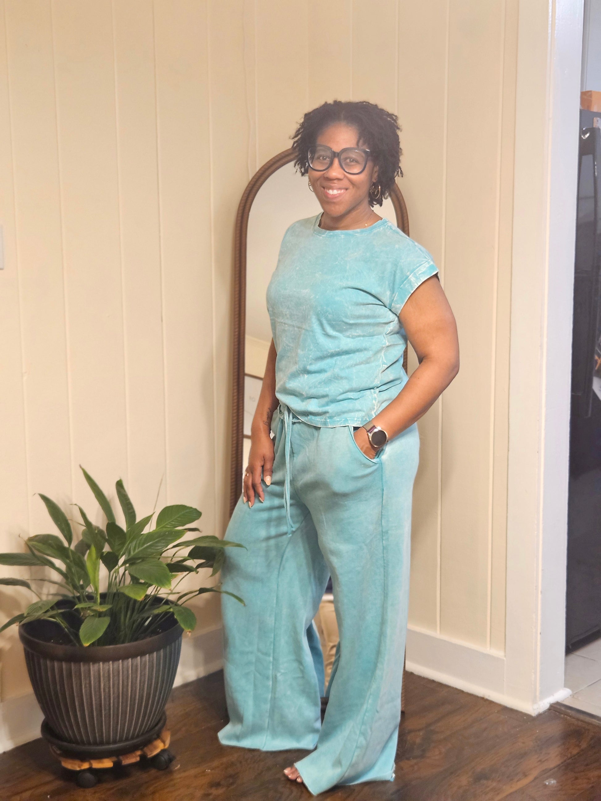 This 2-piece set includes a crinkle-washed, round-neck, folded short-sleeve tee and acid-wash fleece palazzo sweatpants with pockets, drawstring band waist, pockets and raw hem